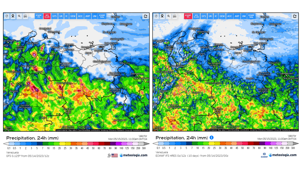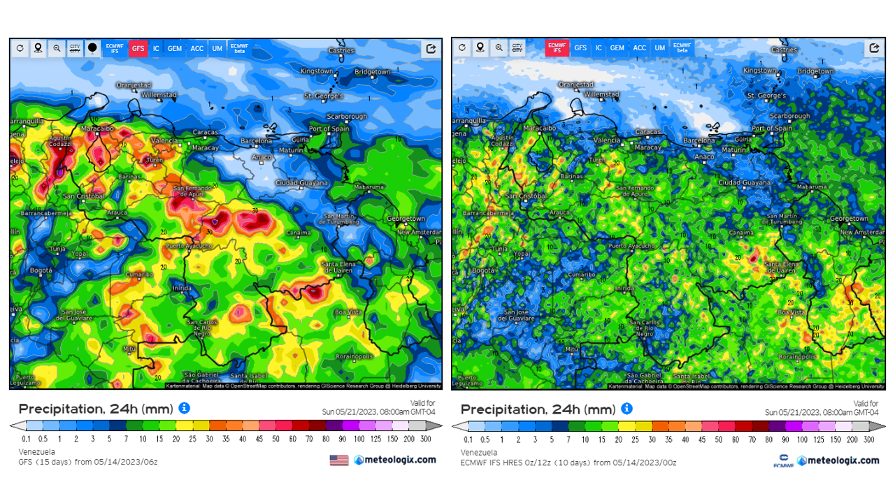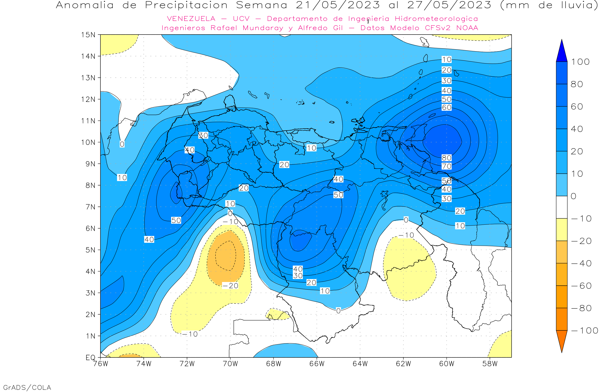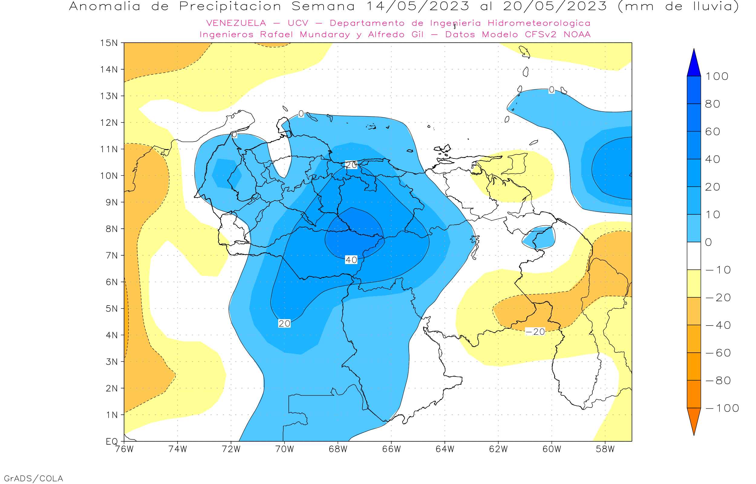 Pronostico de Anomalías Semanales para Venezuela, del 14/05 al 10/06/2023, usando datos del Modelo CFSv2 de NOAA y ECMWF.