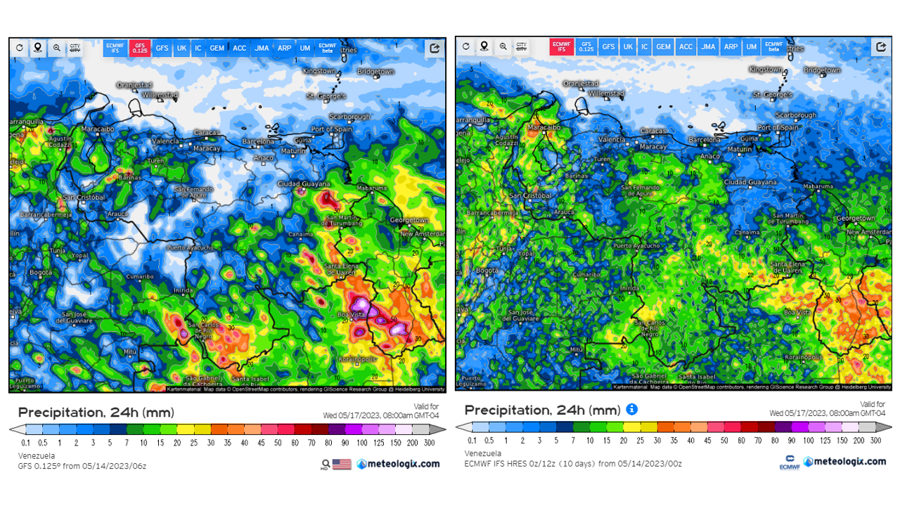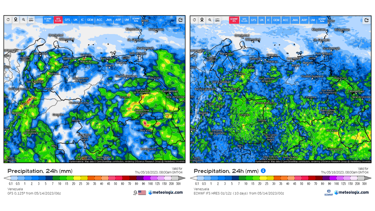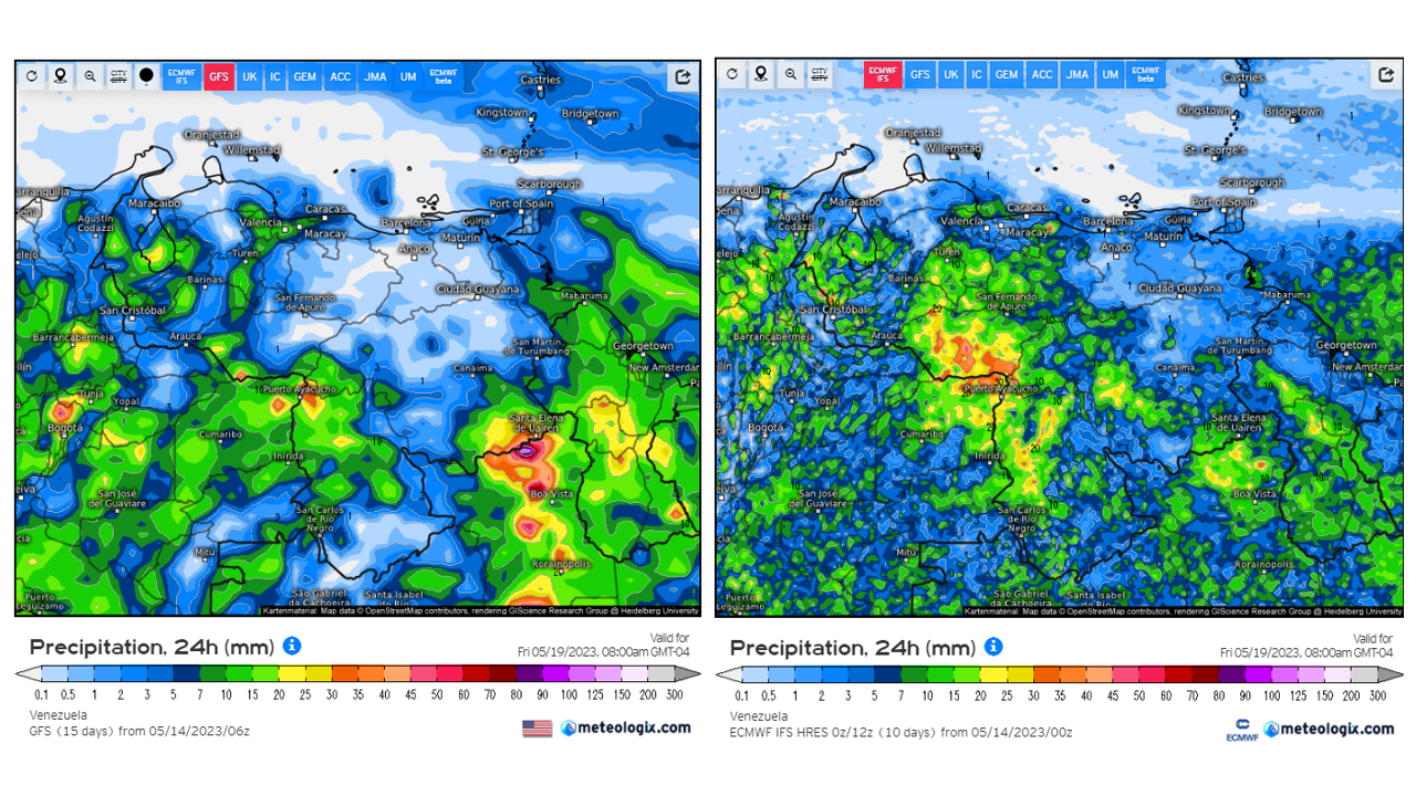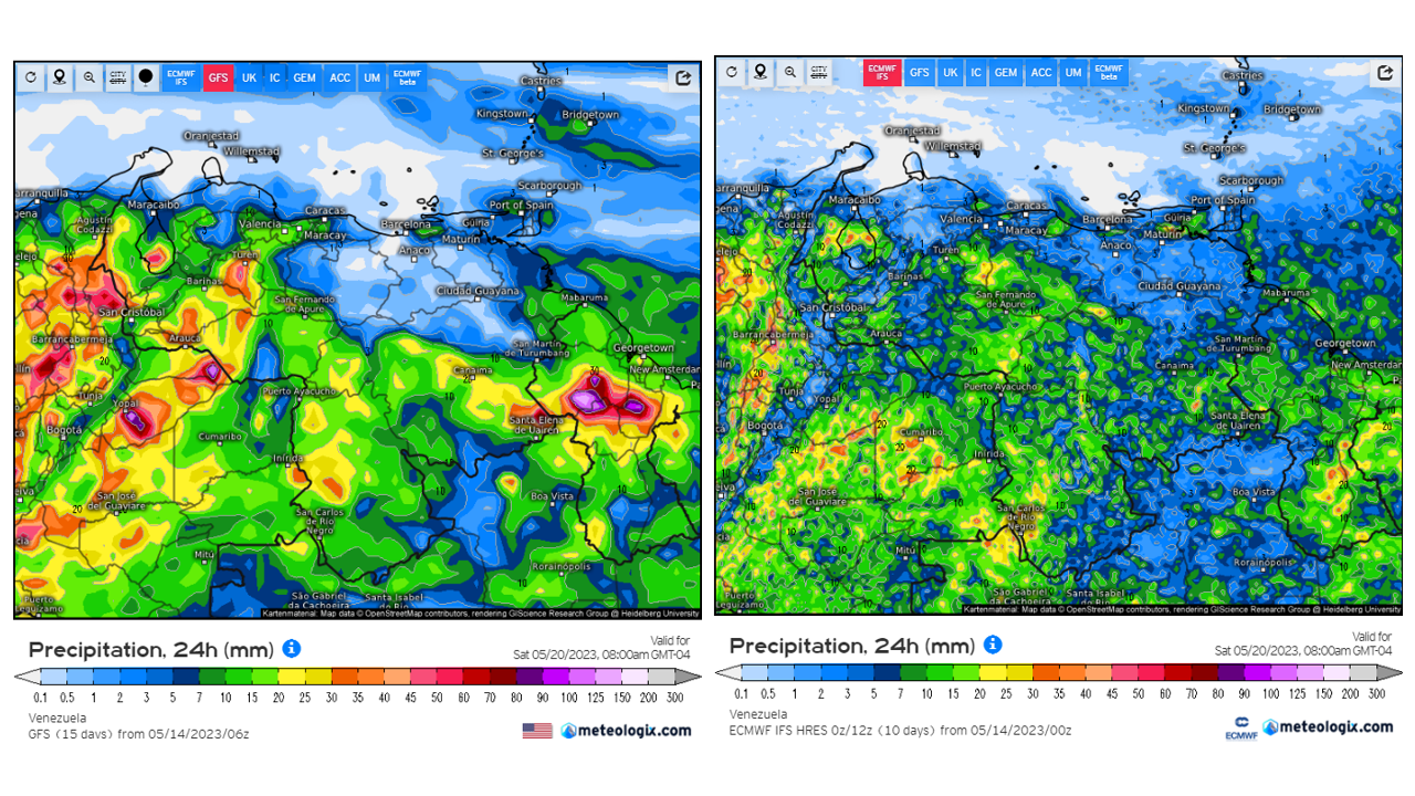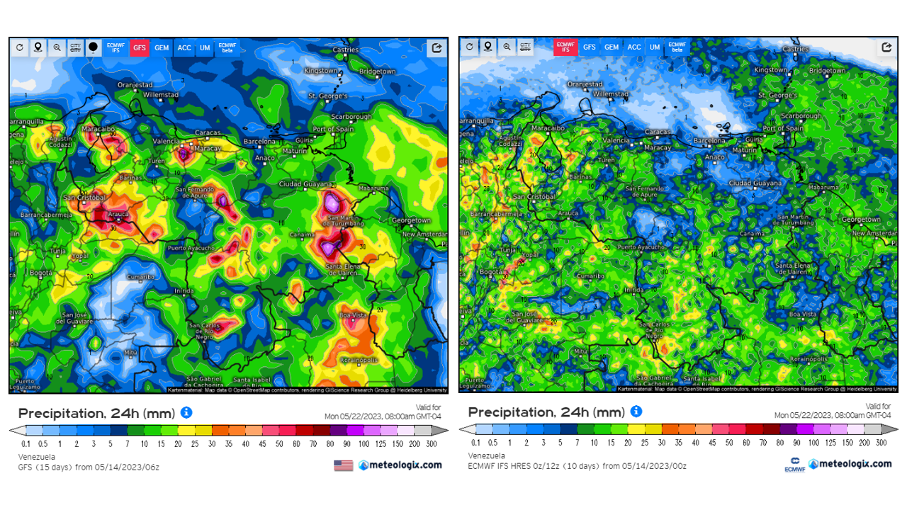Pronostico de Anomalías Semanales para Venezuela, del 14/05 al 10/06/2023, usando datos del Modelo CFSv2 de NOAA y ECMWF.