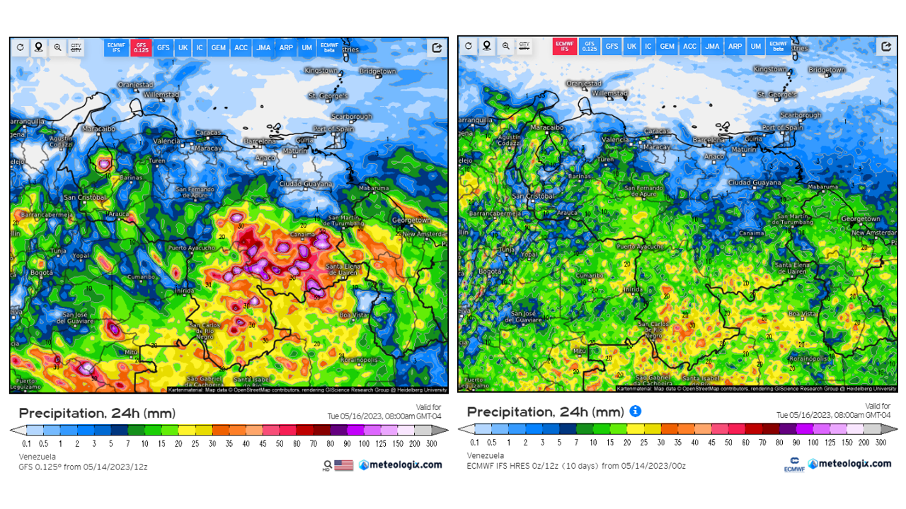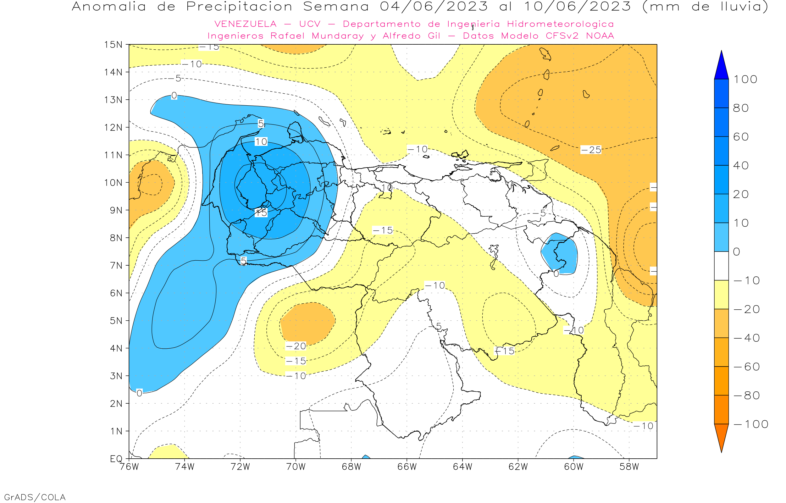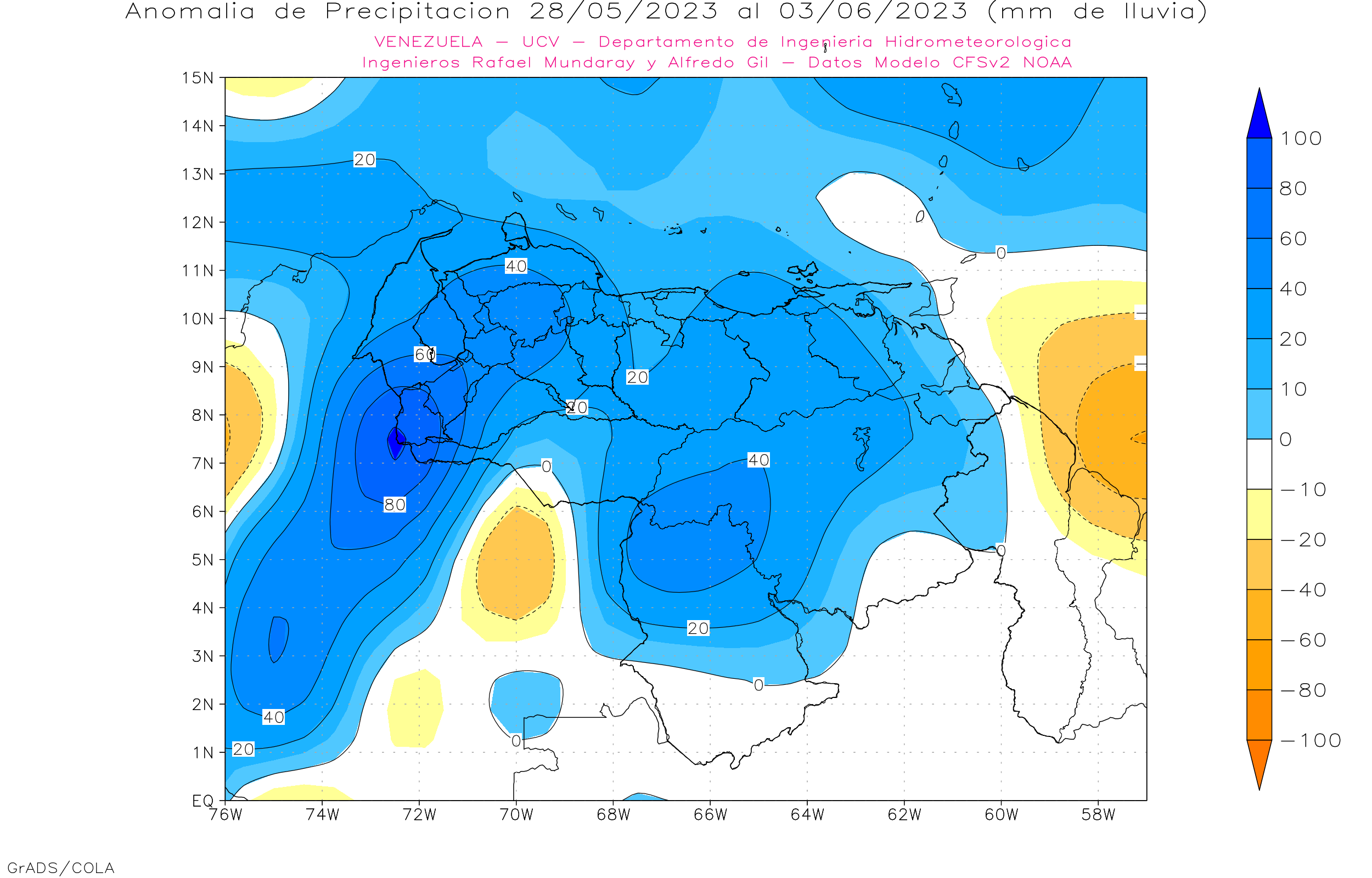 El modelo GFSv2 prevé en general eventos de precipitaciones dentro del promedio histórico en casi todo el territorio nacional. Las anomalías positivas mas importantes en el ostes de Zulia, Guárico, este de Apure. y sureste de los estados Portuguesa y Cojedes