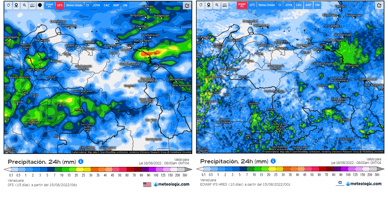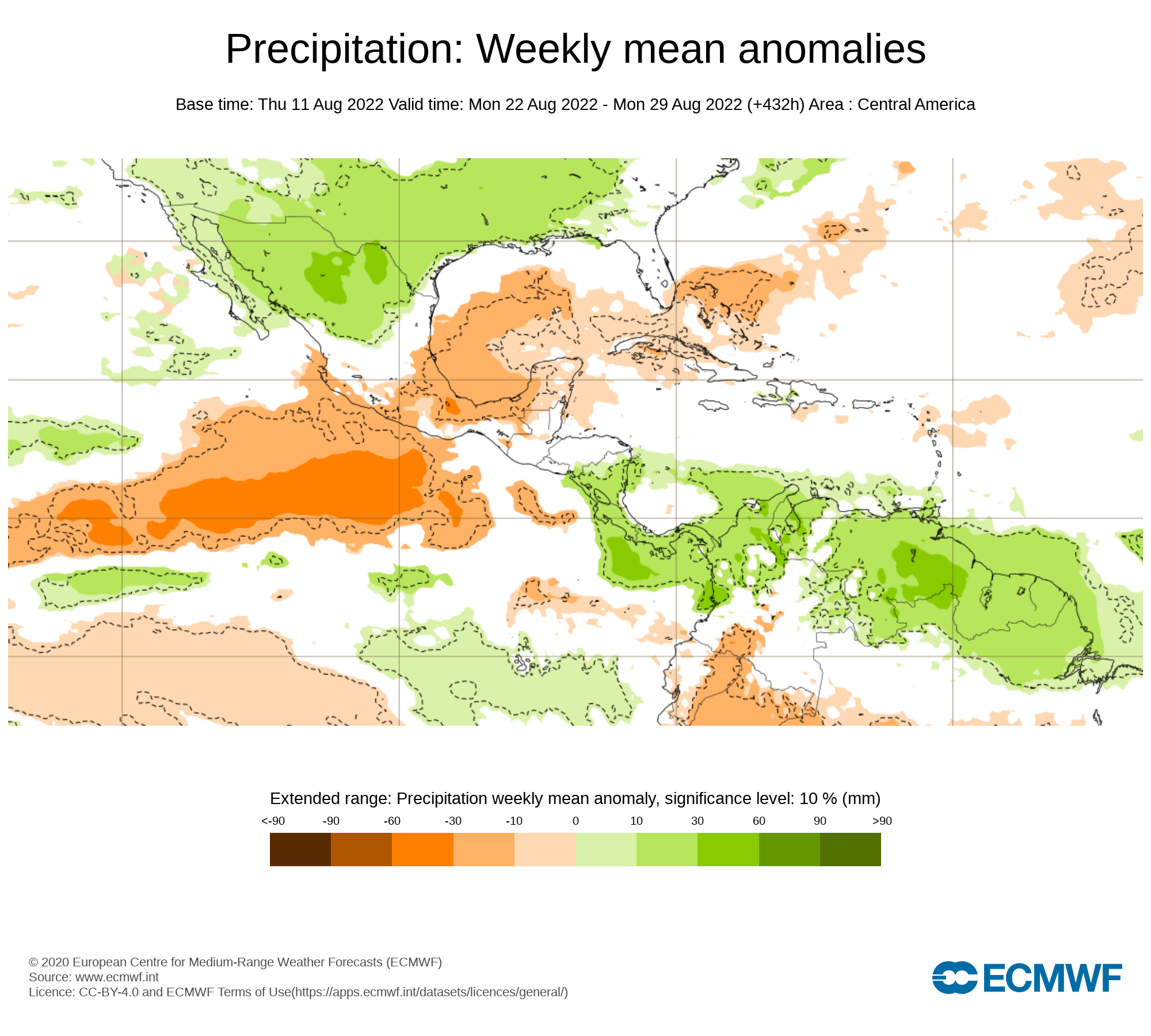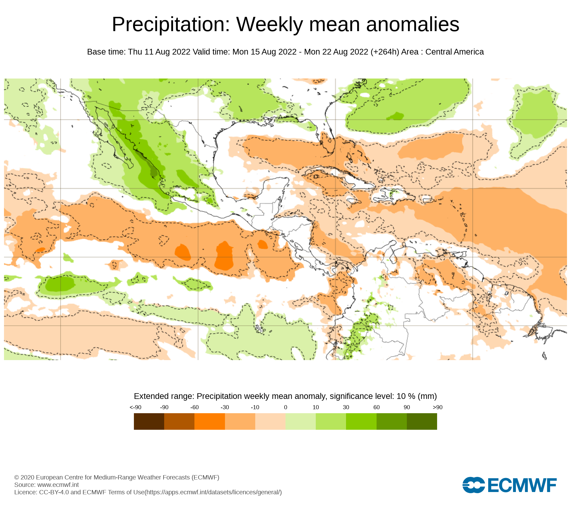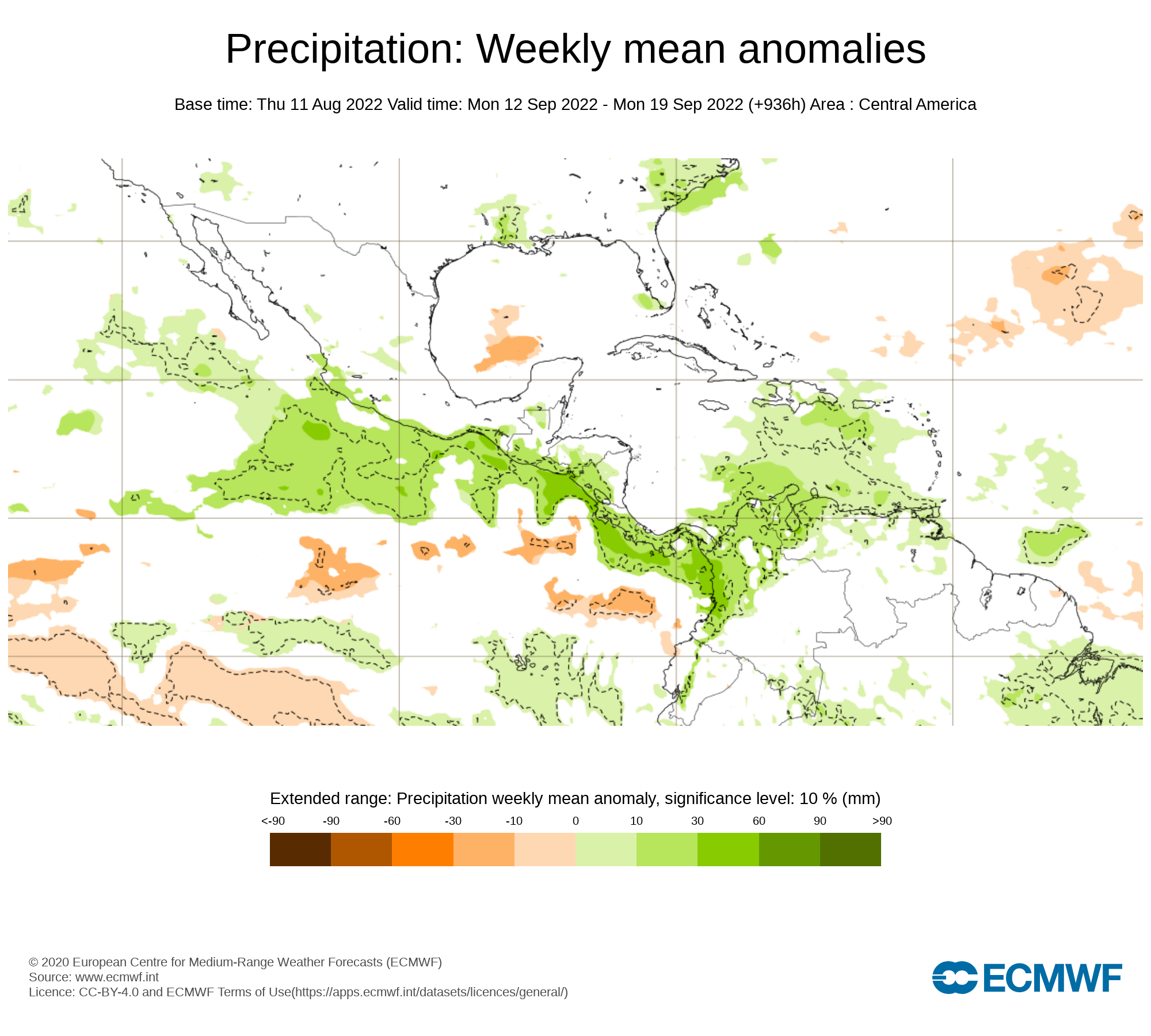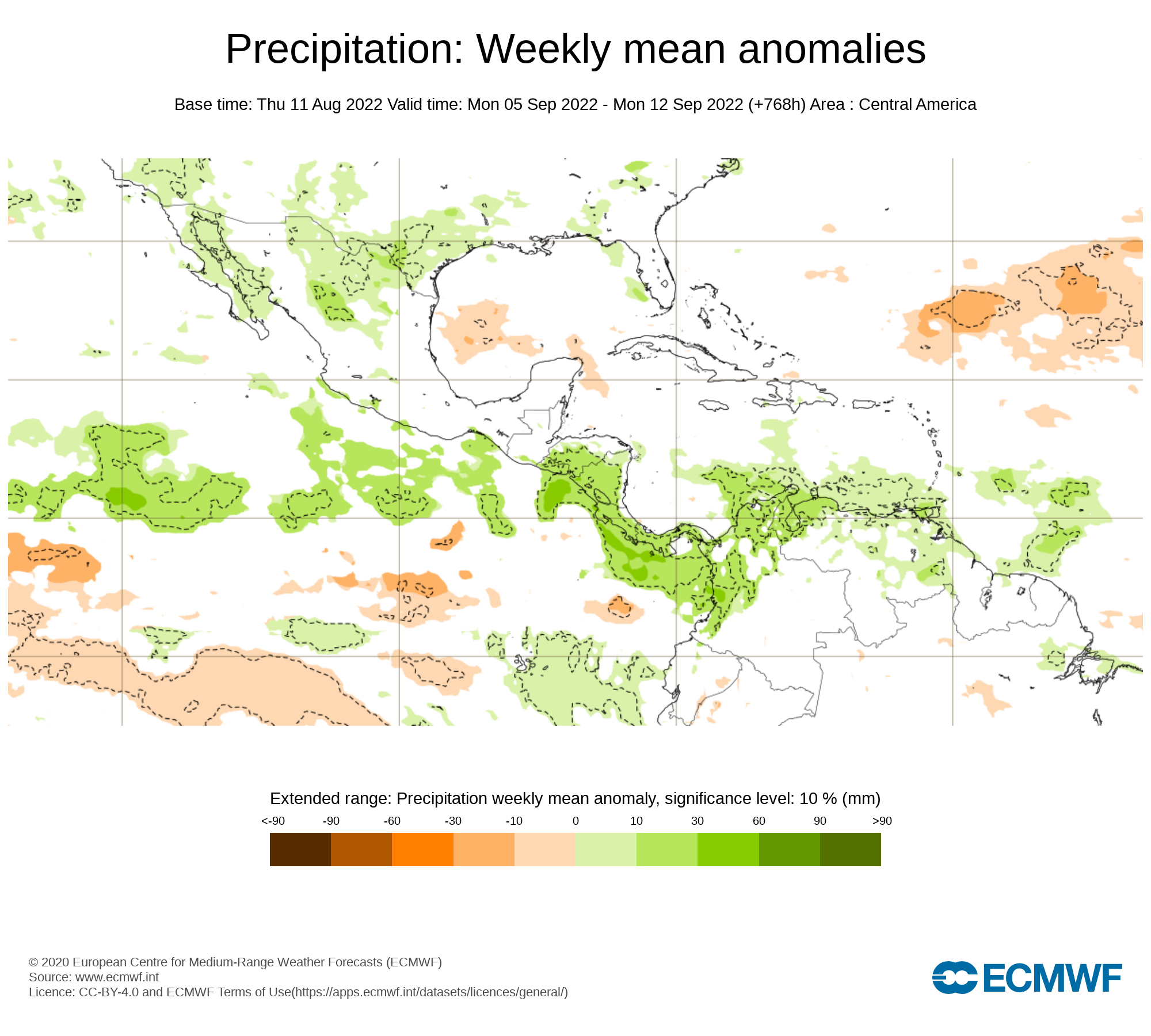 El pronostico semanal emitido por European Centre for Medium-Range Weather Forecast (ECMWF), se esperan eventos de precipitaciones  promedio sobre el territorio nacional, las anomalías mas importantes se esperan en  los andes,  Falcón, Anzoátegui, Sucre, Monagas, Amazonas y Bolívar.