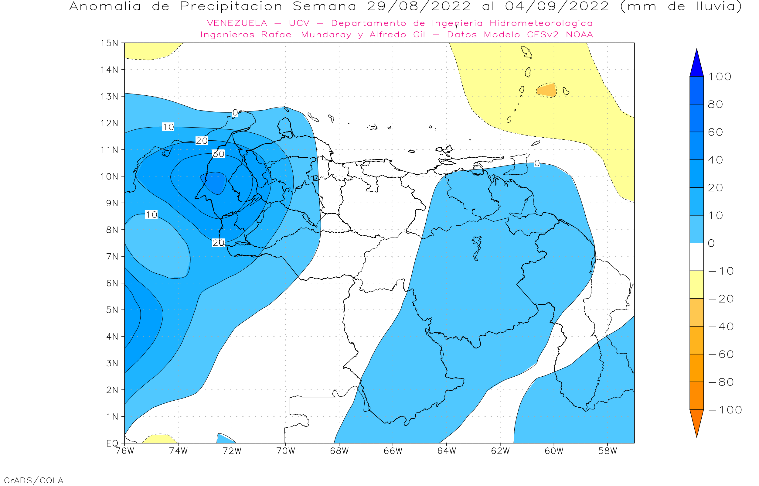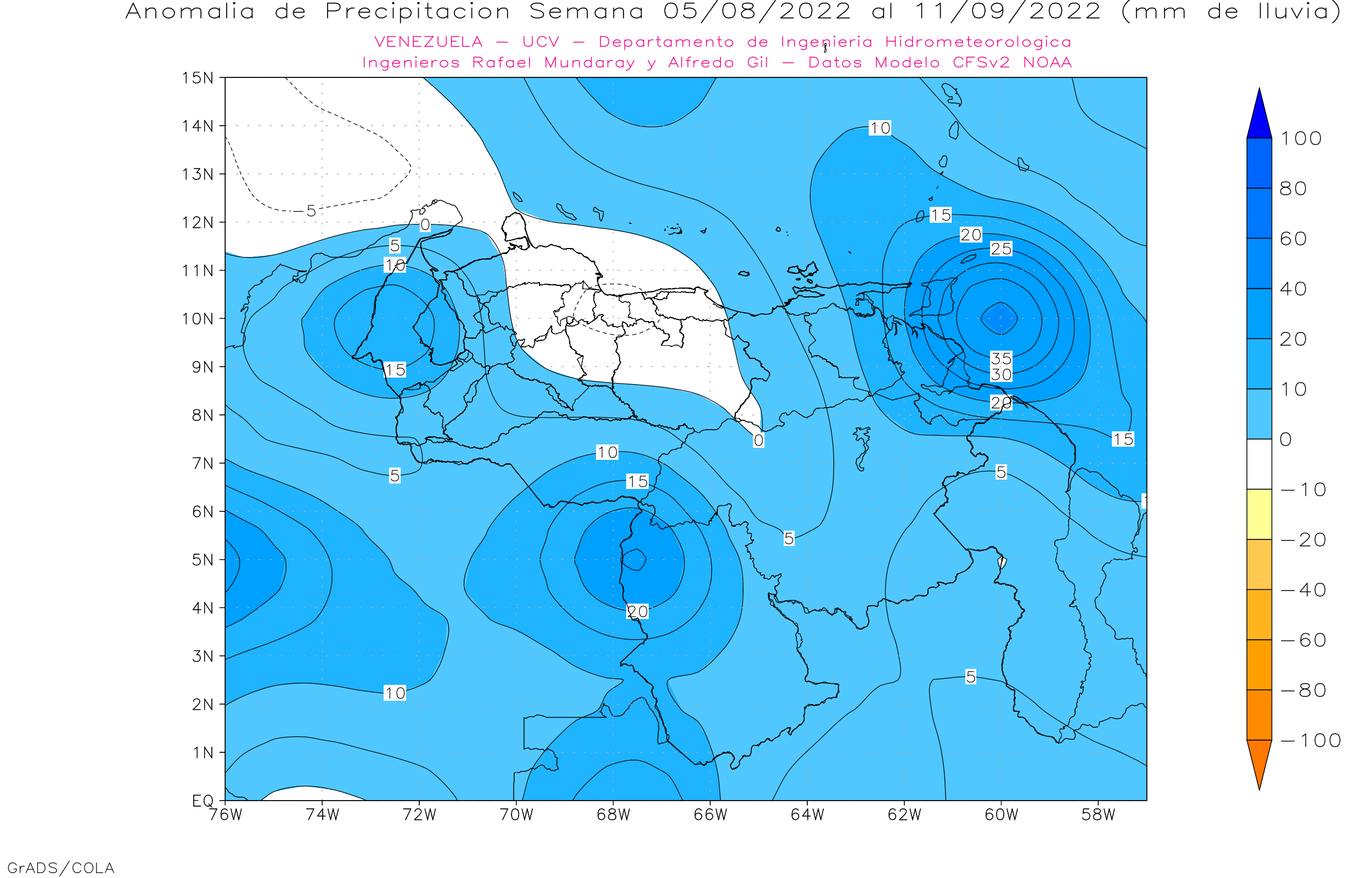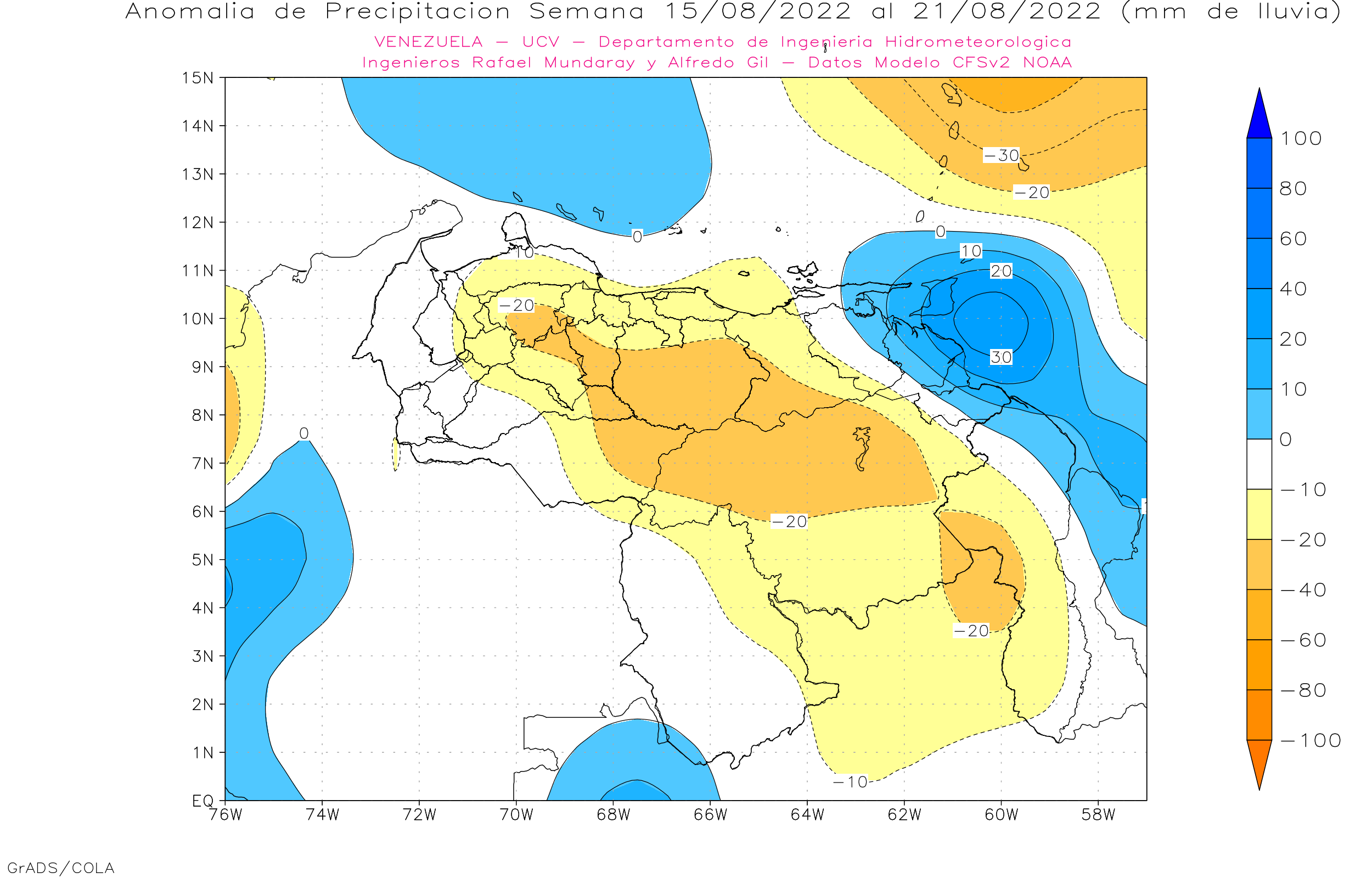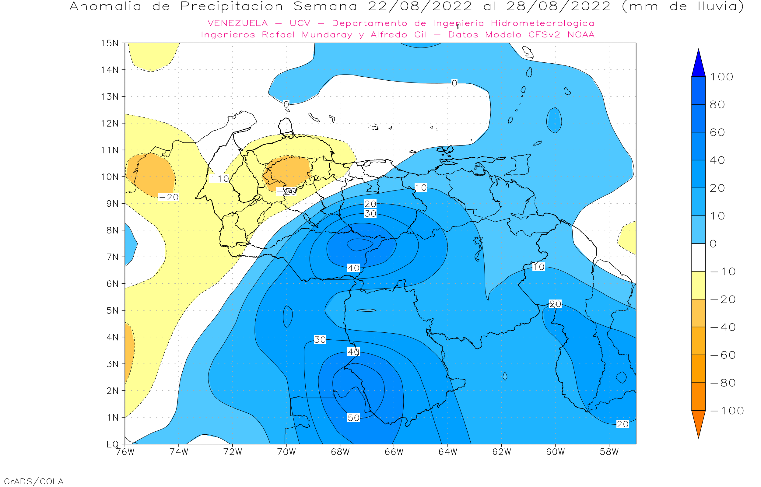 El modelo GFSv2 prevé en general eventos de precipitaciones dentro del promedio histórico en casi todo el territorio nacional. Las anomalías positivas mas importante se esperan  este  de los estados Sucre y Delta Amacuro. Las anomalías negativas mas importantes en Guárico, Cojedes, este de los estados Barinas y Apure, y norte de Bolívar