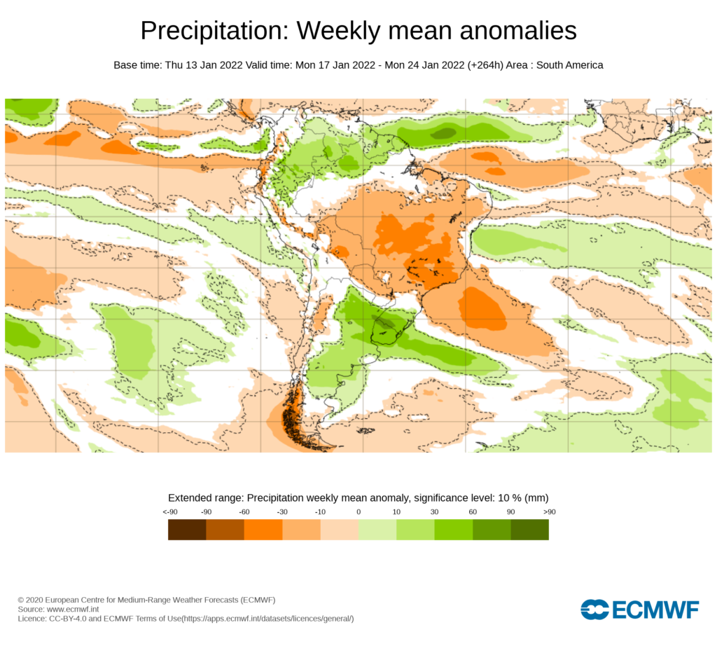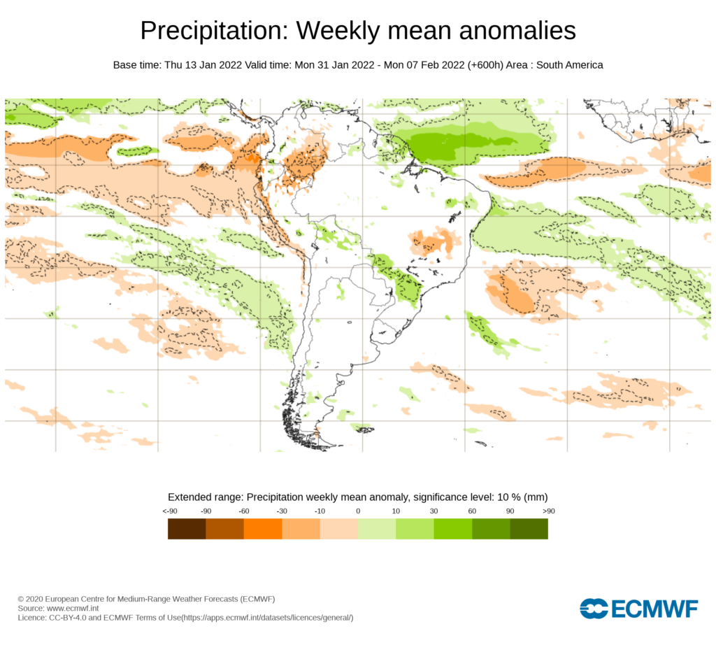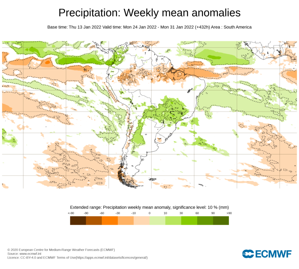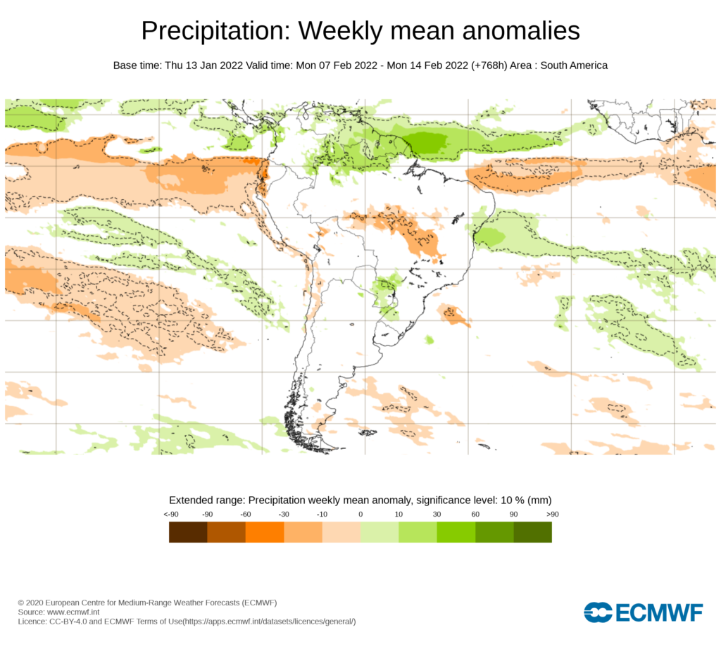 El pronostico semanal emitido por European Centre for Medium-Range Weather Forecast (ECMWF), se esperan precipitaciones entre promedio y anomalías positivas en los andes.