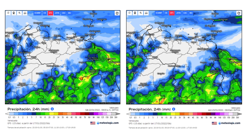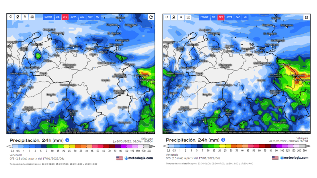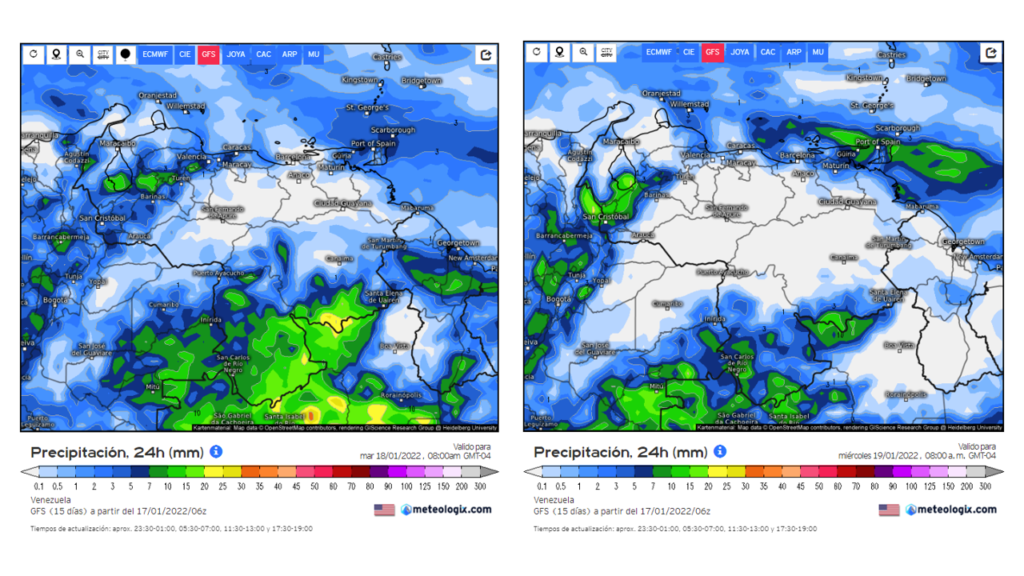 En el pronostico diario del modelo GFS del 17 al 23 de enero, al principio de la semana eventos dispersos a lo largo de la región norte costero, Nueva Esparta, Norte de Delta Amacuro, los andes, sur del lago y sur Bolívar y Amazonas, a mediado y final de la semana los eventos se se deben mantener a lo largo de la franja norte costera, Nueva Esparta, al sur de los estados Amazonas y Bolívar, los andes y sur del lago.