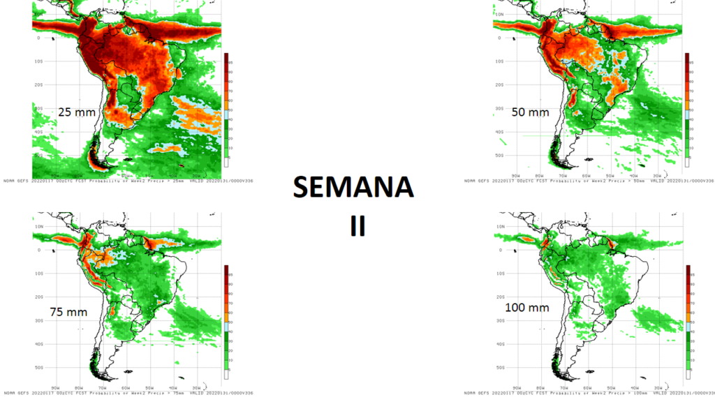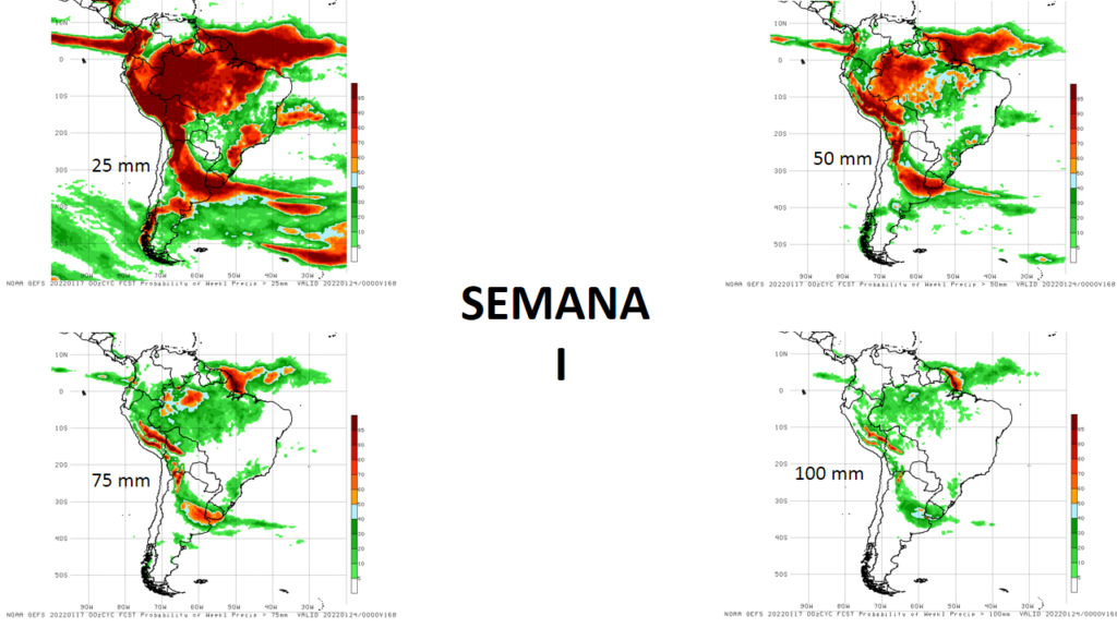Las Probabilidades de excedencia total de precipitación para semana del 17 al 24 de enero, superiores a 25, 50, 75 y 100 mm, se prevé las mayores probabilidades para eventos mayores de 25 mm Bolívar, Amazonas, los andes y Delta Amacuro, la mayor probabilidad de 50 mm sur de los estados Amazonas y Bolívar, para eventos mayores de 75 y 100 mm las probabilidades se reducen y no se observan puntos importantes.
