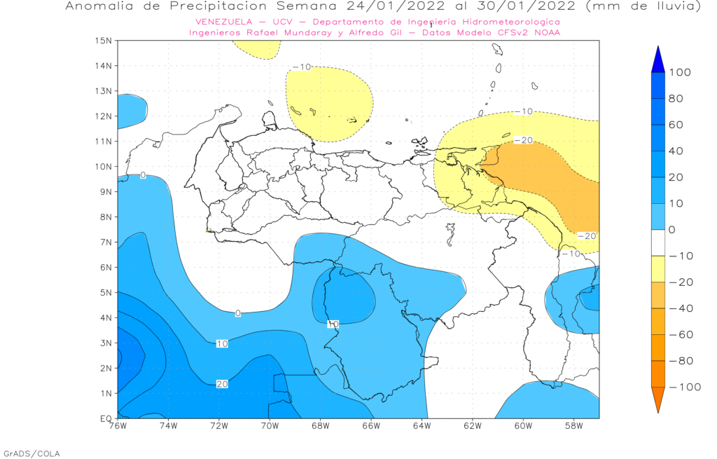 Pronostico de Anomalías Semanales para Venezuela, del 17/01 al 13/02/22, usando datos del Modelo CFSv2 de NOAA y ECMWF.