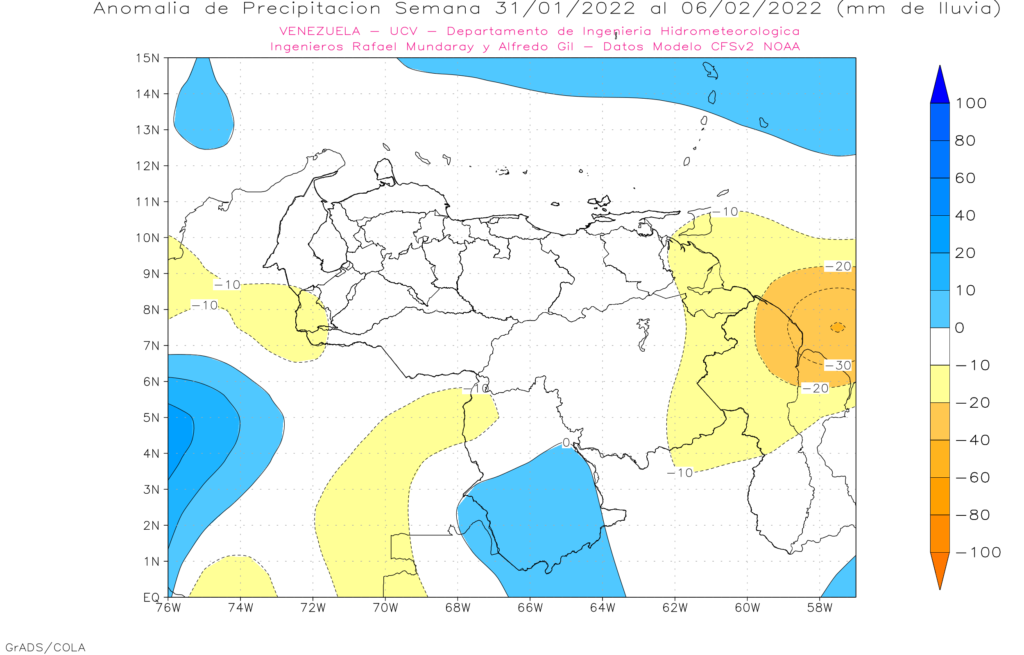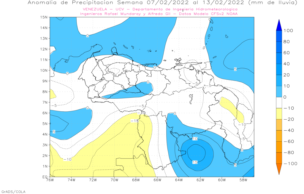 El pronostico semanal emitido por European Centre for Medium-Range Weather Forecast (ECMWF), se esperan anomalías positivas importantes en Amazonas, sur de Bolívar y Apure, el resto del país dentro del promedio histórico.