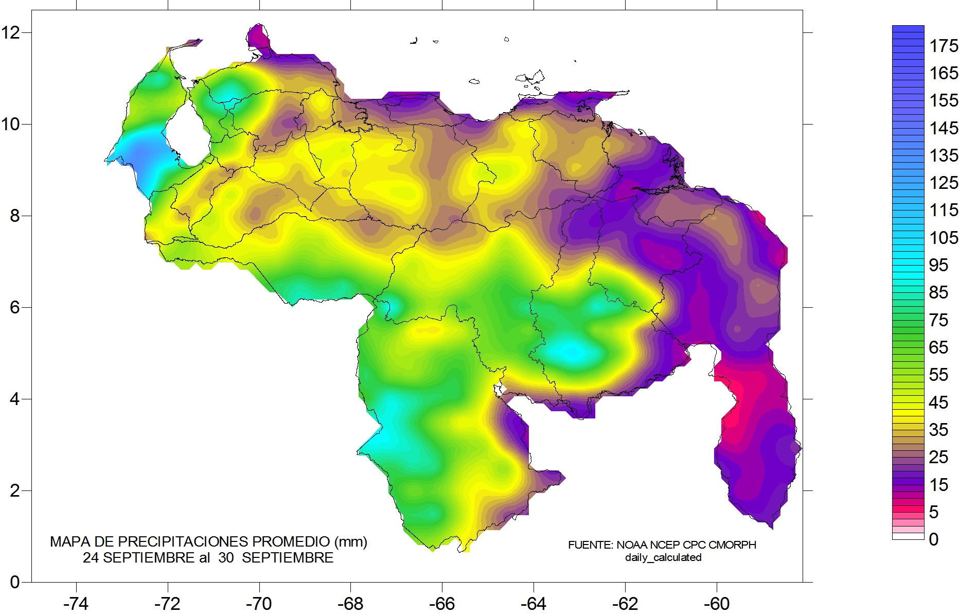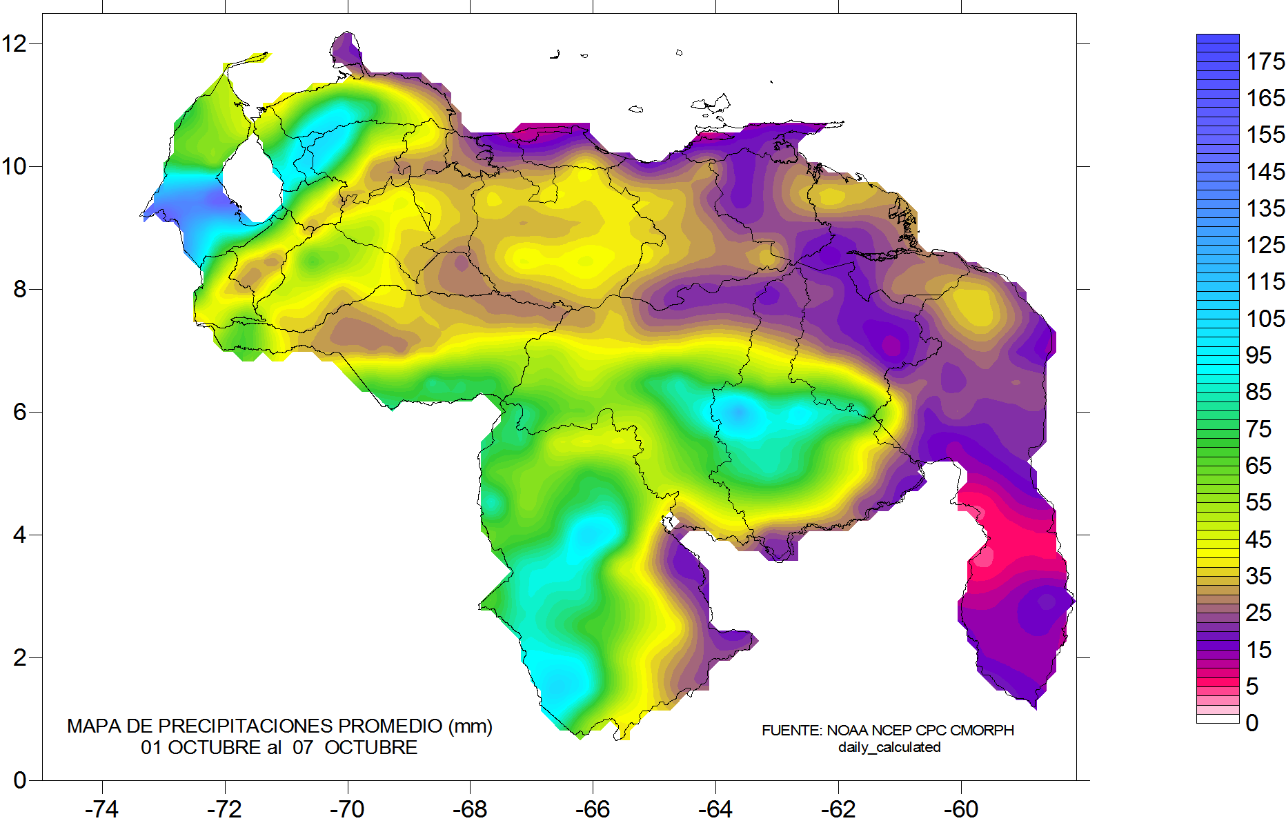 De acuerdo a la estadística de las precipitaciones estimadas para esta semana, se observa que los eventos más importantes se mantiene en las cuencas al sur del río Orinoco, oeste de Bolívar y suroeste de Zulia y la zona con menos totales de precipitación a lo largo de la región norte costera.