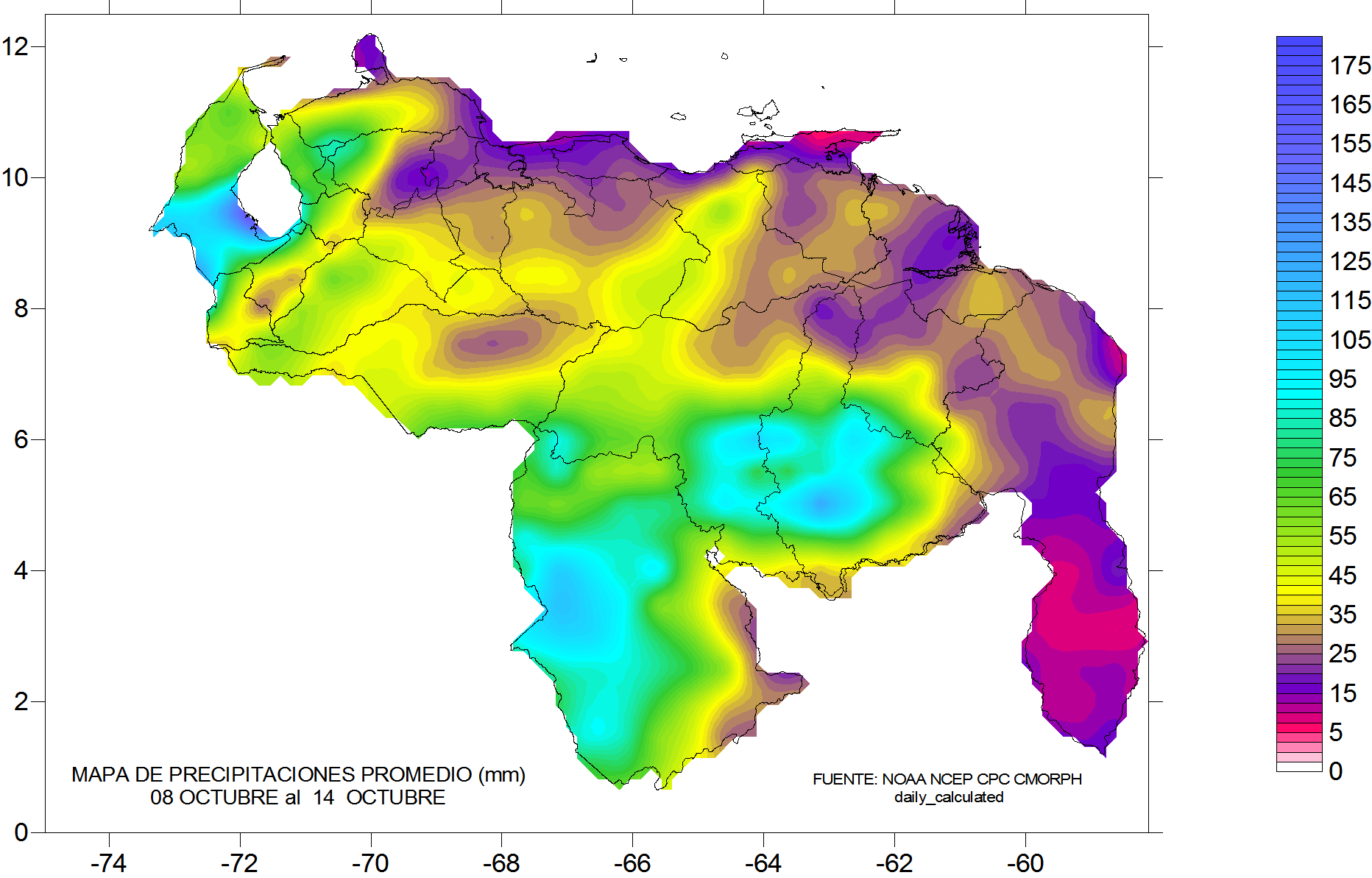 De acuerdo a la estadística de las precipitaciones estimadas para esta semana, se observa que los eventos más importantes se mantiene en las cuencas al sur del río Orinoco, sur de Amazonas, sur de Bolívar, oeste de los estados Falcón y Lara y suroeste de Zulia.