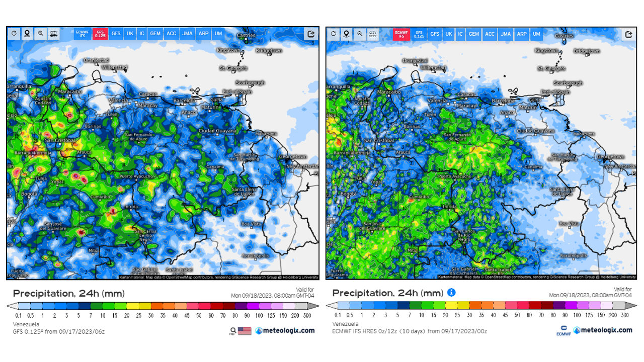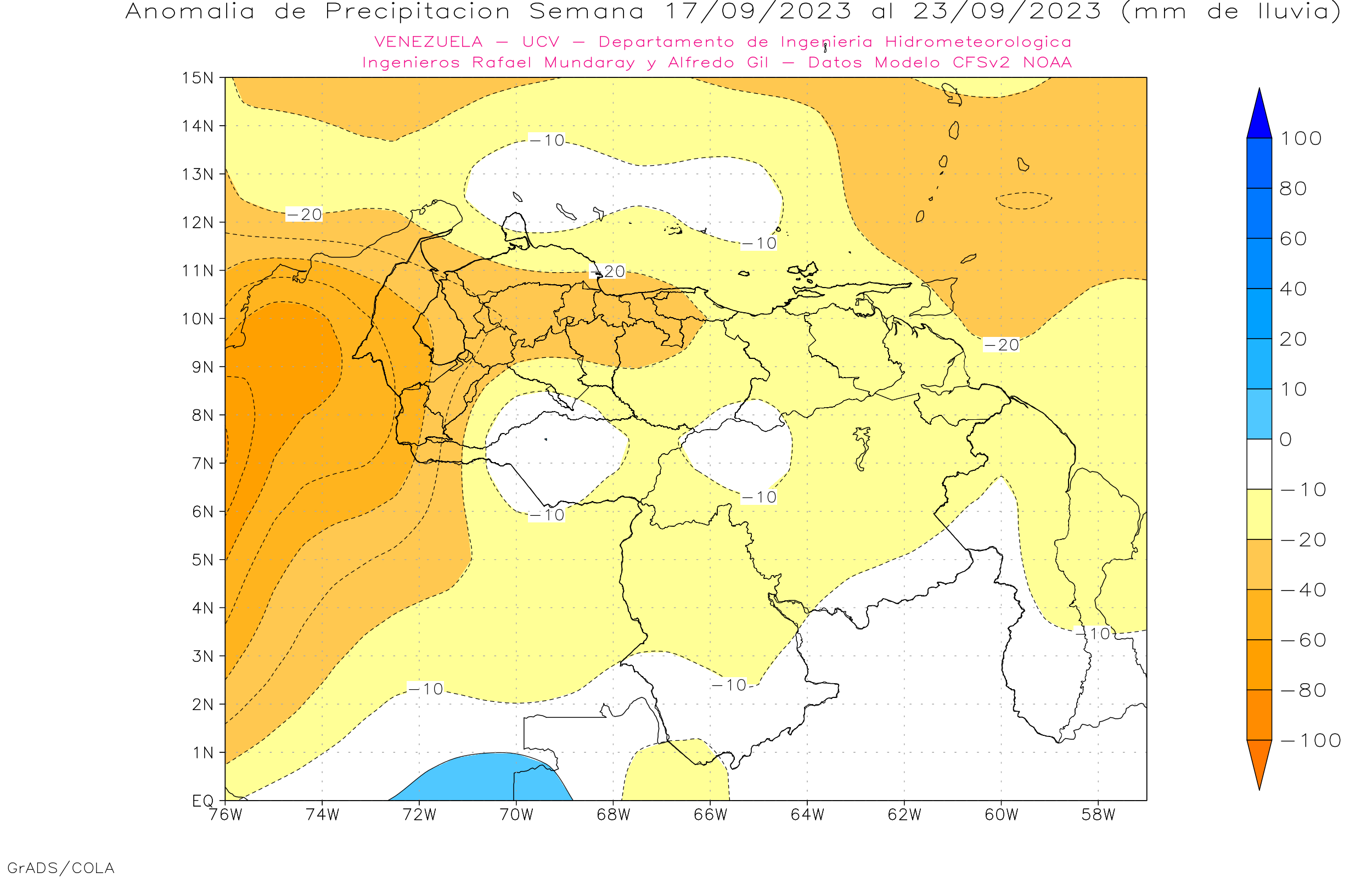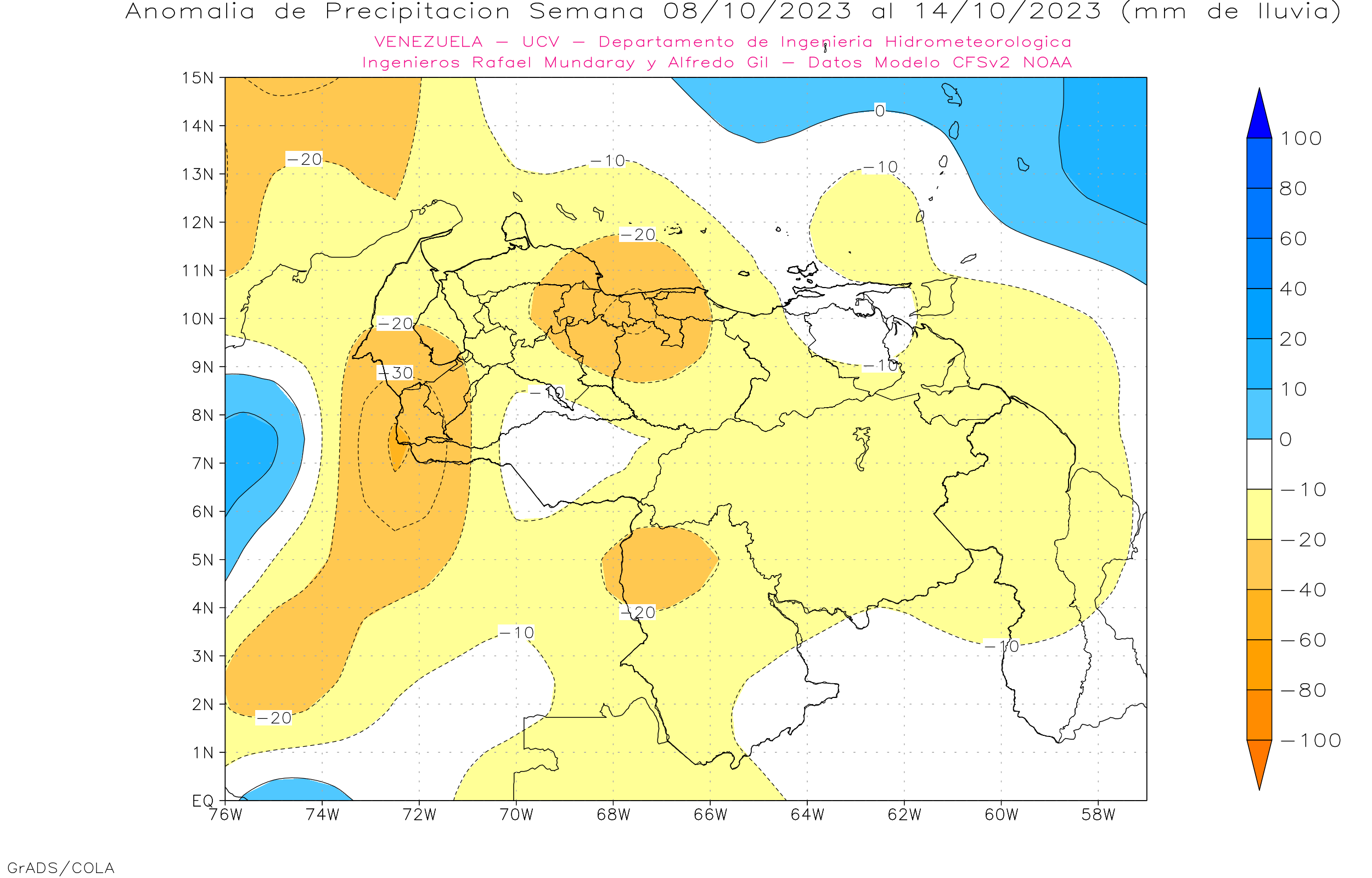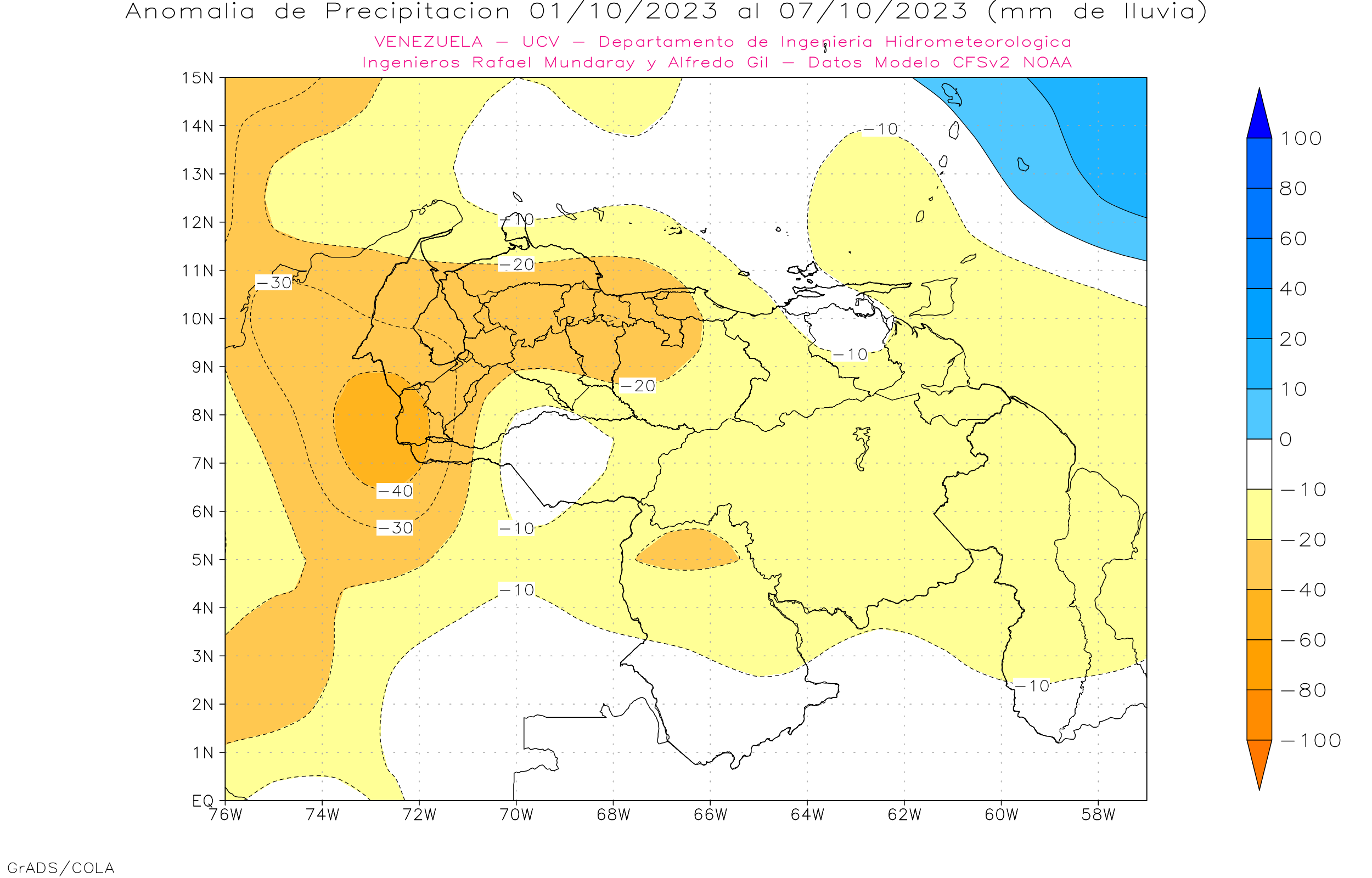 El modelo GFSv2 prevé en general eventos de precipitaciones dentro del promedio histórico en casi todo el territorio nacional, con algunas anomalías negativas en Lara, sur de Falcón, Zulia, Yaracuy, Carabobo, Aragua, oeste de Miranda, Trujillo, Mérida y Tachira.