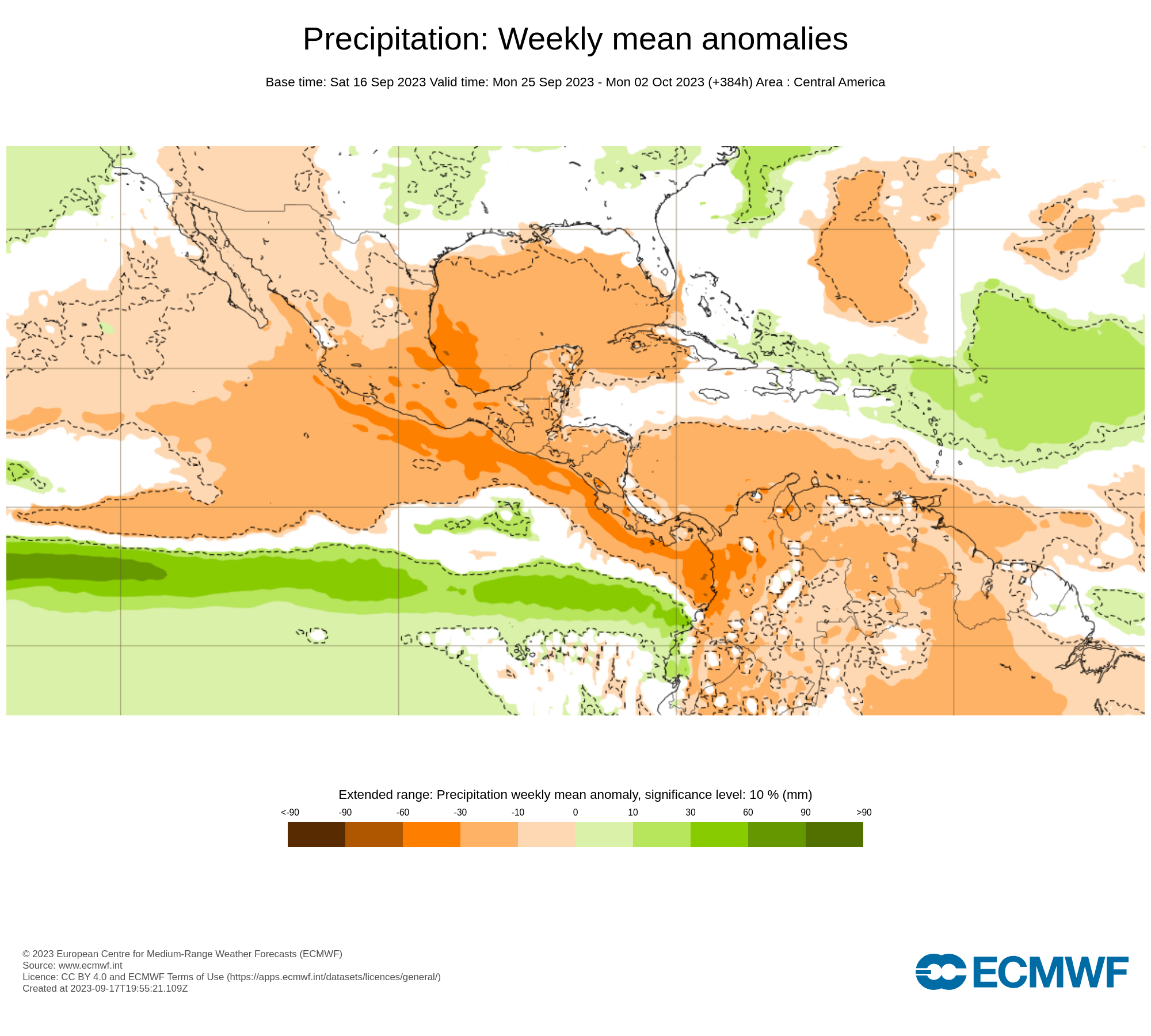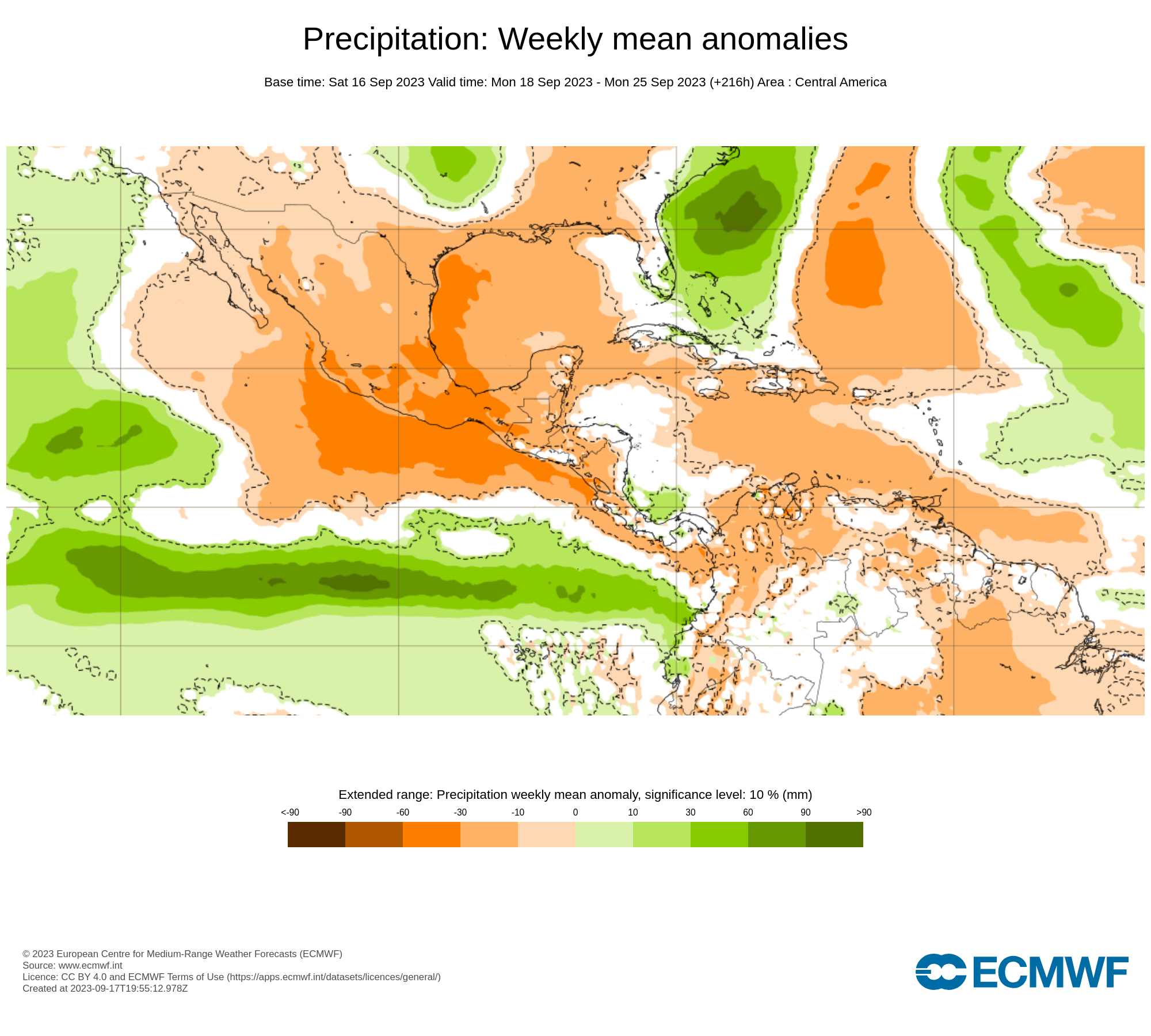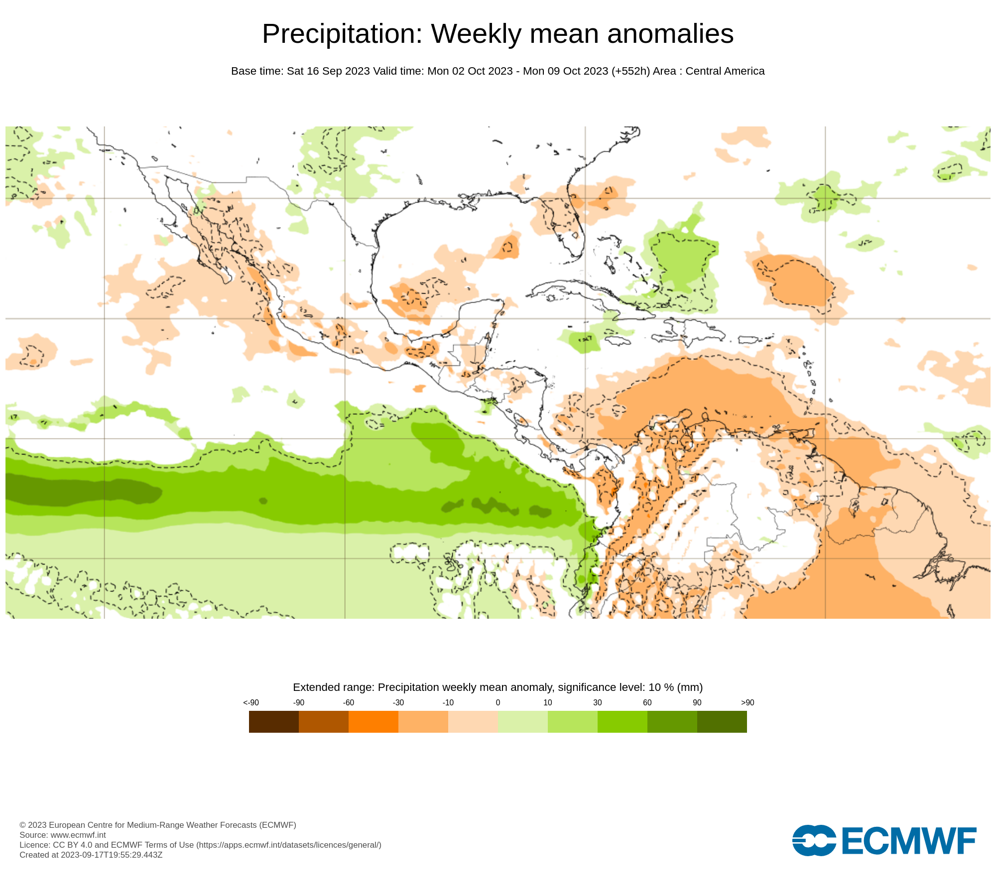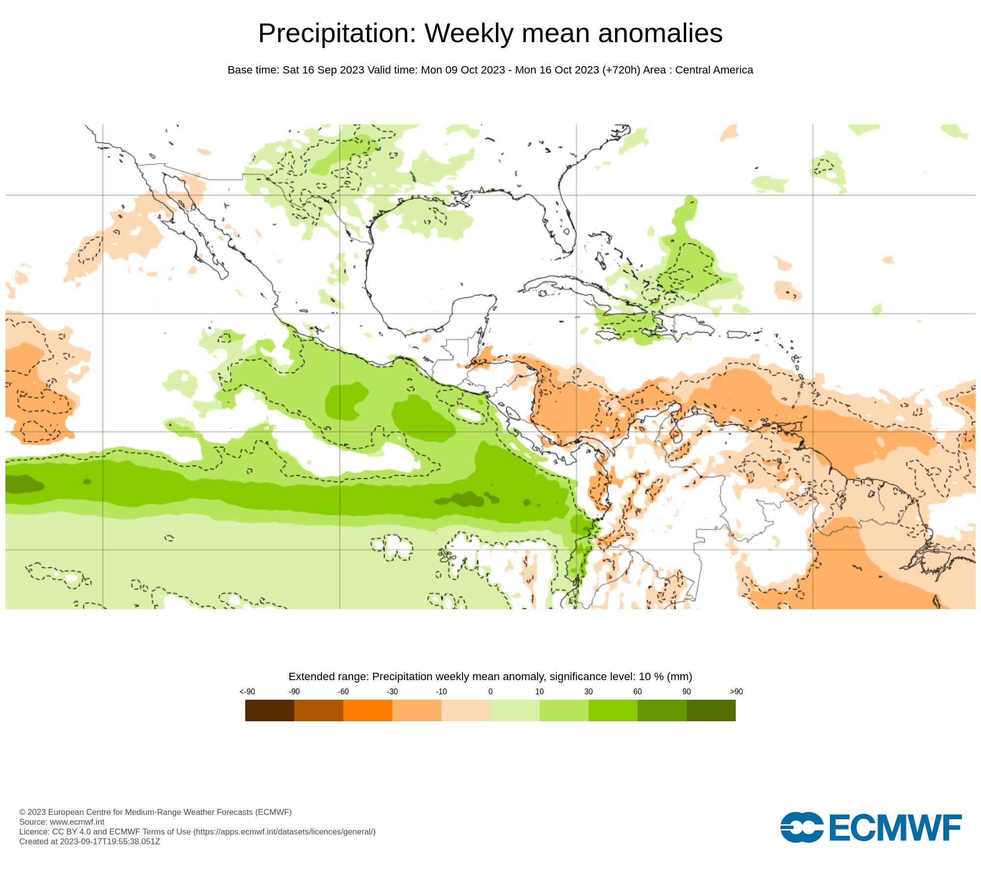 El pronostico semanal emitido por European Centre for Medium-Range Weather Forecast (ECMWF), se esperan en general al país con precipitaciones promedio, con anomalías negativas en el occidente y oriente del país.