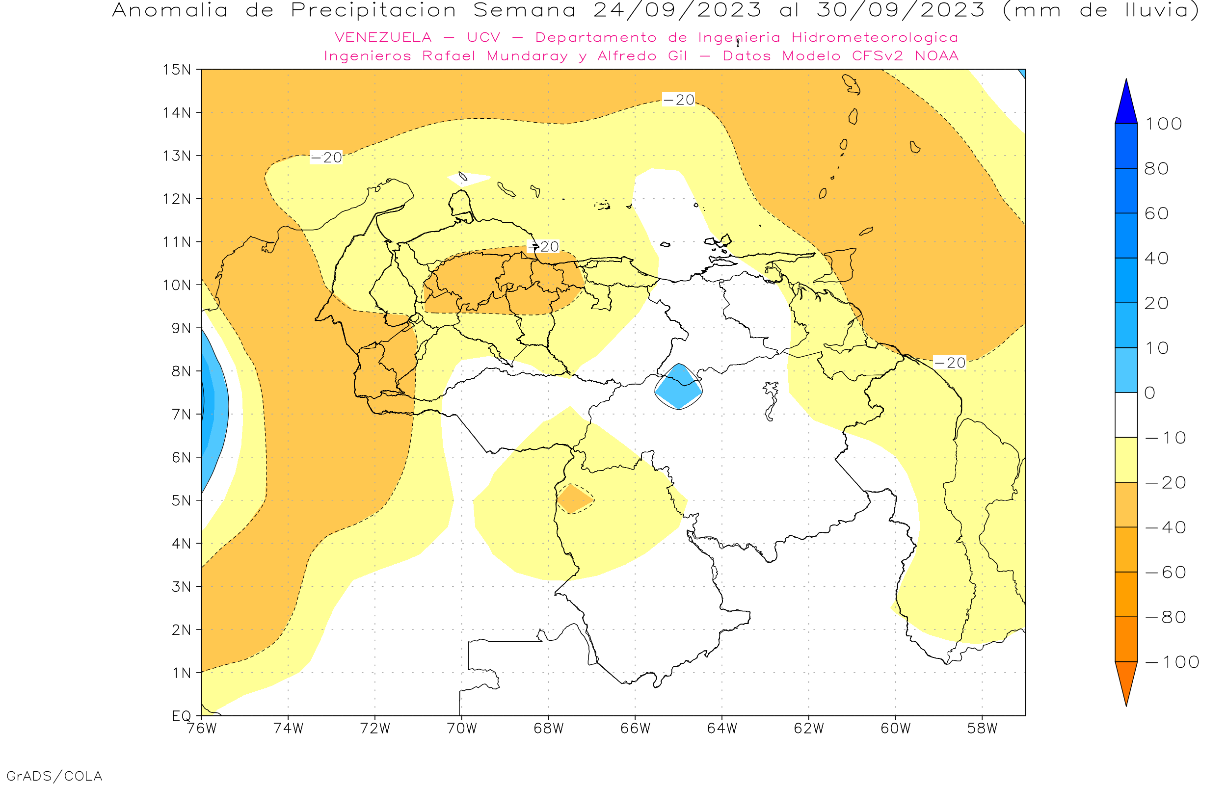 Pronostico de Anomalías Semanales para Venezuela, del 17/09 al 14/10/2023, usando datos del Modelo CFSv2 de NOAA y ECMWF.