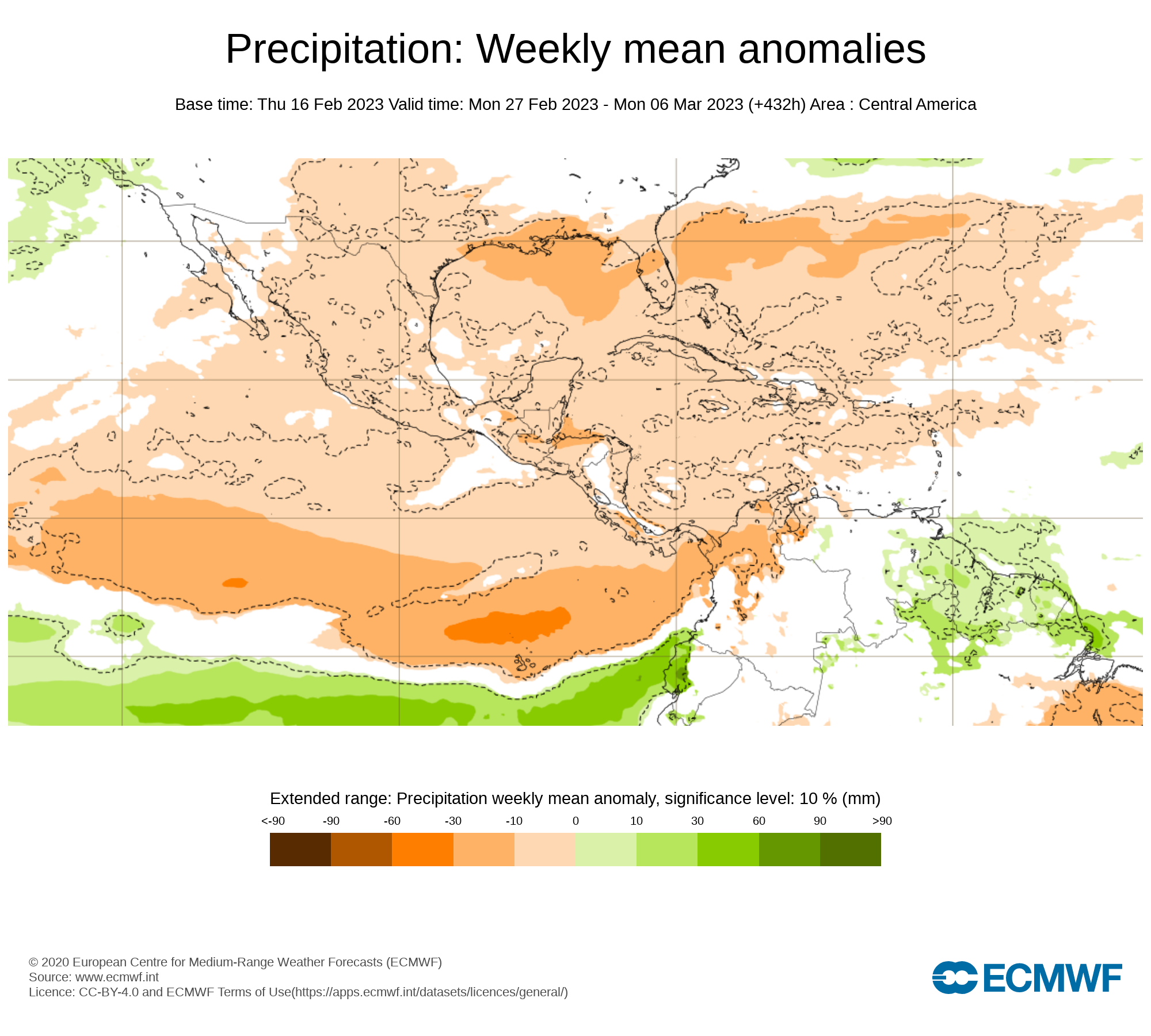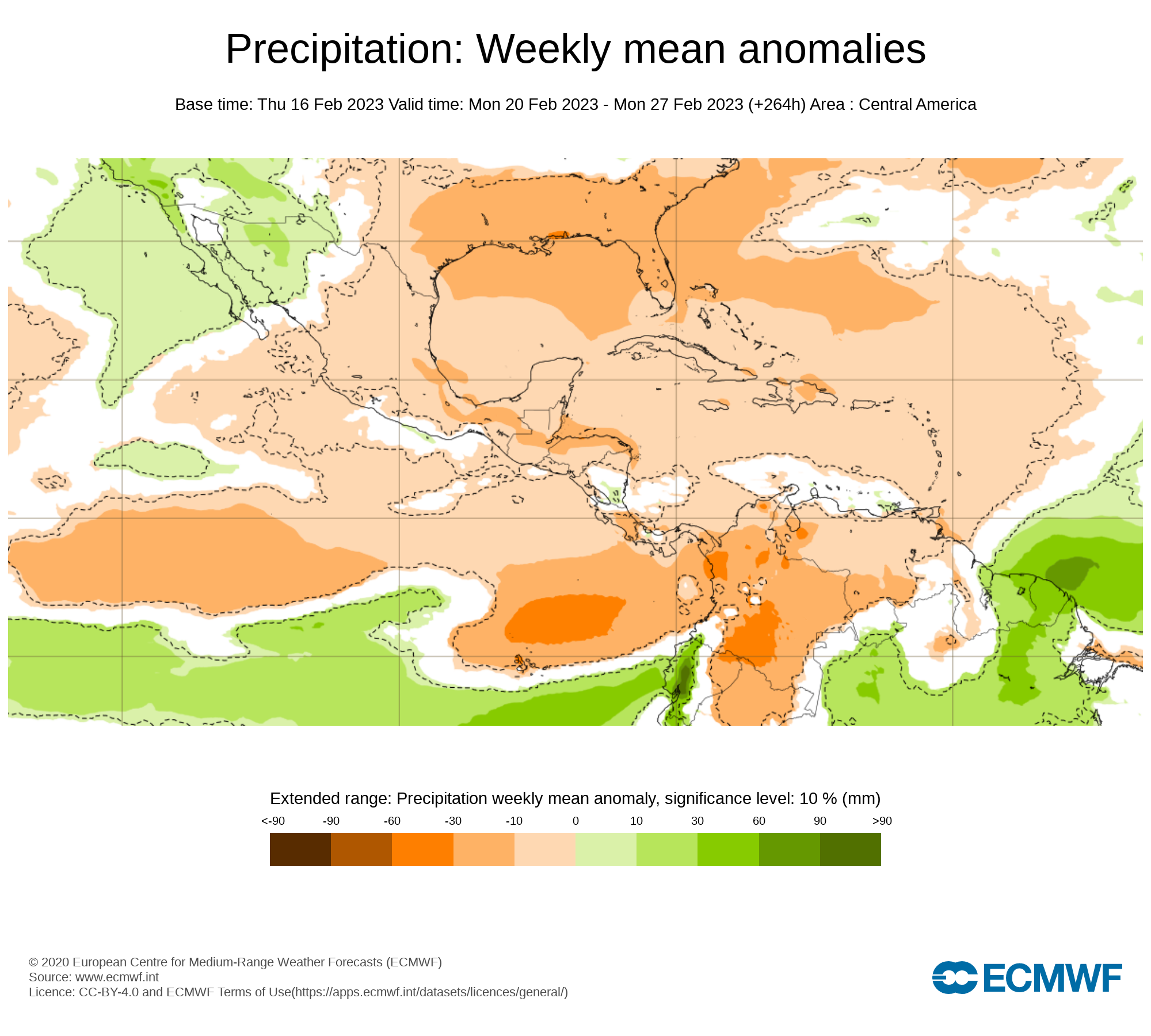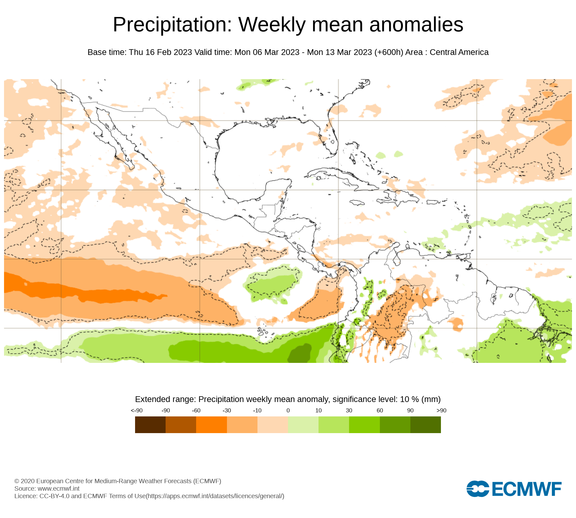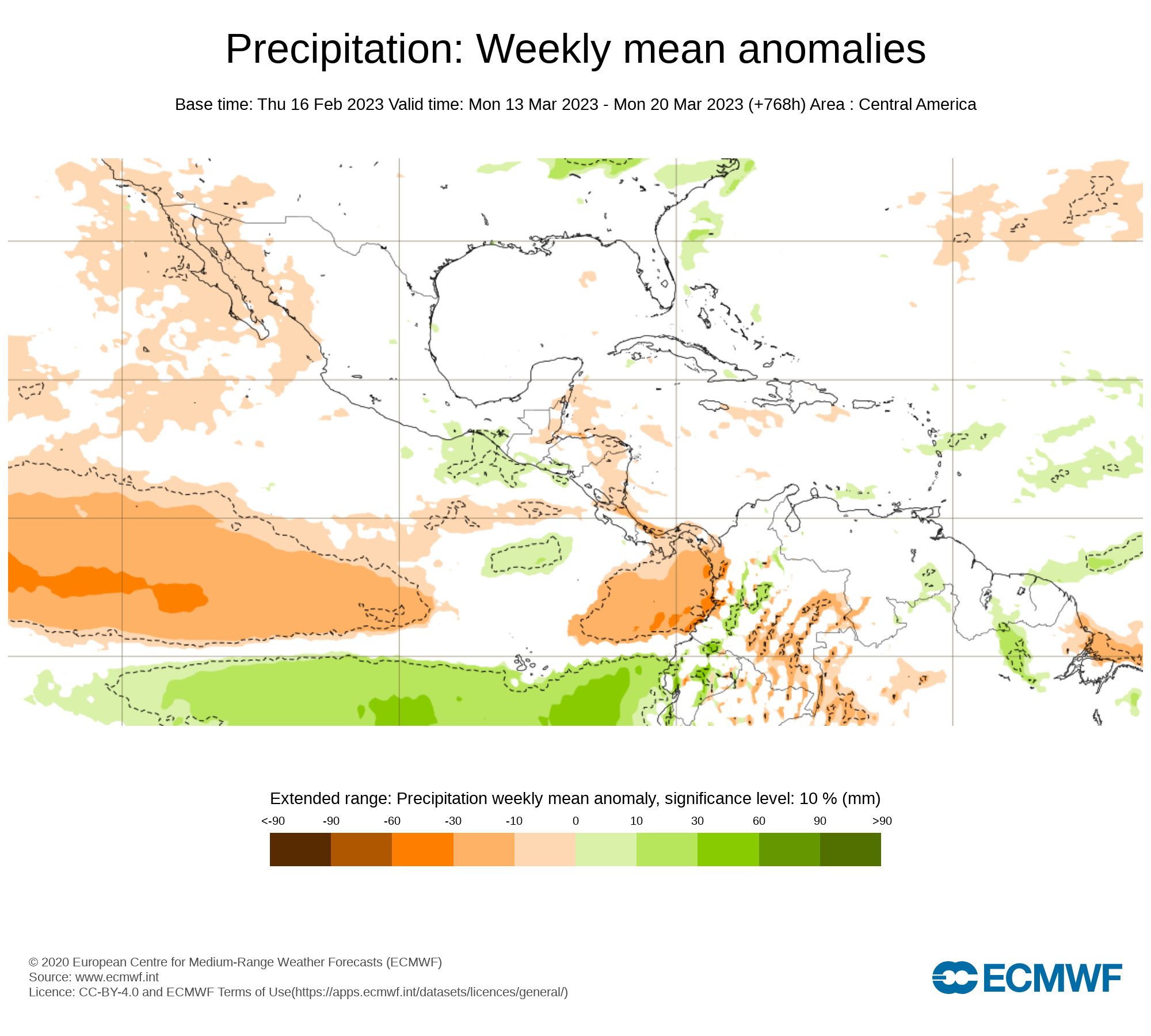 El pronostico semanal emitido por European Centre for Medium-Range Weather Forecast (ECMWF), se esperan eventos de precipitaciones promedio sobre el territorio nacional, con anomalías negativas en los andes, suroeste de bolívar y norte de Amazonas