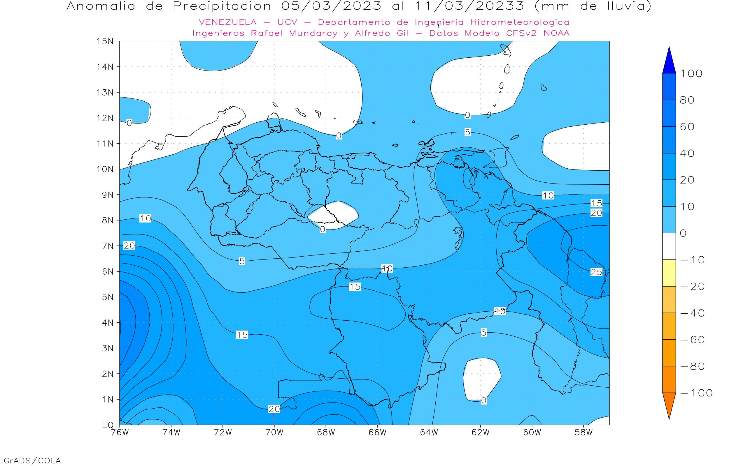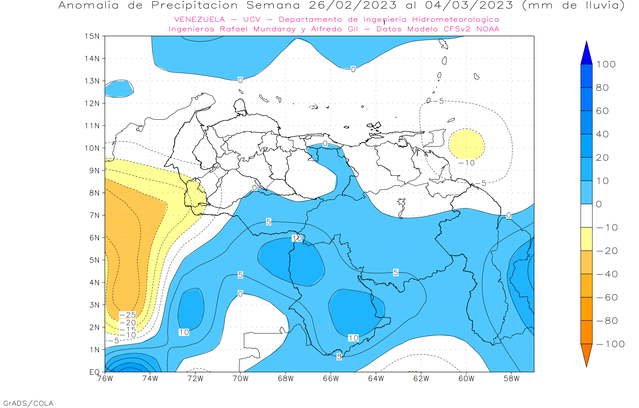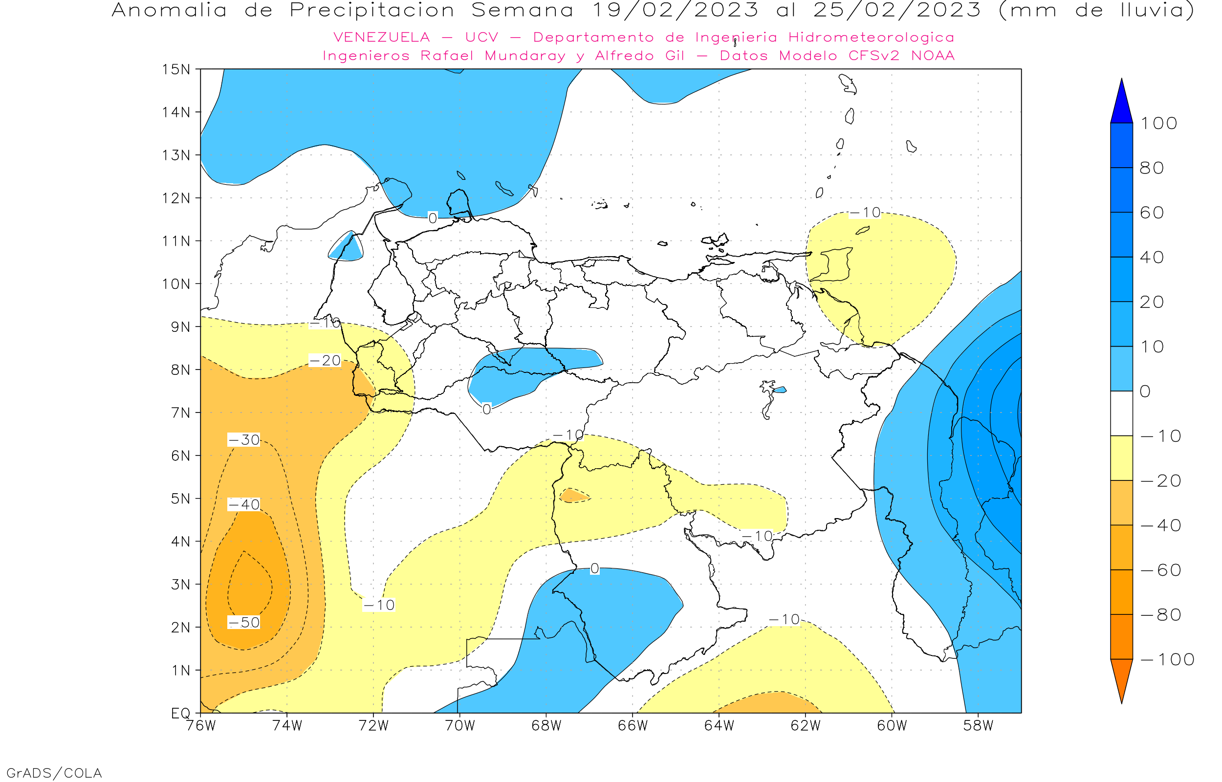Pronostico de Anomalías Semanales para Venezuela, del 19/02 al 18/03/2023, usando datos del Modelo CFSv2 de NOAA y ECMWF.