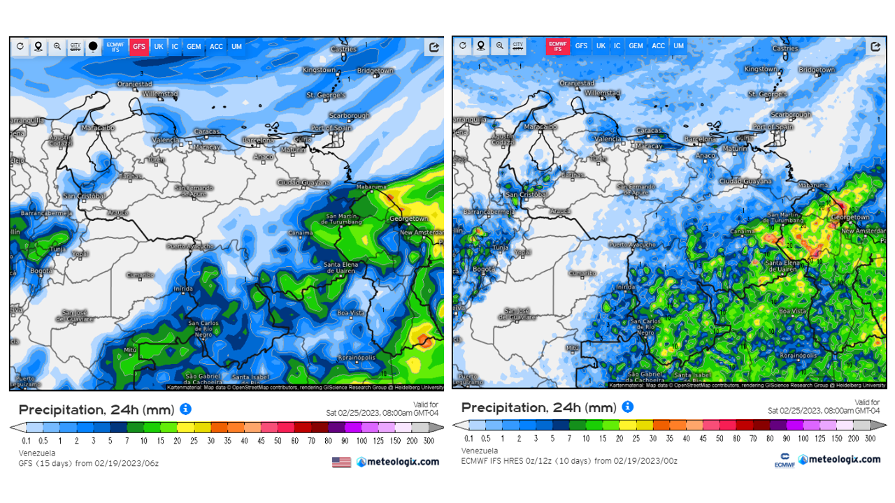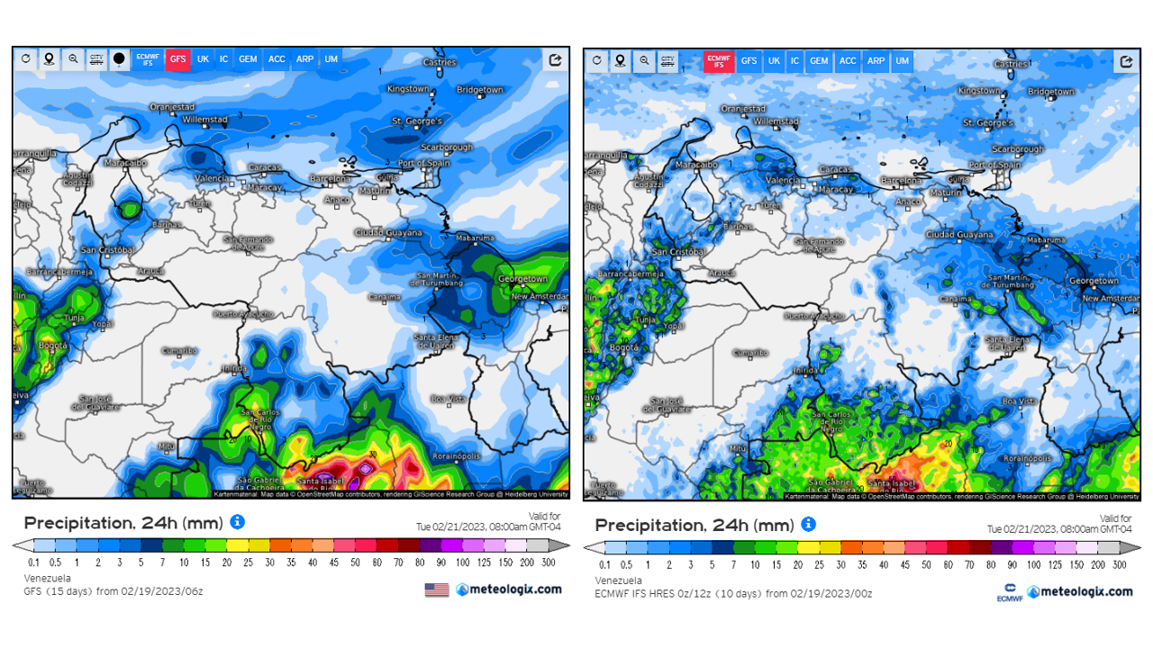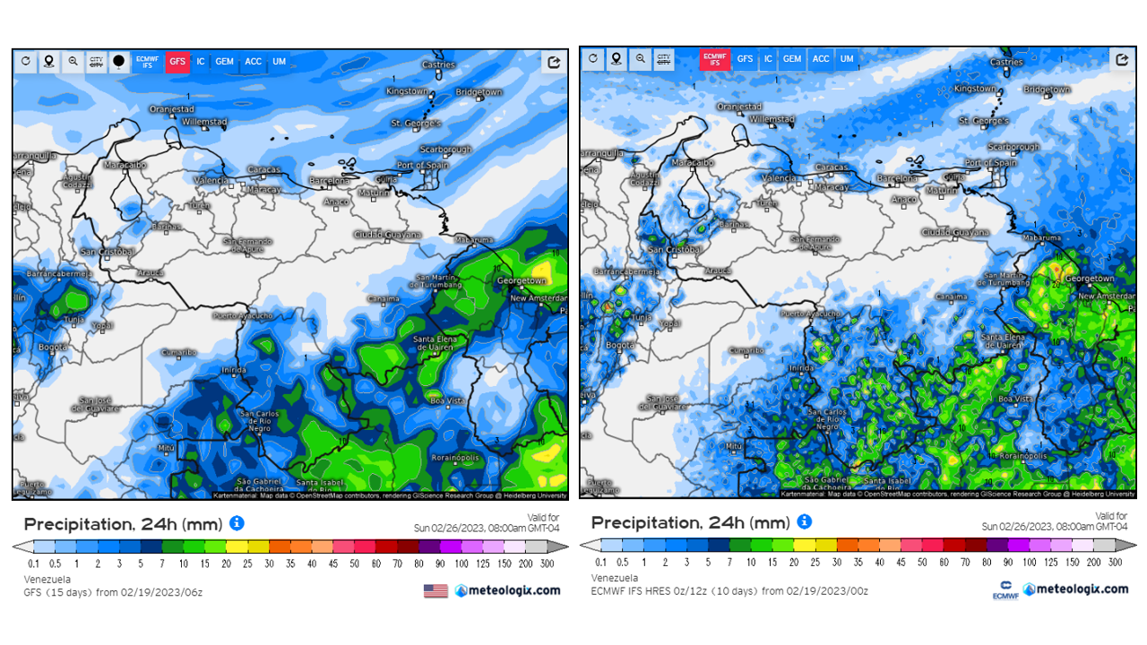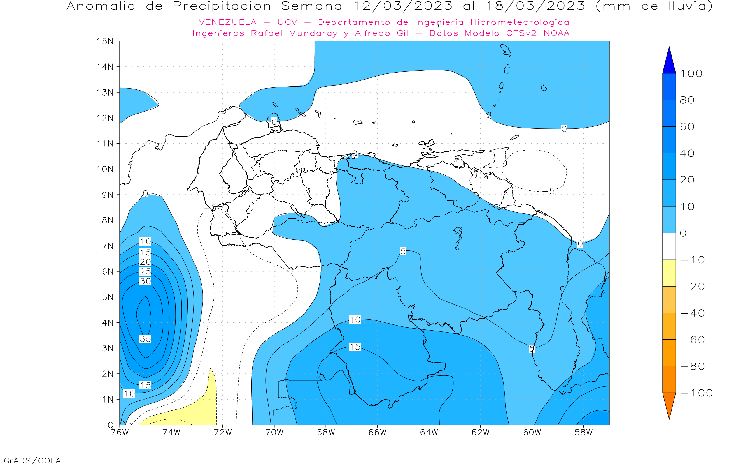 Pronostico de Anomalías Semanales para Venezuela, del 19/02 al 18/03/2023, usando datos del Modelo CFSv2 de NOAA y ECMWF.