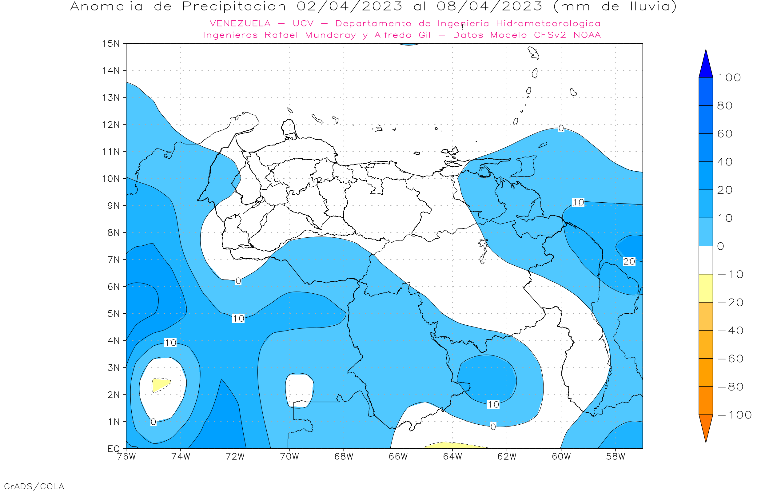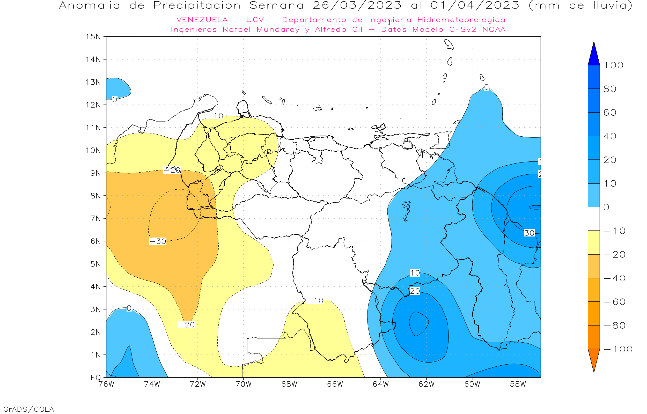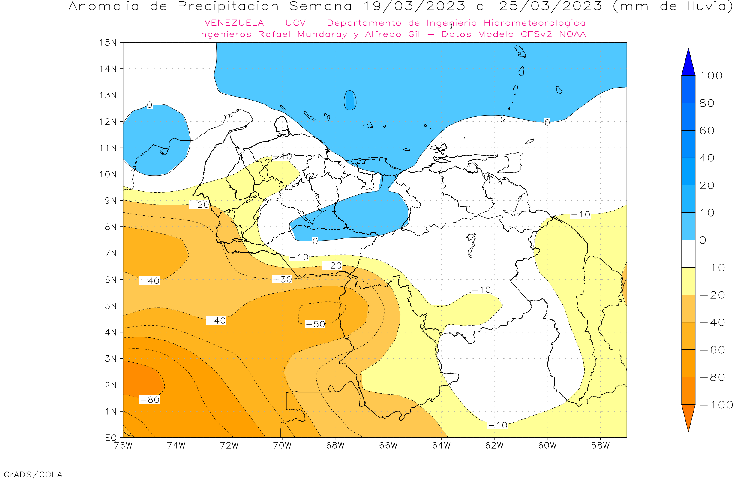Pronostico de Anomalías Semanales para Venezuela, del 19/03 al 15/04/2023, usando datos del Modelo CFSv2 de NOAA y ECMWF.