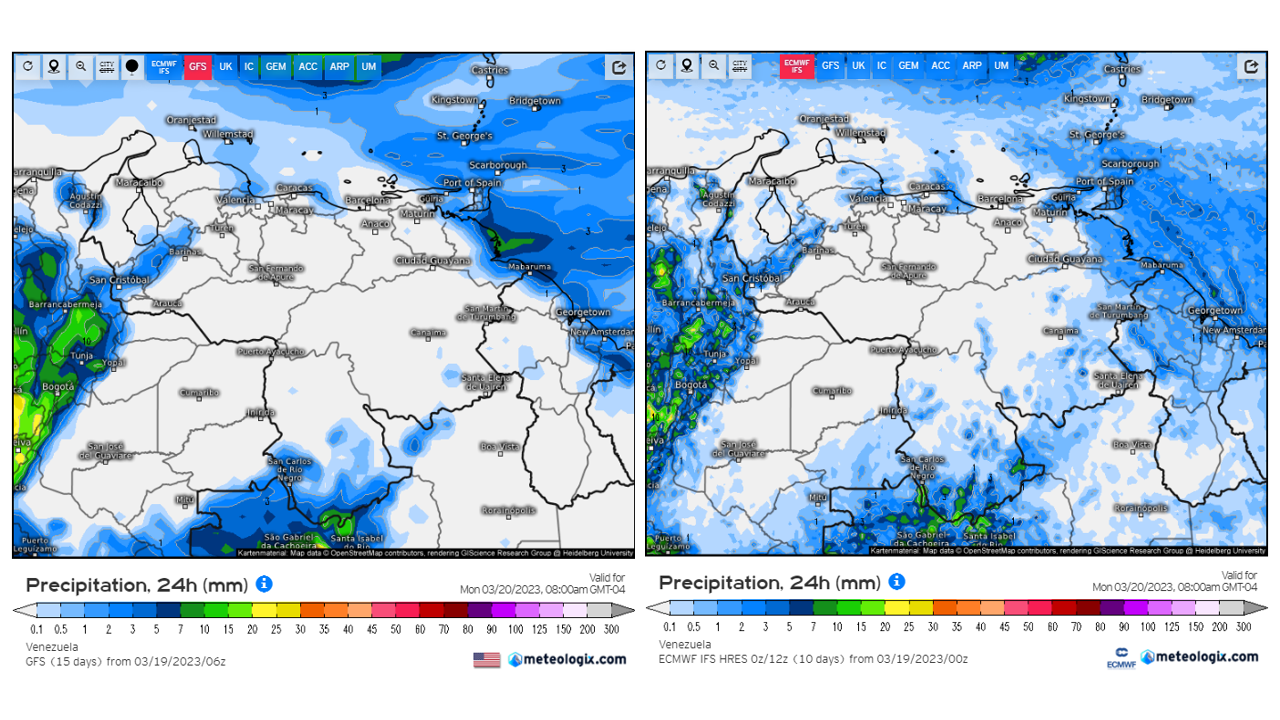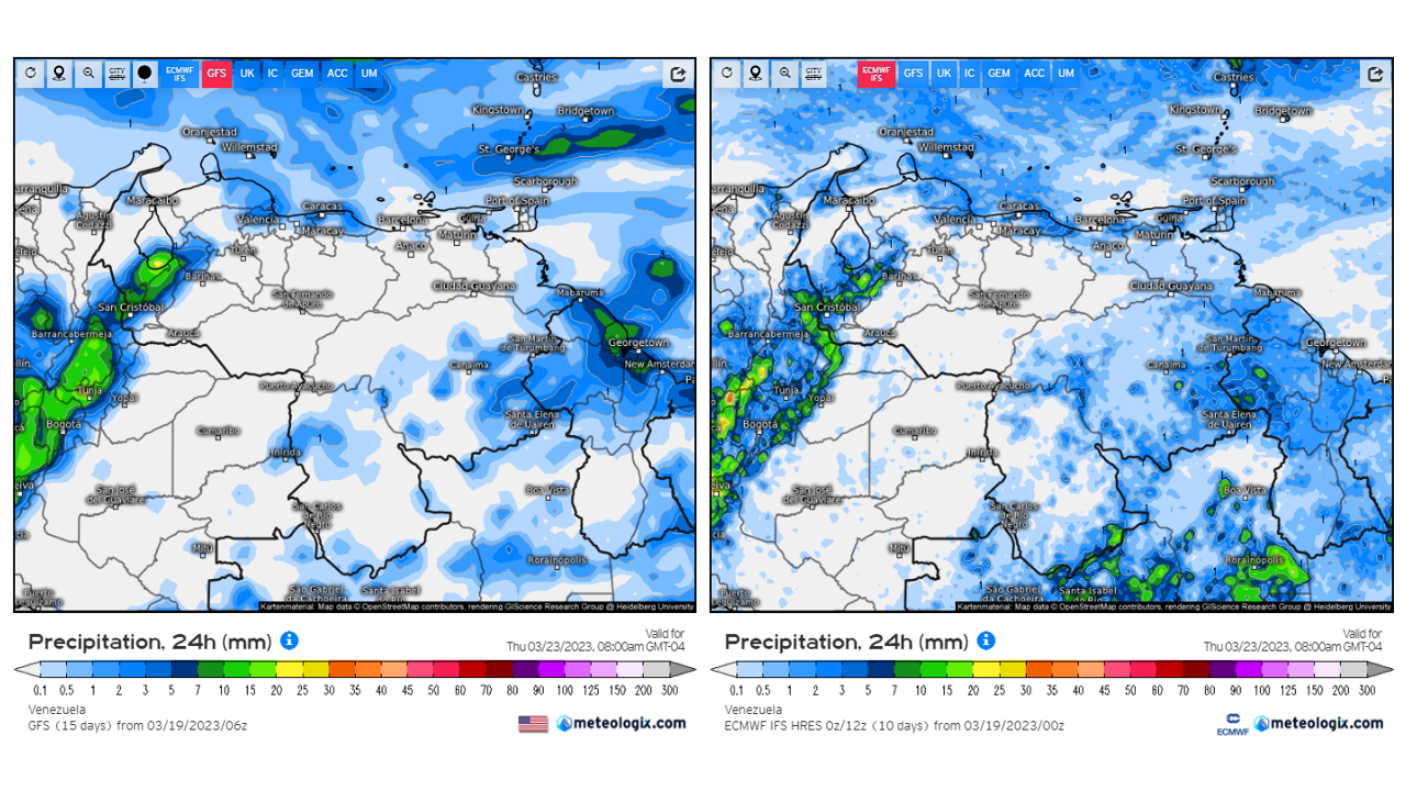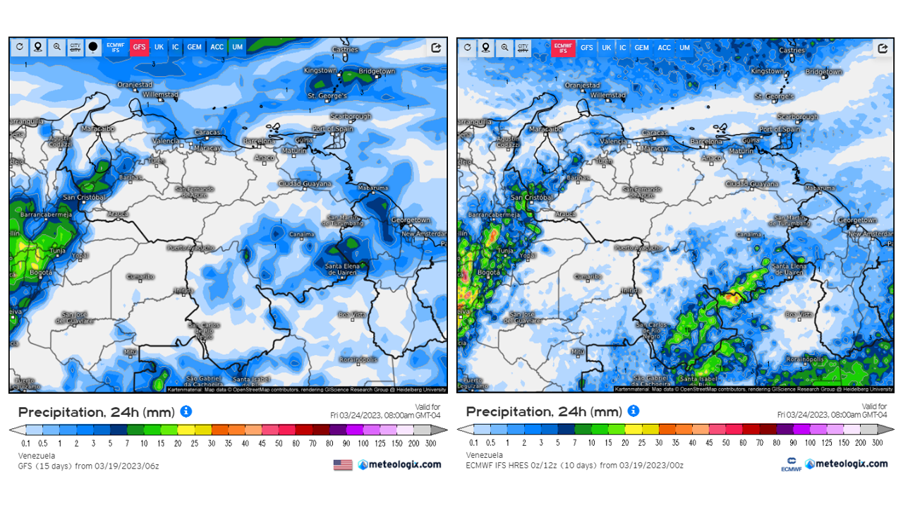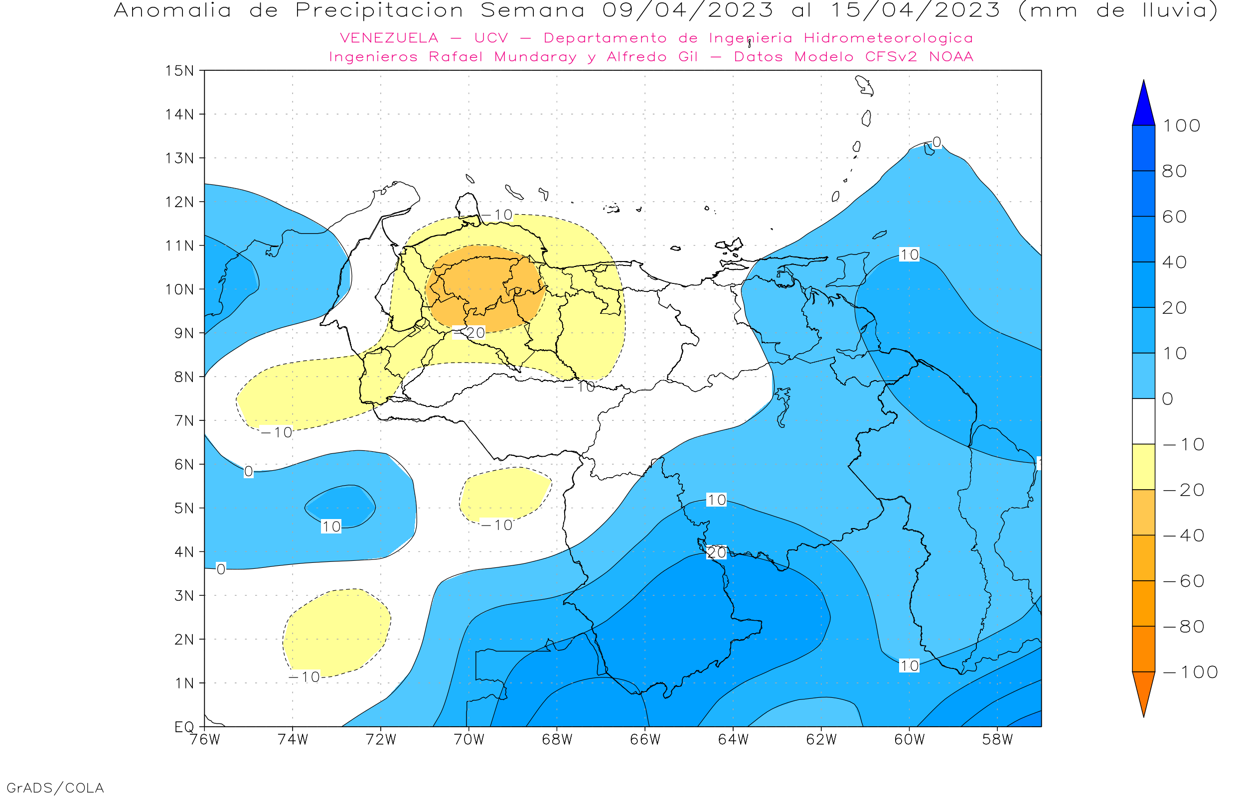 Pronostico de Anomalías Semanales para Venezuela, del 19/03 al 15/04/2023, usando datos del Modelo CFSv2 de NOAA y ECMWF.