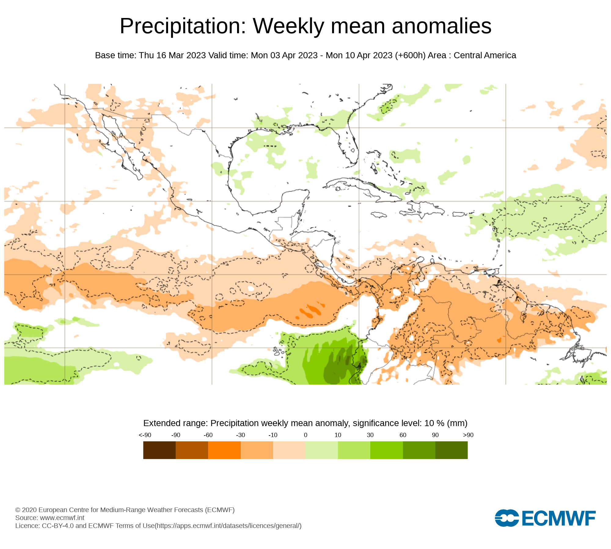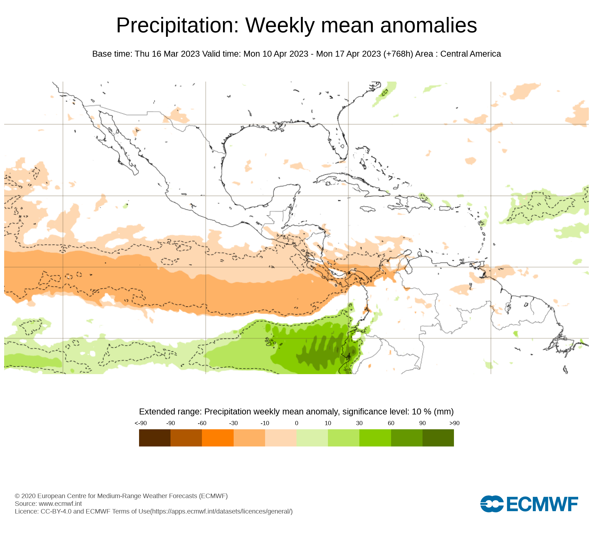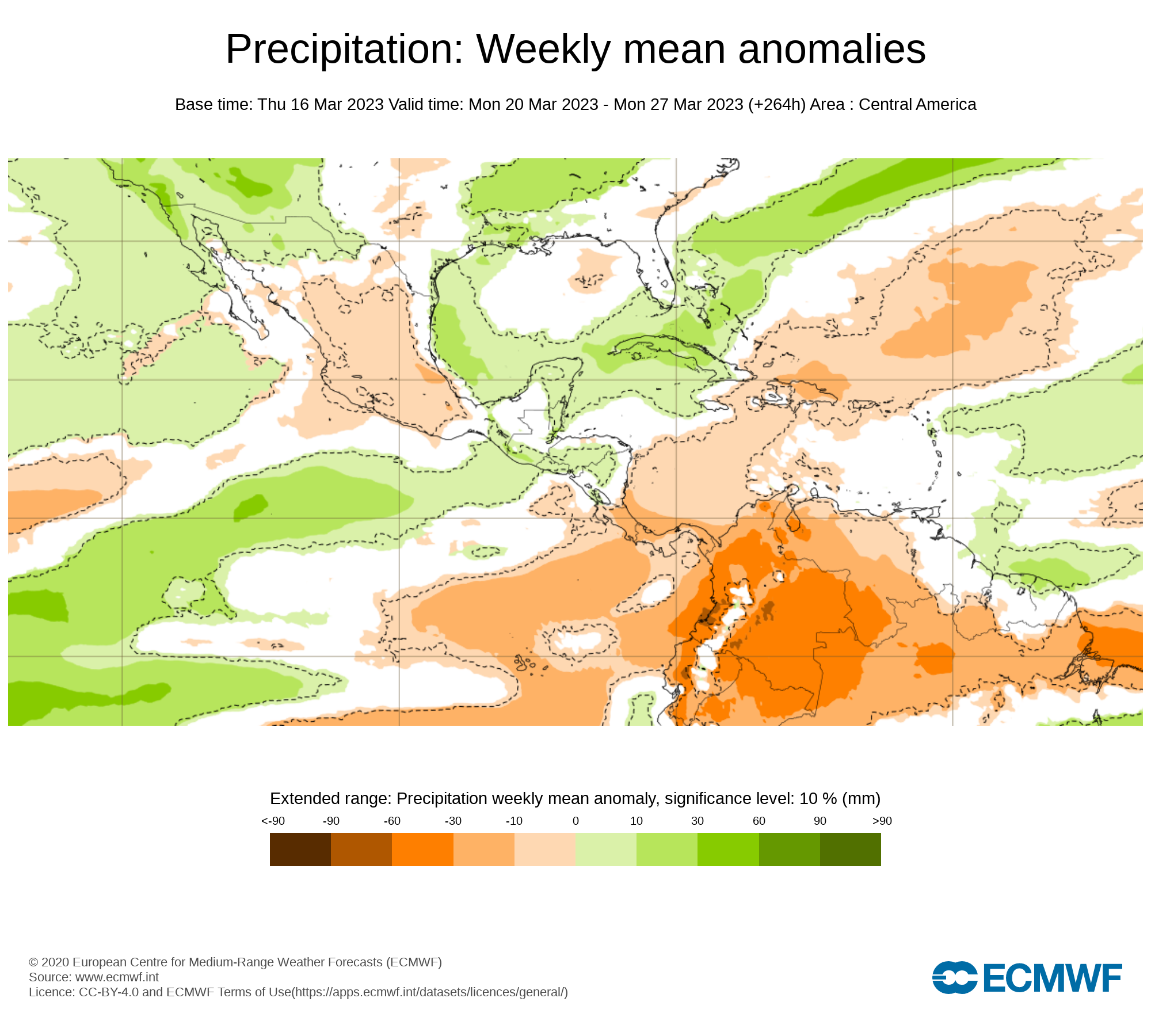 El pronostico semanal emitido por European Centre for Medium-Range Weather Forecast (ECMWF), se esperan eventos de precipitaciones promedio sobre el territorio nacional y anomalías al sur de país..
