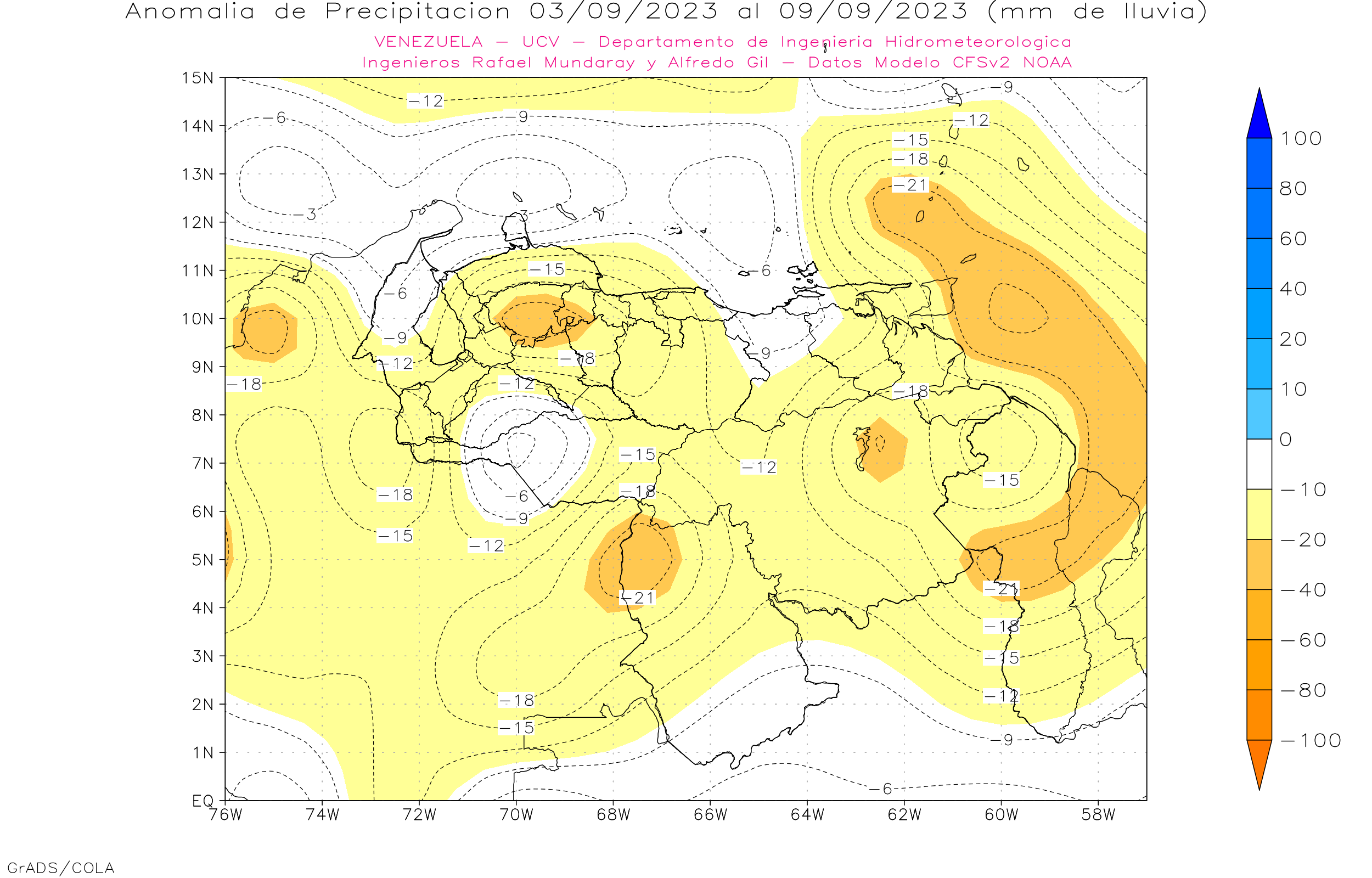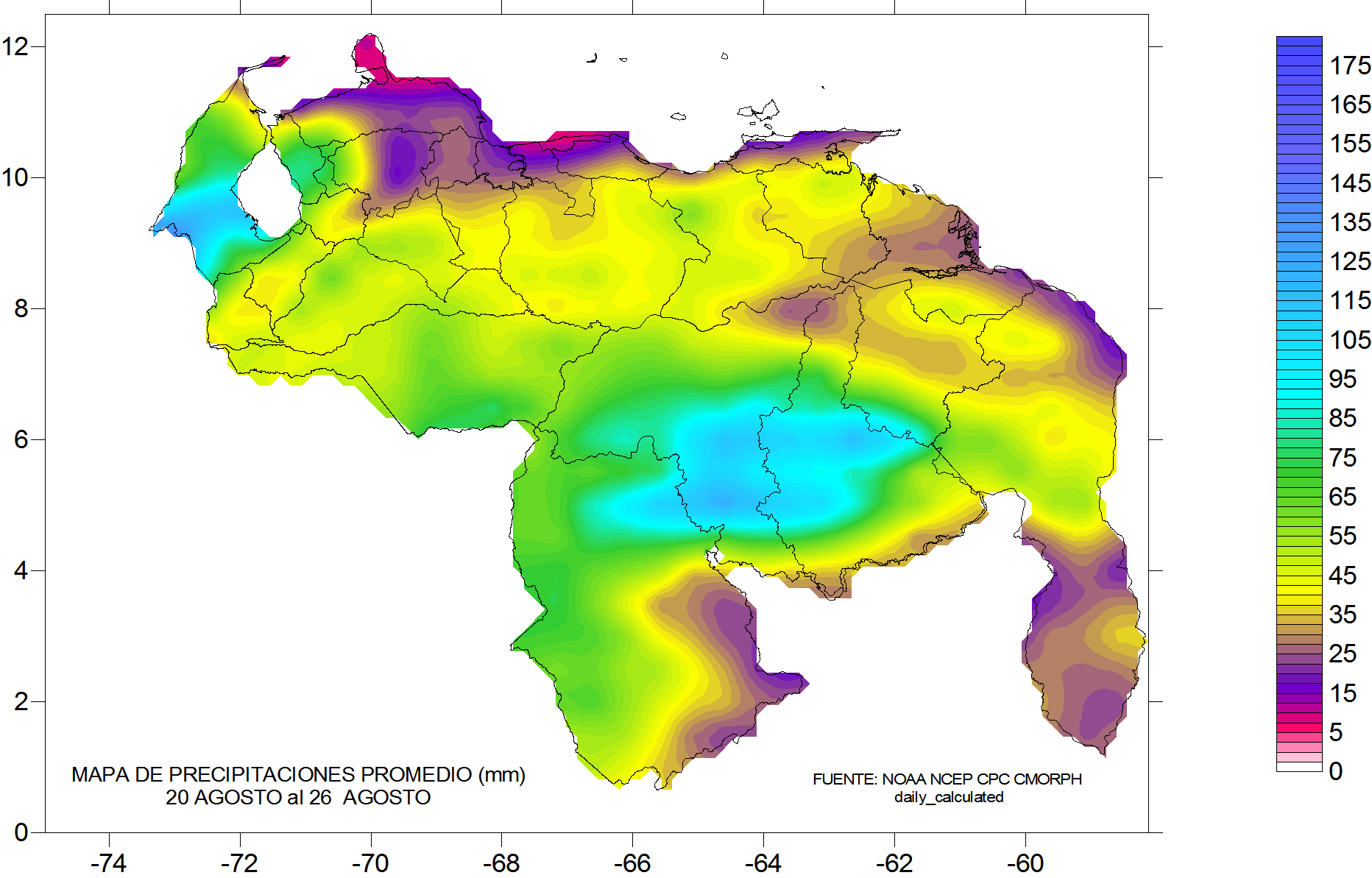 De acuerdo a la estadística de las precipitaciones estimadas para esta semana, se observa que los eventos más importantes se mantiene en las cuencas al sur del río Orinoco, noreste de Amazonas y suroeste de Zulia, pero una reducción hacia el sureste de Amazonas con valores que pueden lleagar a 15 mm, en el oriente con valores cercanos entre 25 a 45 mm, los centro de alta precipitación de 100 mm en el suroeste de Bolívar. Lluvias por encima de los 75 mm se ubican al sur de 7° norte. Los llanos occidentales mantiene los eventos de precipitaciones entre 35 y 65 mm, la región nor central con valores entre 5 y 15 mm, la región andina con precipitaciones entre 25 y 40 mm, Anzoátegui con valores entre 35 y 55 mm y Monagas con valores cercanos a 25 mm, Oeste de Zulia con centro de lluvias de 105 mm. Falcón y Lara con centro de precipitaciones de entre 5 y 15 mm.