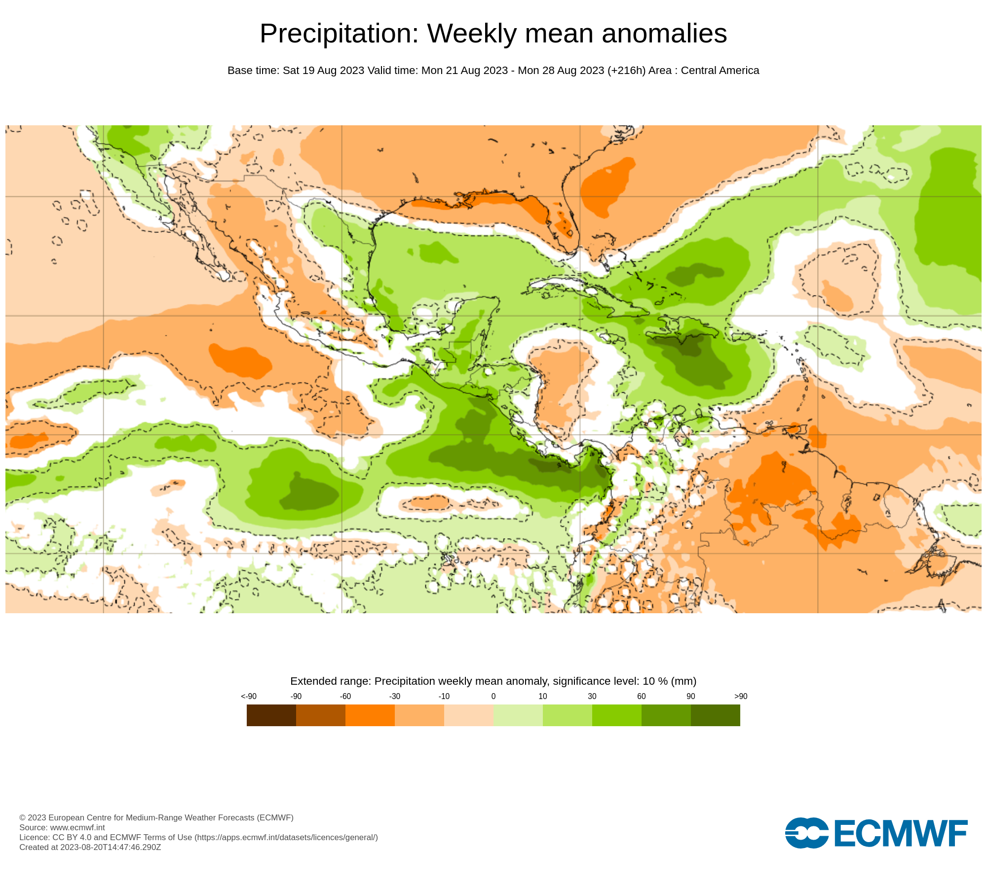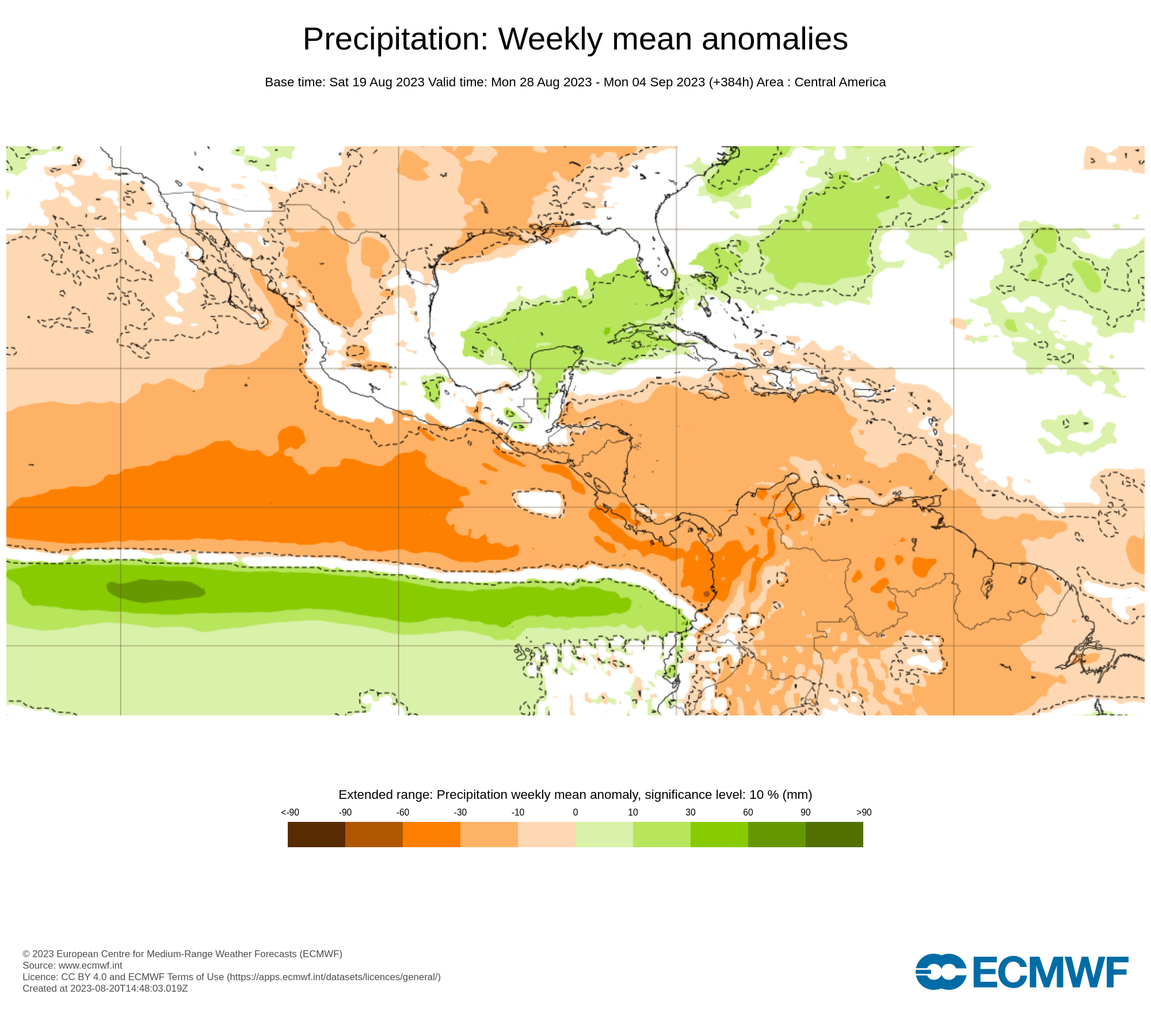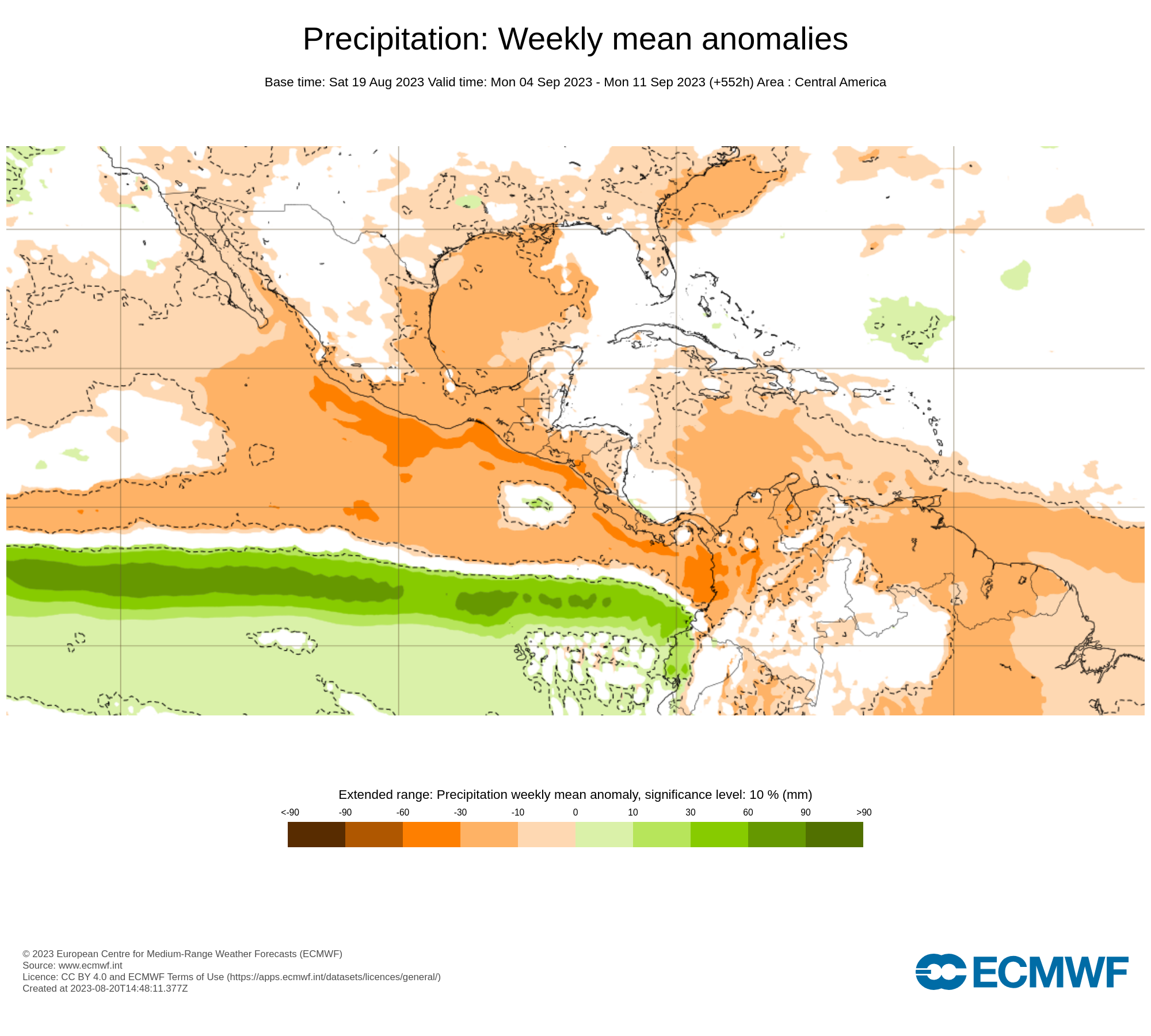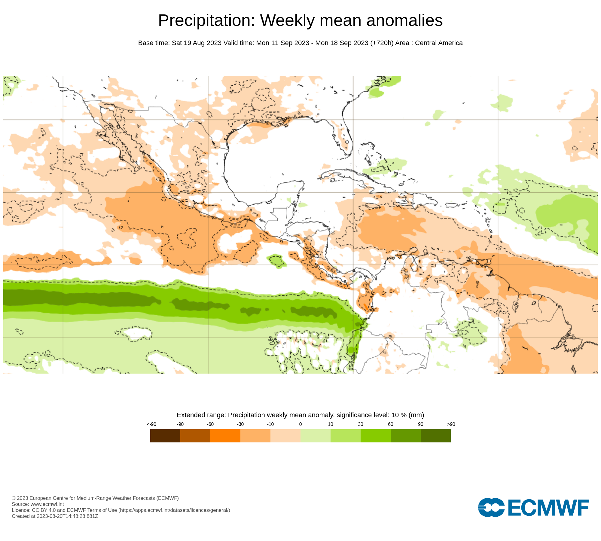 El pronostico semanal emitido por European Centre for Medium-Range Weather Forecast (ECMWF), se esperan eventos de precipitaciones por debajo sobre casi todo el territorio nacional.