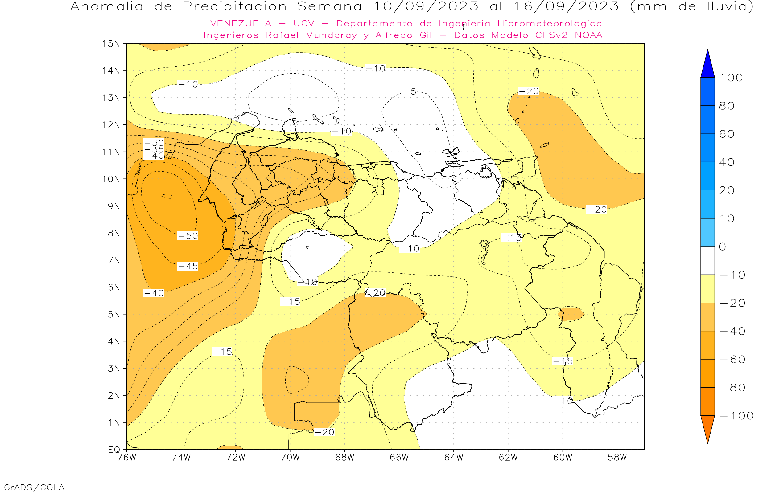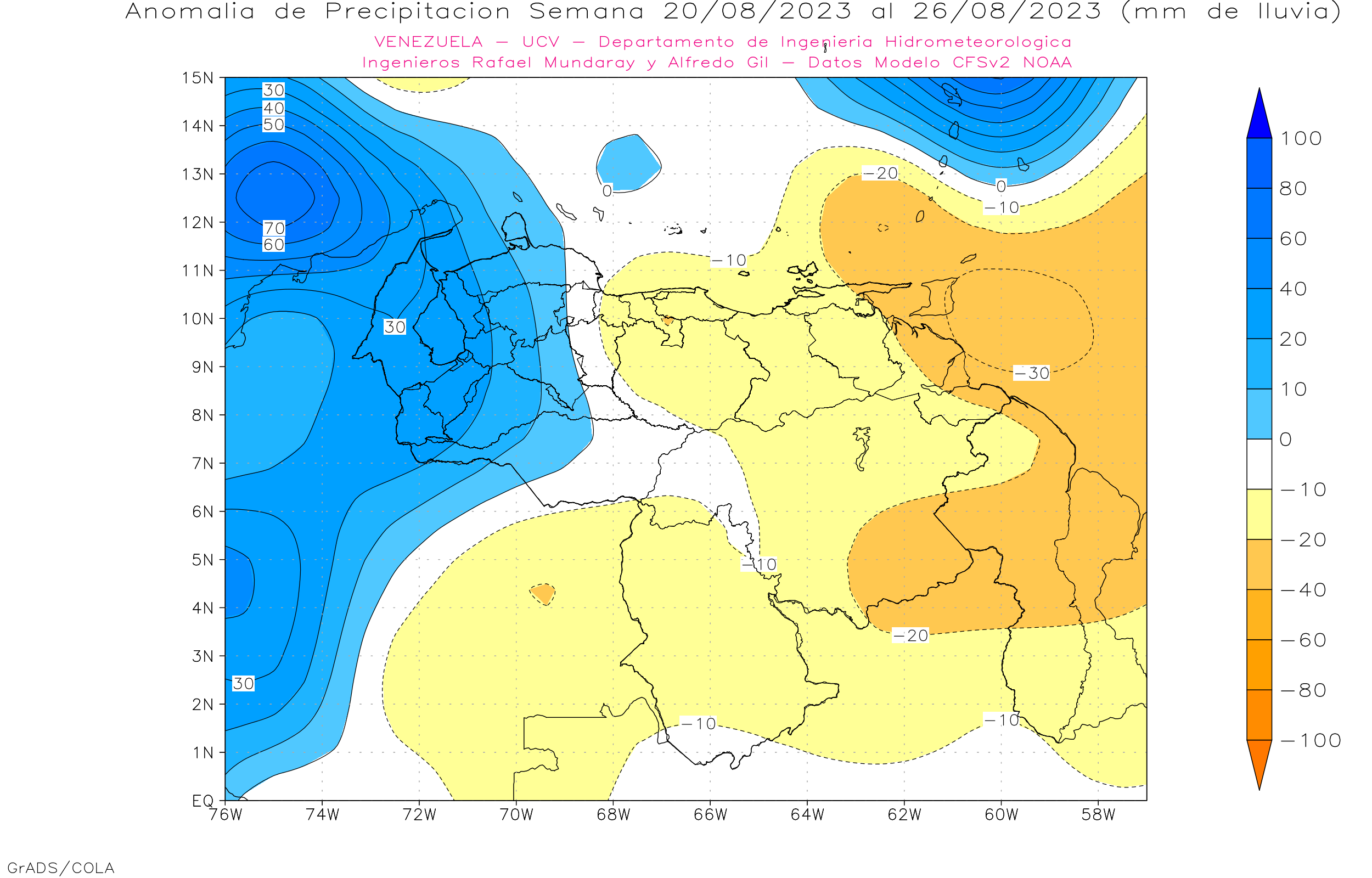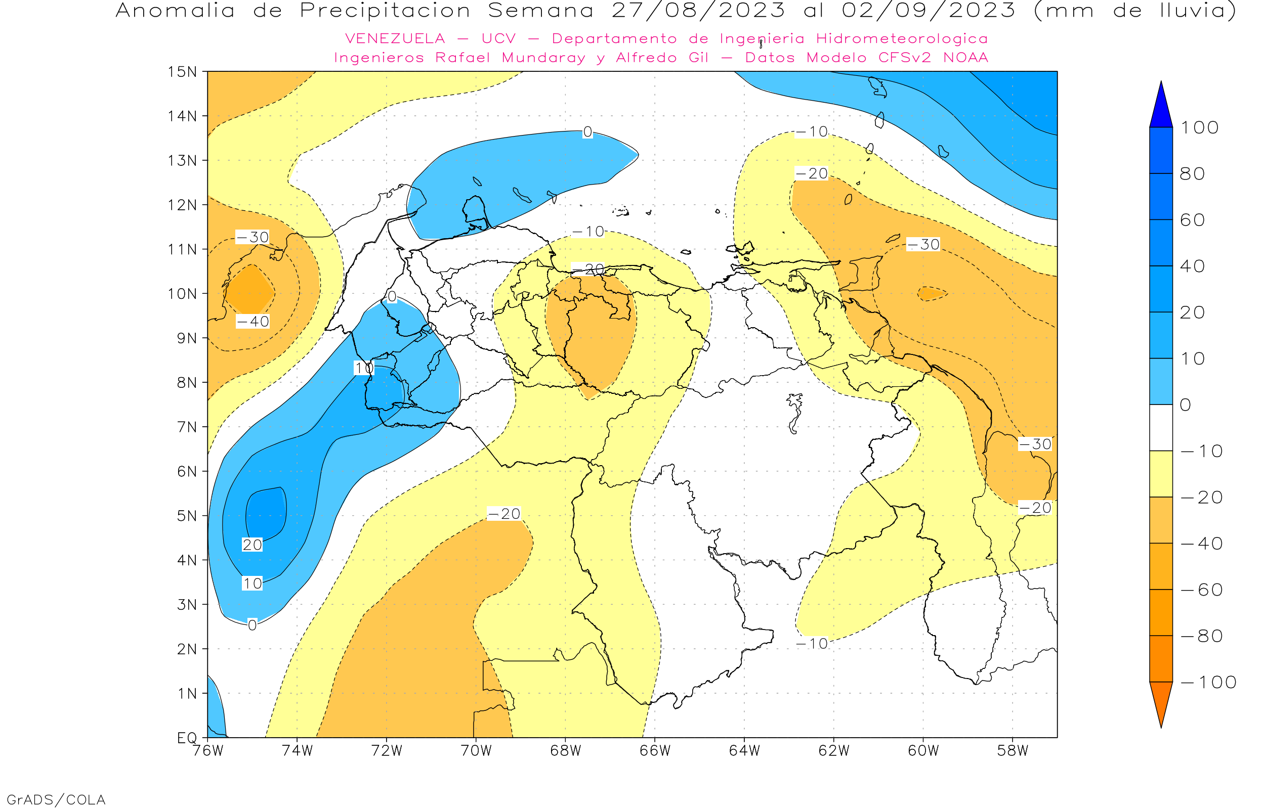 Pronostico de Anomalías Semanales para Venezuela, del 20/08 al 16/09/2023, usando datos del Modelo CFSv2 de NOAA y ECMWF.