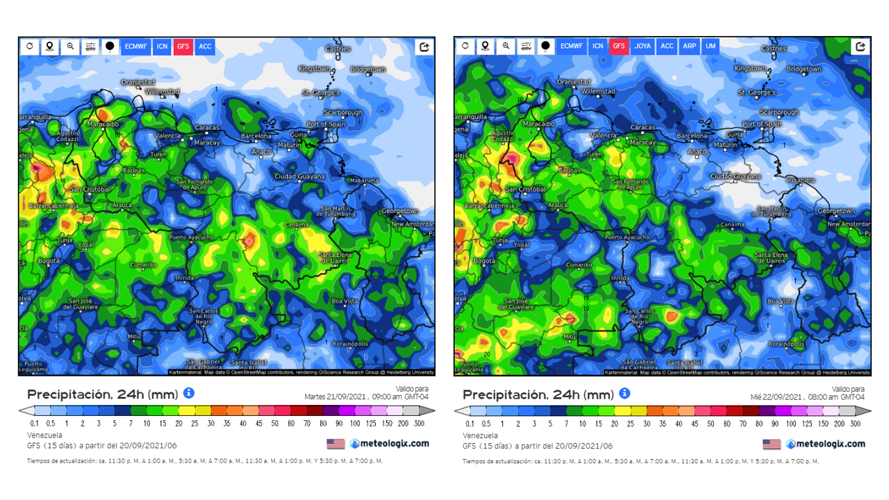 En el pronostico diario del modelo GFS del 20 al 27 de septiembre, la semana comienza con eventos de precipitaciones, manteniéndose el resto de la semana, llanos occidentales, Zulia, sur del país y los andes