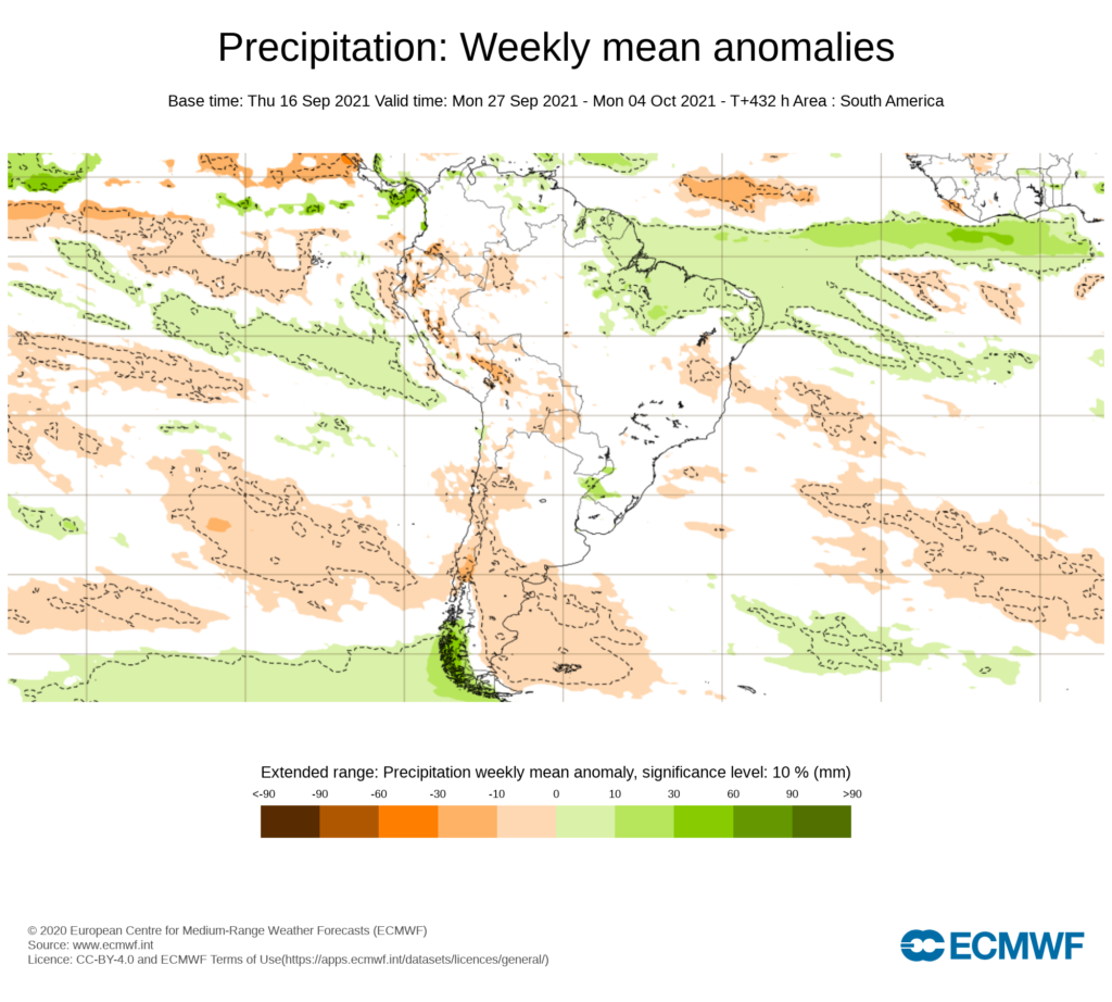 El pronostico semanal de anomalías del CFSv2 con el emitido por European Centre for Medium-Range Weather Forecast (ECMWF), prevé anomalías positivas de precipitaciones al sur y oriente del país, coincidiendo con las anomalías positivas al sur del país.