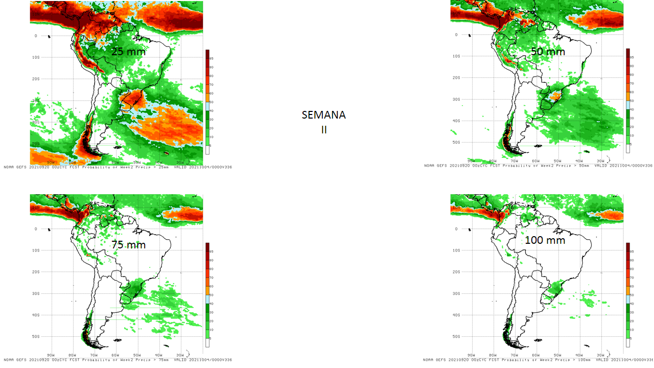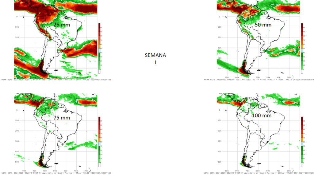 Las Probabilidades de excedencia total de precipitación para semana del 20 al 27 de septiembre, superiores a 25, 50, 75 y 100 mm, se prevé que las mayores probabilidades para eventos mayores a 25 mm se esperan en casi todo el territorio nacional, para eventos mayores de 50 mm se reduce al sur del país, región andina y Zulia y las probabilidades se van reduciendo para eventos mayores de 75 y 100 mm solo para el sur de Bolívar.