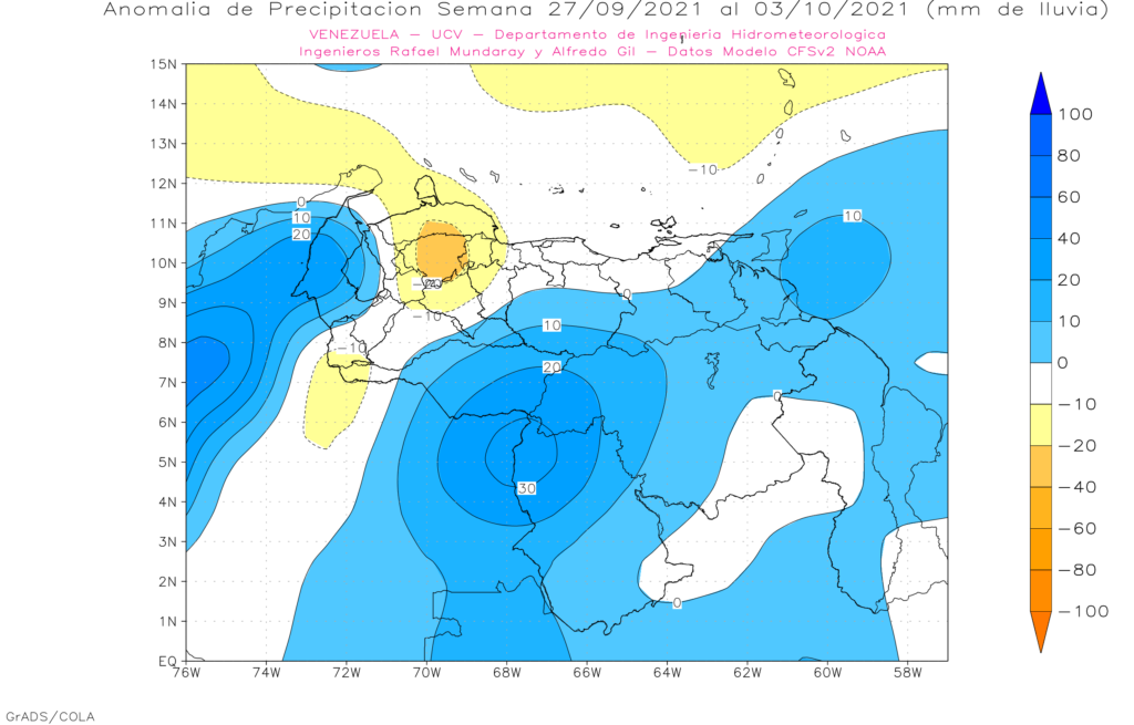 La semana del 27 de septiembre al 03 de octubre se prevé anomalías positivas al este de los estados Barinas y Apure, norte de Amazonas y oeste de Zulia. Anomalías negativas Falcón y Lara, le resto del país con lluvias promedio.