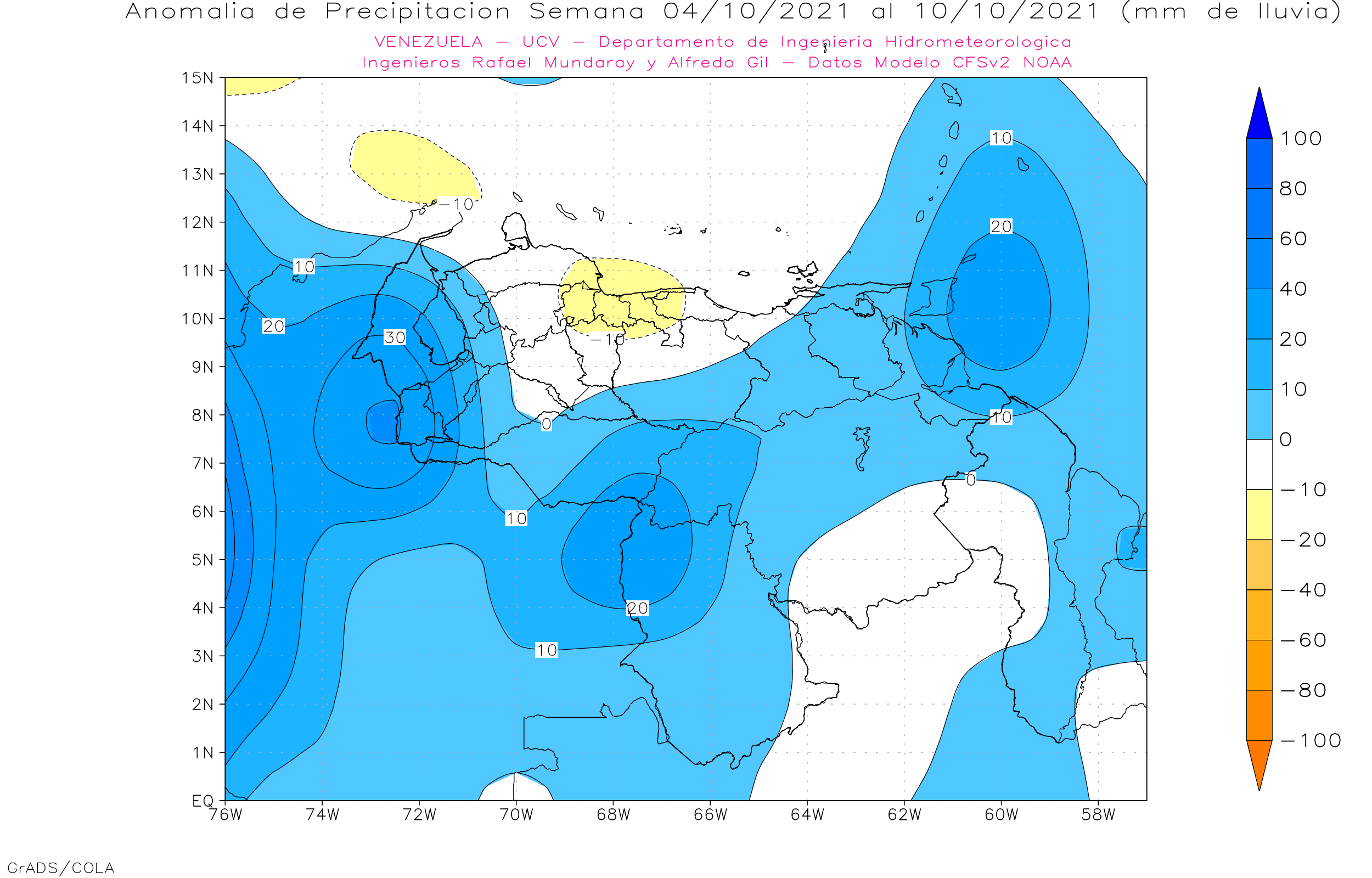 Pronostico de Anomalías Semanales para Venezuela, del 20/09 al 17/10 de 2021, usando datos del Modelo CFSv2 de NOAA y ECMWF.