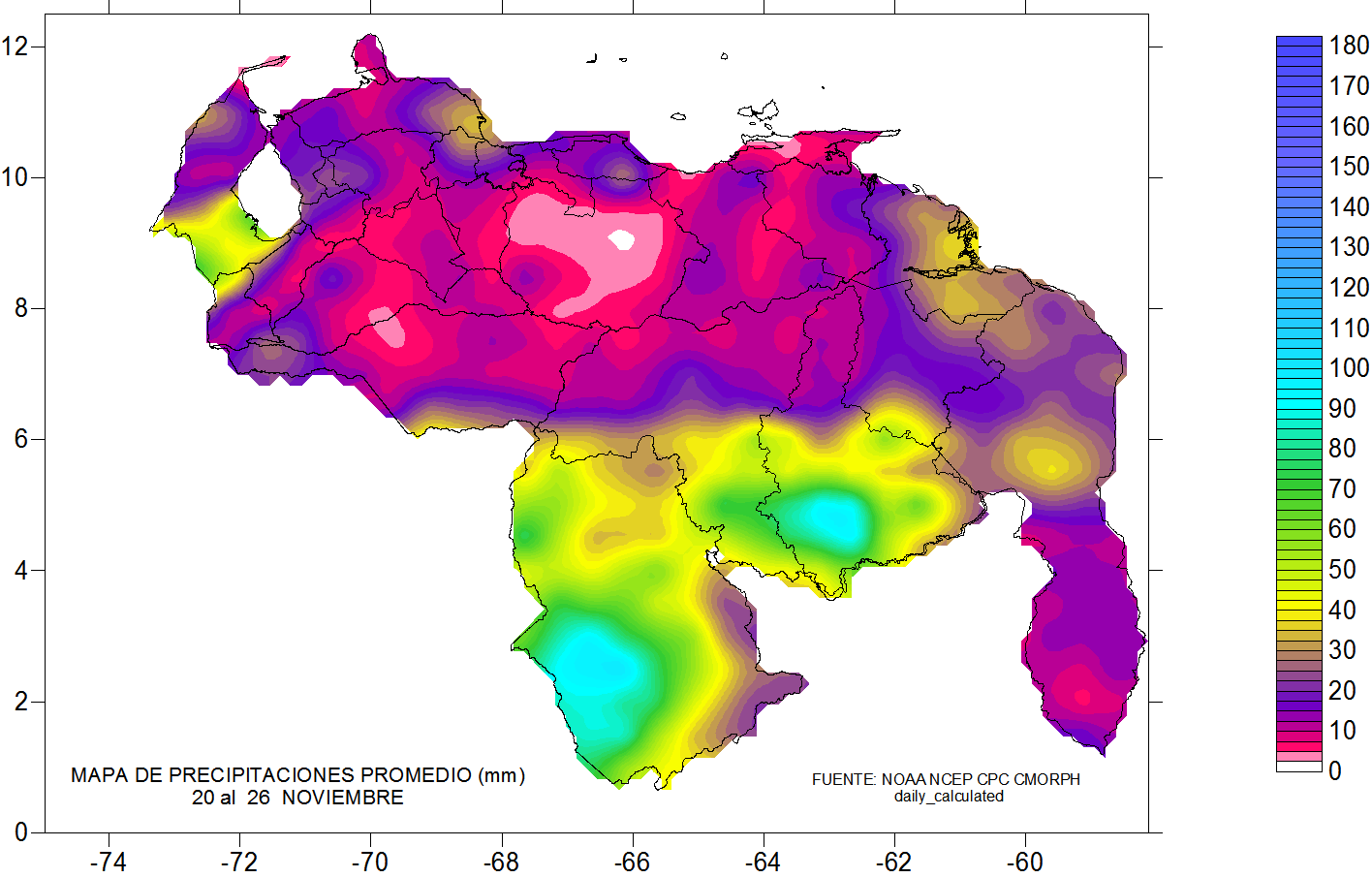 De acuerdo a la estadística de las precipitaciones estimadas para esta semana, se observa que los eventos más importantes se mantiene al sur del país y suroeste de Zulia. Ya se observa que las lluvias por encima de los 60 mm se ubican al sur de 5° norte, precipitaciones por debajo de los 20 mm al norte de 6° norte.