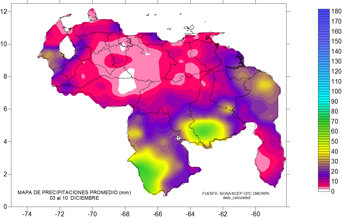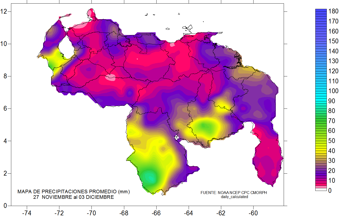De acuerdo a la estadística de la precipitación estimada ( NOAA NCEP CPC CMORPH, daily_calculated) durante el periodo del 20/11 al 17/12/2022, se observa que los principales eventos de precipitaciones ocurren al sur del país (Amazonas y Bolívar). Los eventos por encima de los 60 mm se ubican al sur de los 4° norte, vienes bajando los valores con respecto. a las semanas anteriores y los llanos centrales para la IV semana presenta precipitaciones promedio por debajo de los 5 mm.