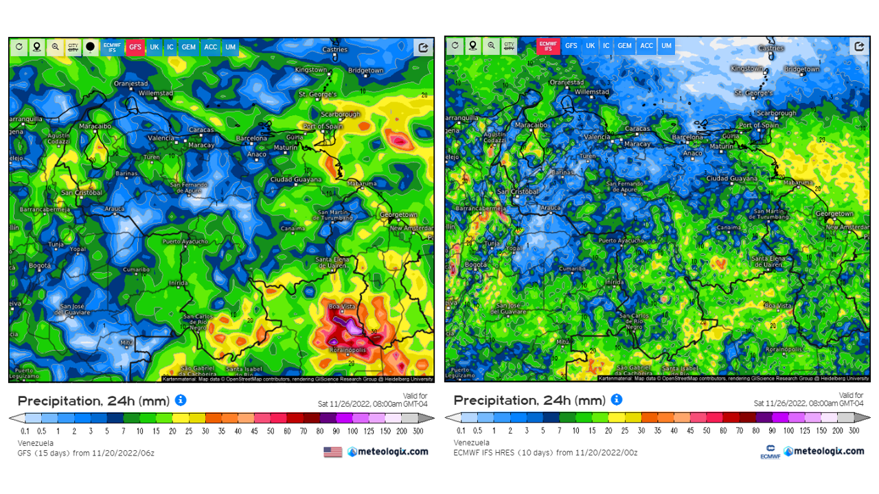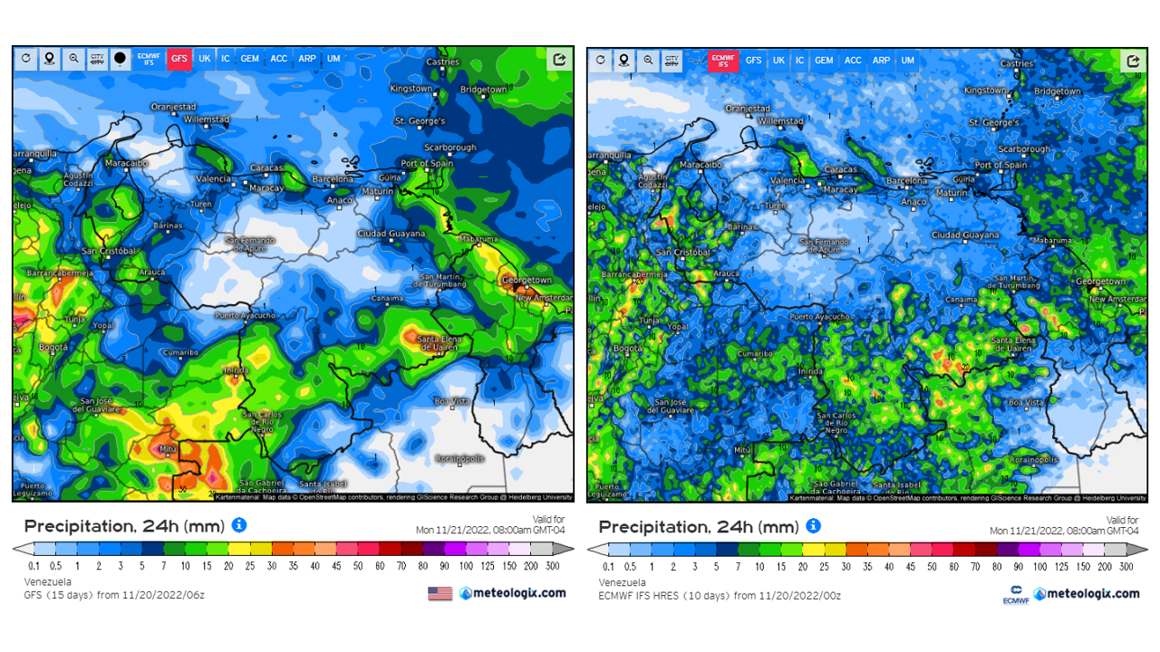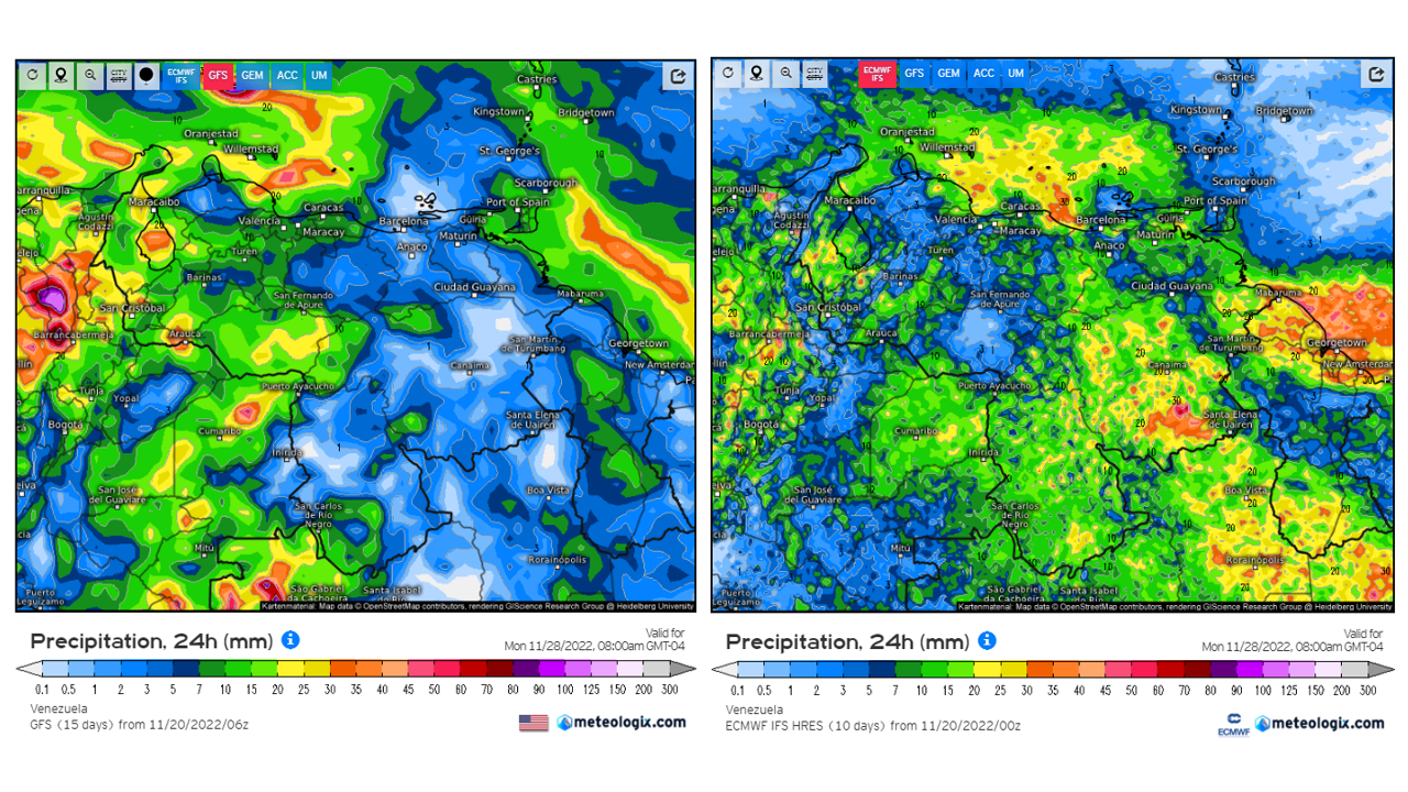 El modelo GFSv2 prevé en general eventos de precipitaciones dentro del promedio histórico en casi todo el territorio nacional. Las anomalías positivas mas importantes sobre oeste de estados Bolívar y este de Amazonas.