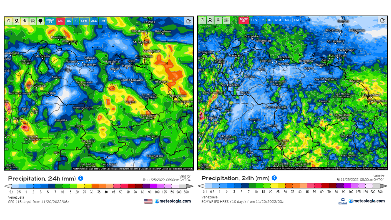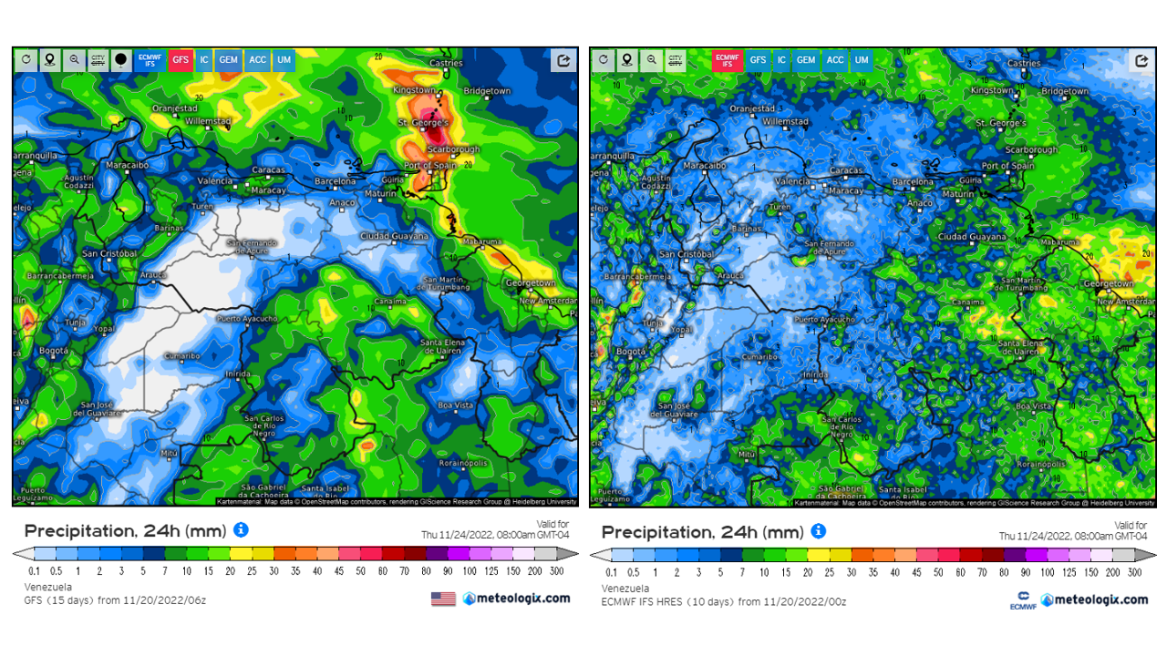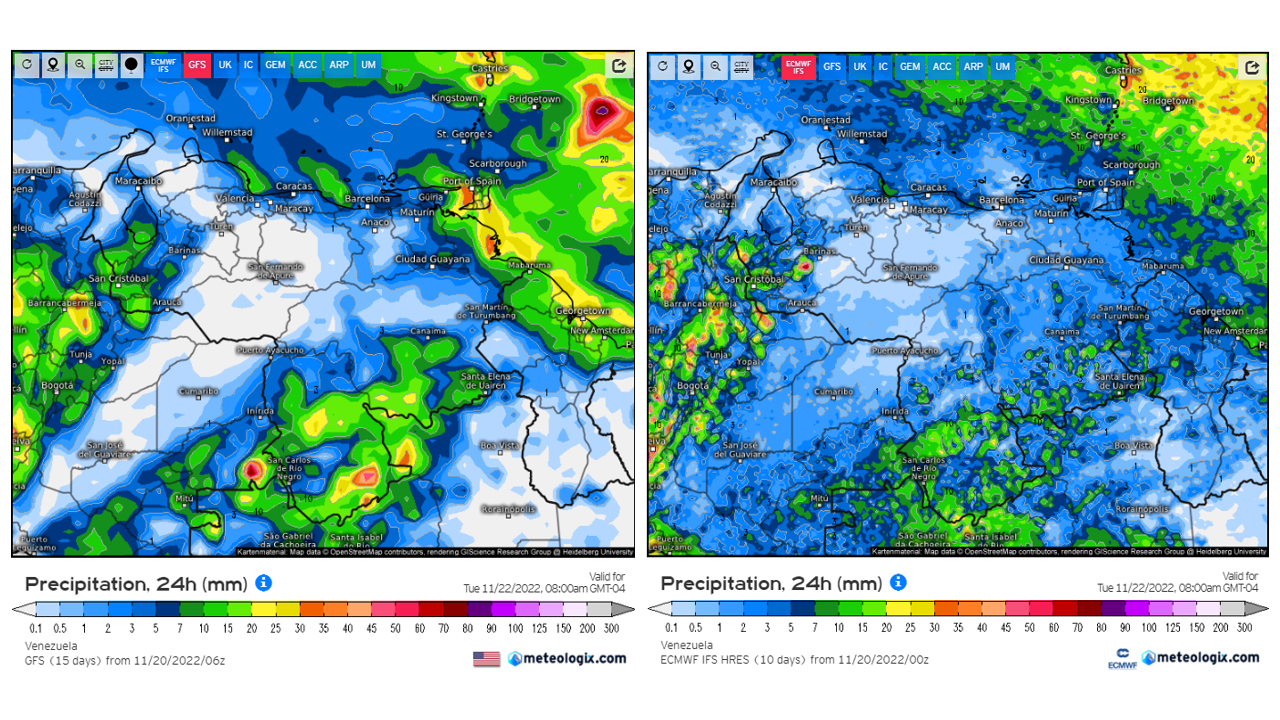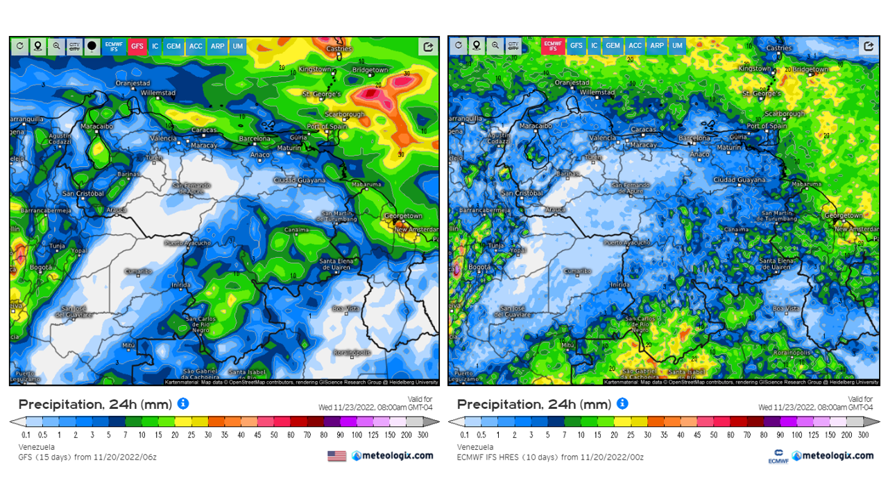 El modelo GFSv2 prevé en general eventos de precipitaciones dentro del promedio histórico en casi todo el territorio nacional. Las anomalías positivas mas importantes sobre oeste de estados Bolívar y este de Amazonas.