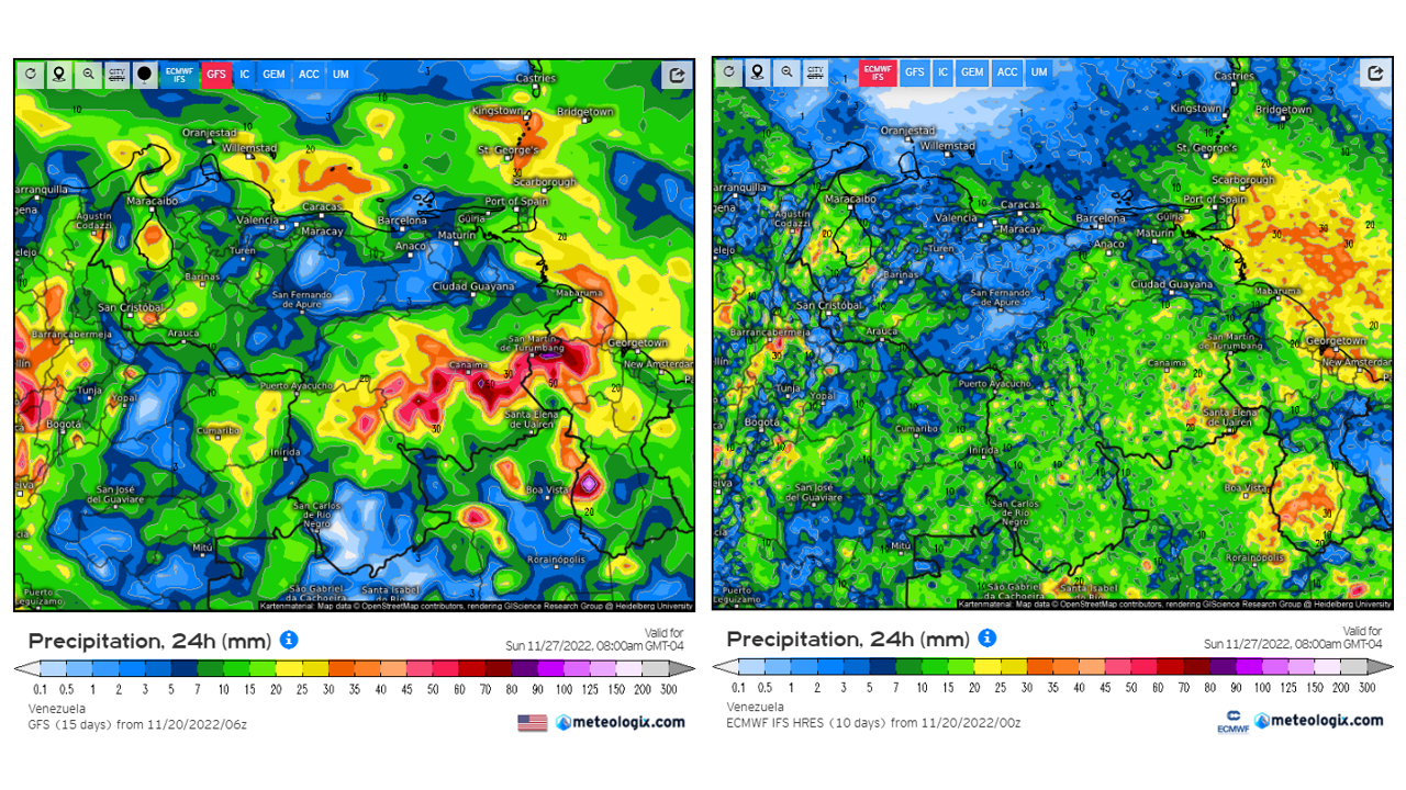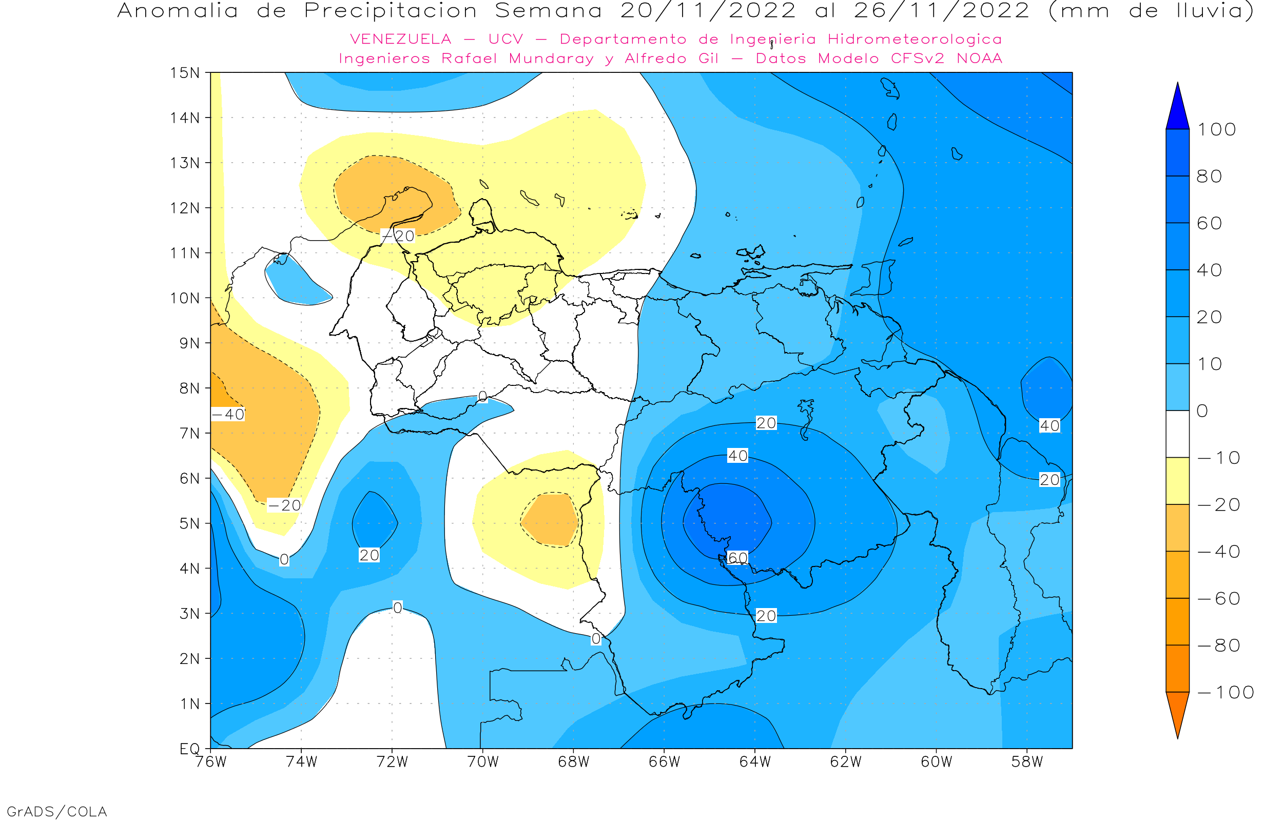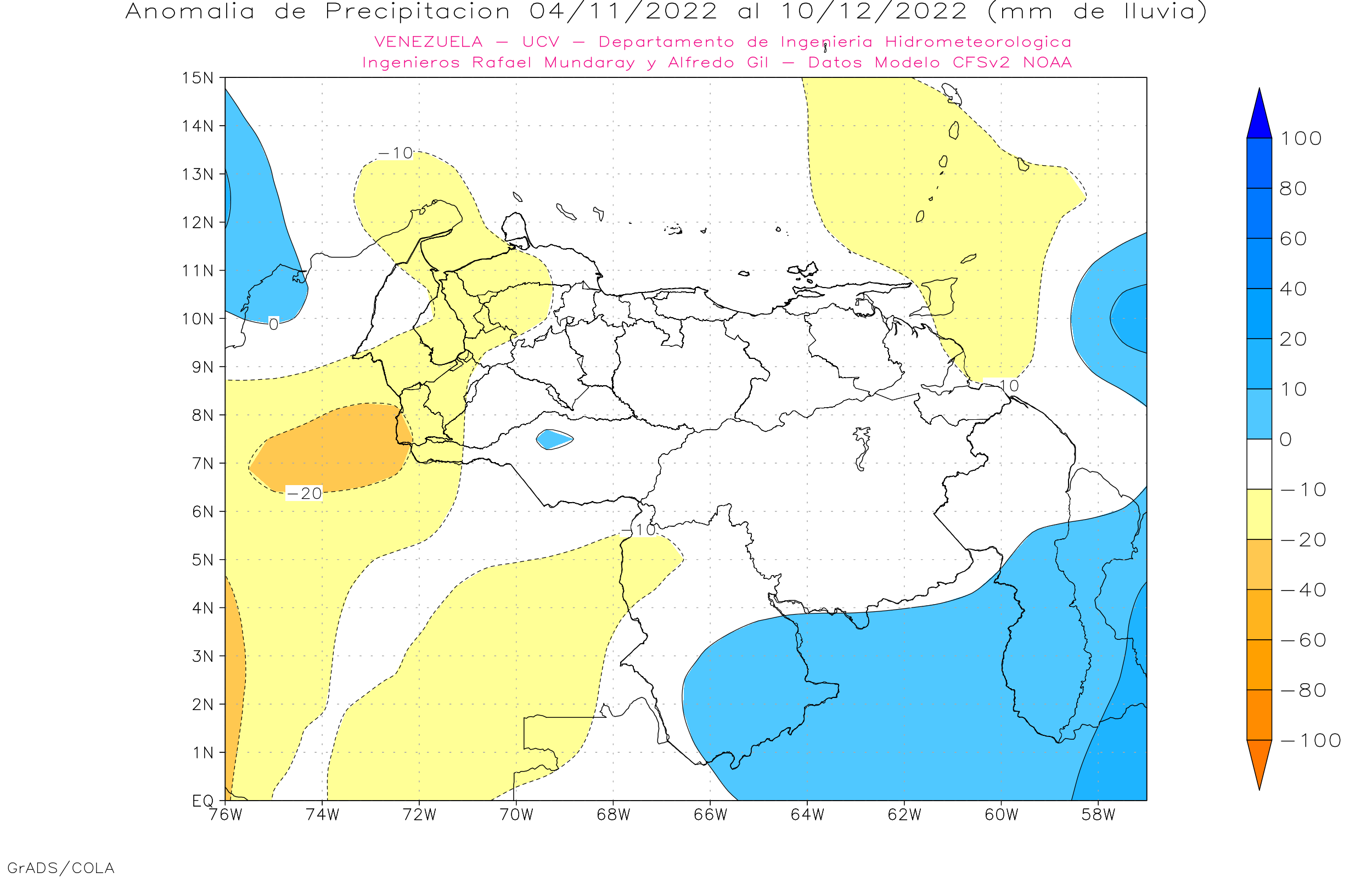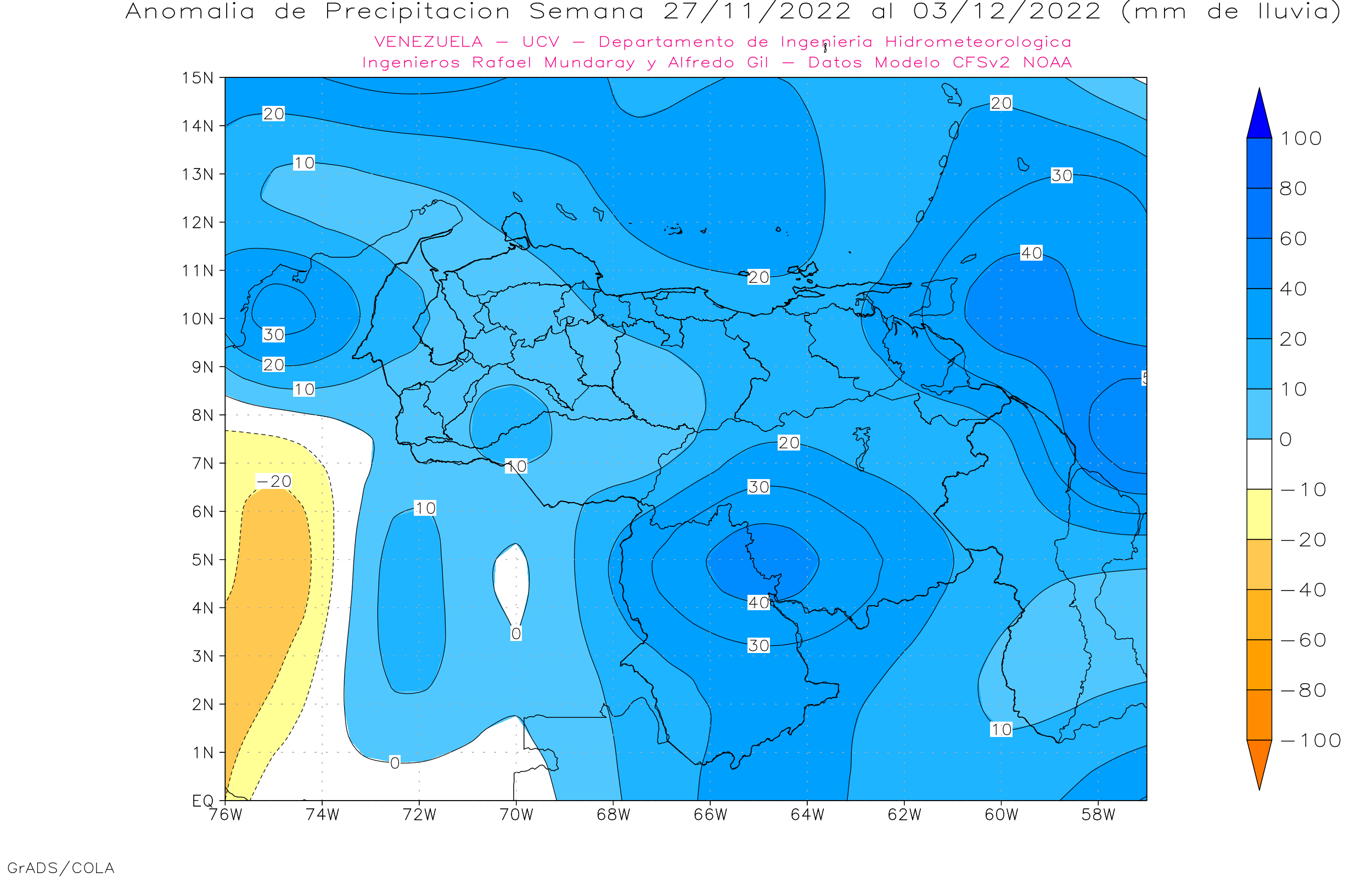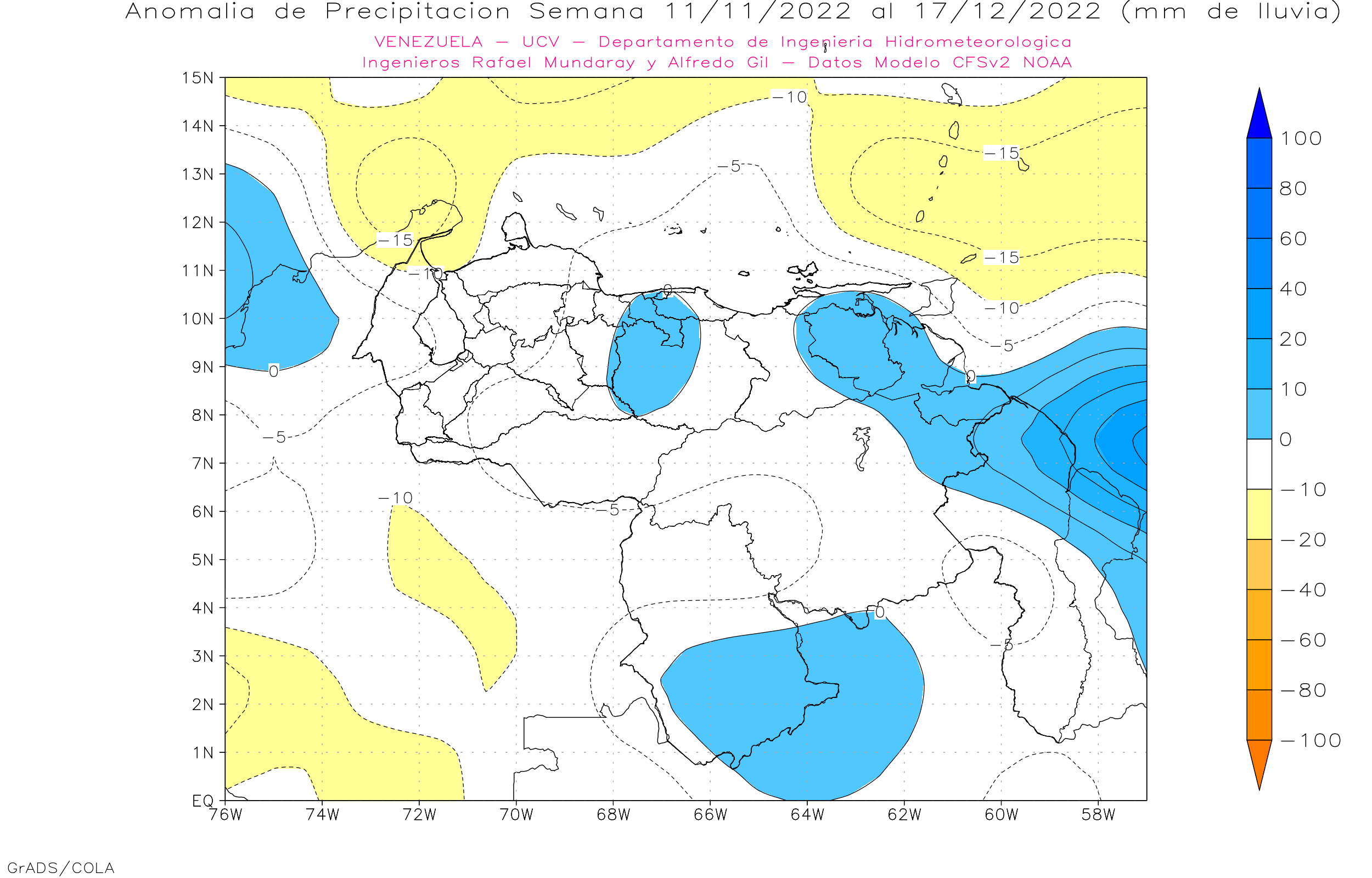 Pronostico de Anomalías Semanales para Venezuela, del 20/11 al 17/12/2022, usando datos del Modelo CFSv2 de NOAA y ECMWF.