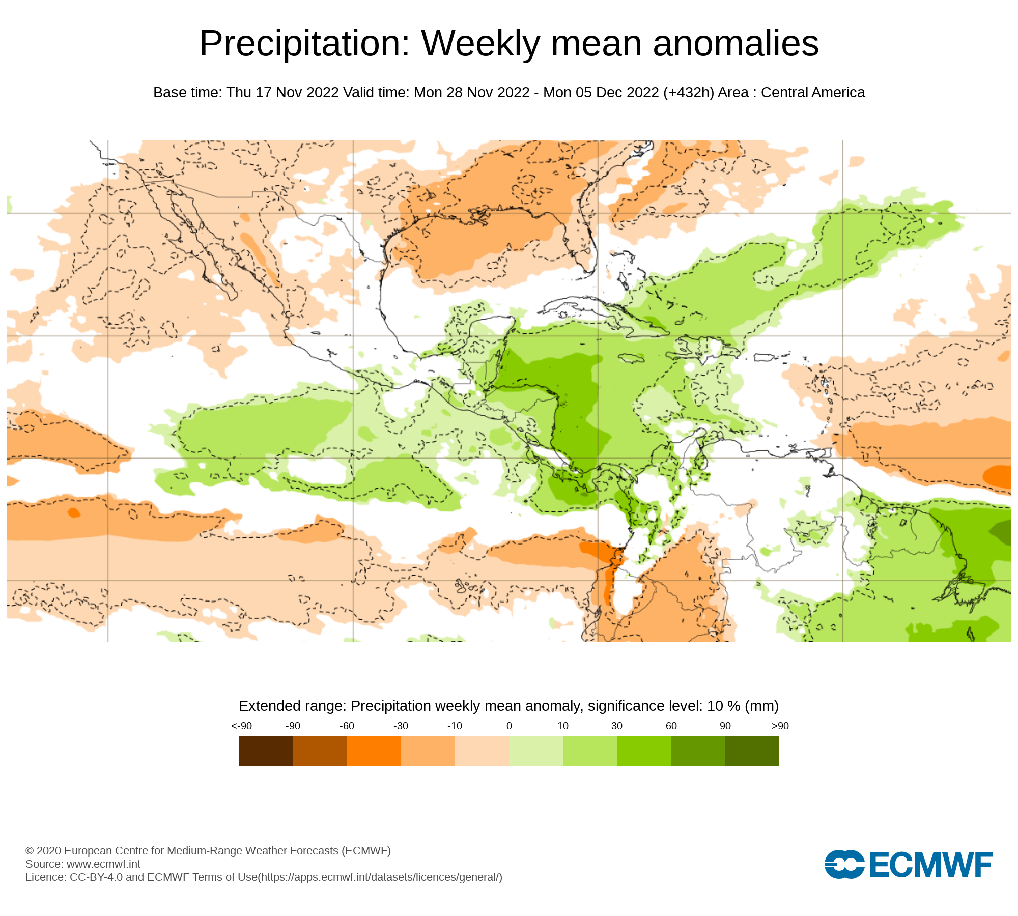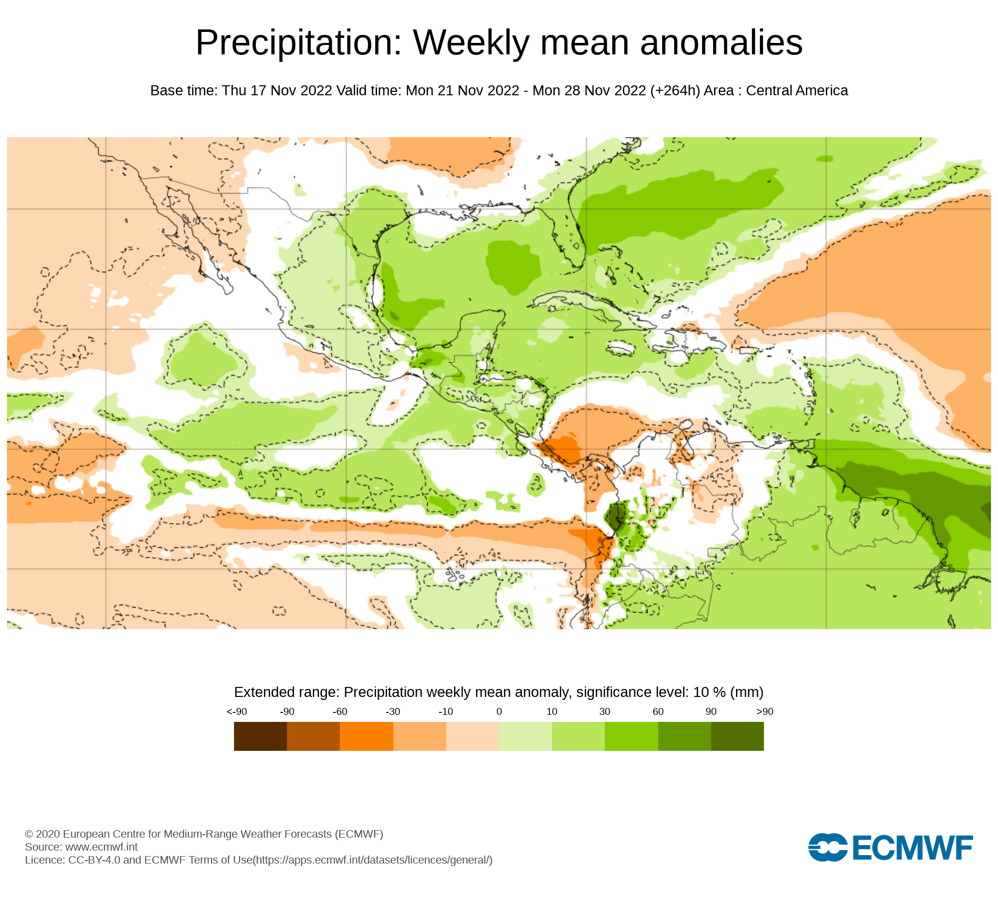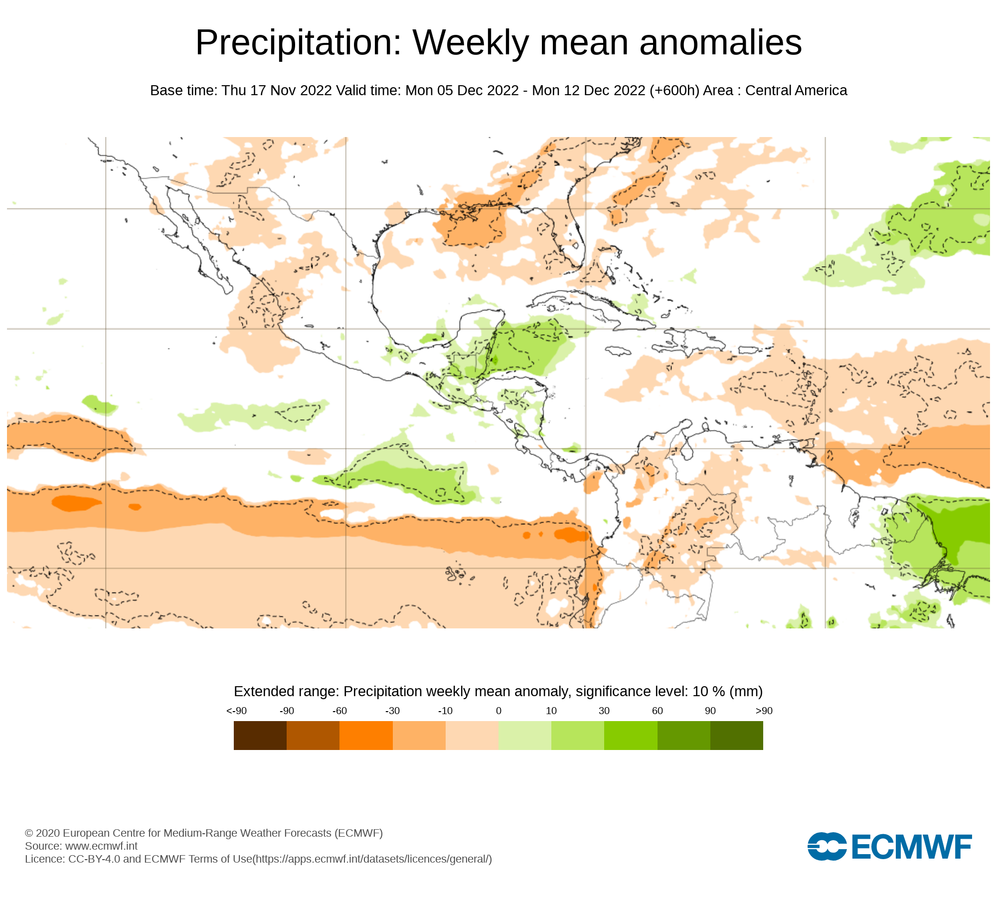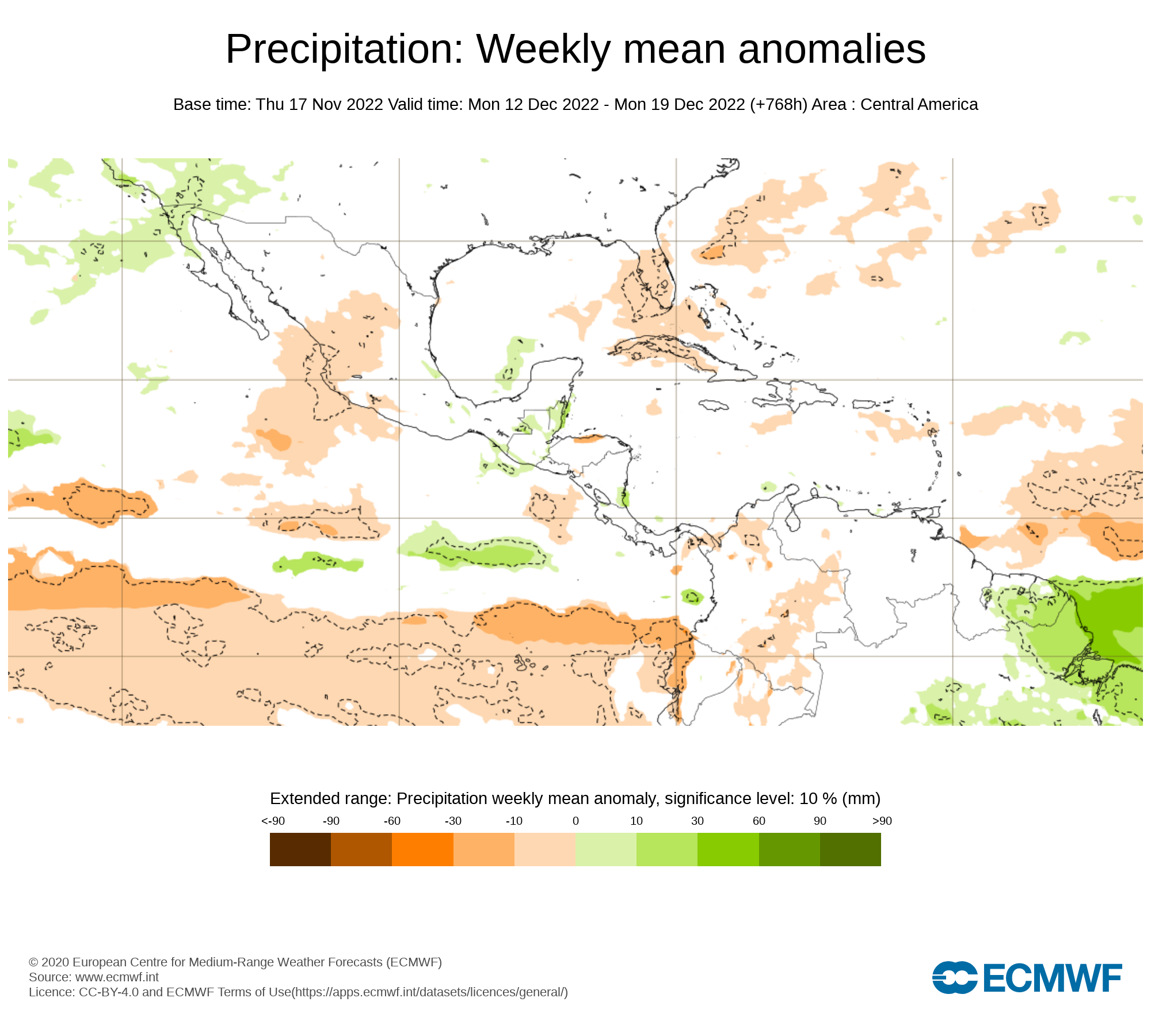 El pronostico semanal emitido por European Centre for Medium-Range Weather Forecast (ECMWF), se esperan eventos de precipitaciones promedio sobre el territorio nacional y las anomalías positivas mas importantes oriente y sur del país, anomalías negativa en los llanos occidentales y Zulia