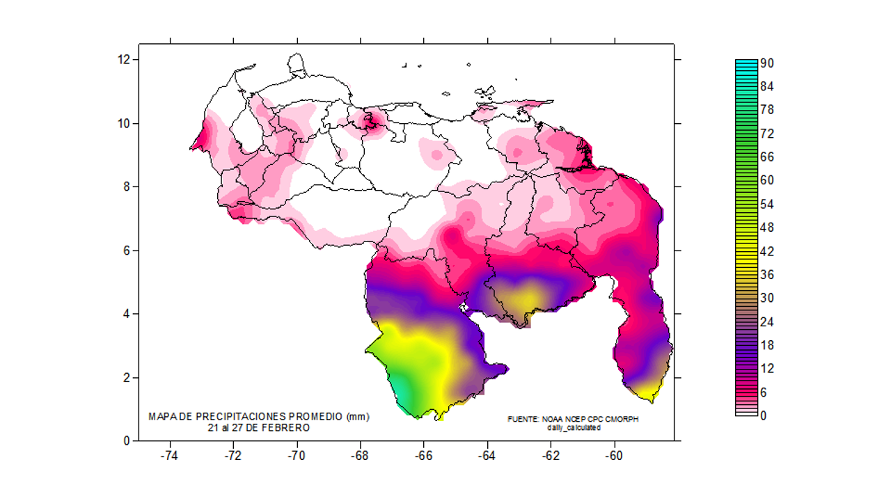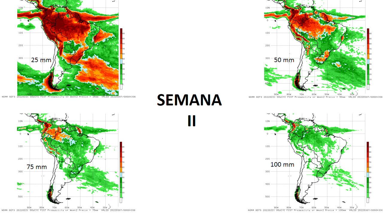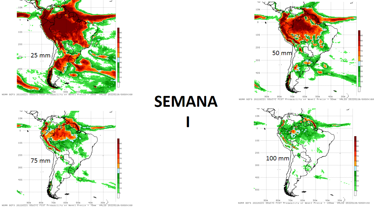 Las Probabilidades de excedencia total de precipitación para semana del 21 al 28 de febrero, superiores a 25, 50, 75 y 100 mm, se prevé las mayores probabilidades para eventos mayores de 25 mm Bolívar, Amazonas, Norte costero (incluyendo Nueva Esparte) y los andes, la mayor probabilidad de 50 mm sur de los estados Amazonas, Delta Amacuro y Bolívar, para eventos mayores de 75 y 100 mm las probabilidades se reducen y se observan puntos importantes al sur de Bolívar.