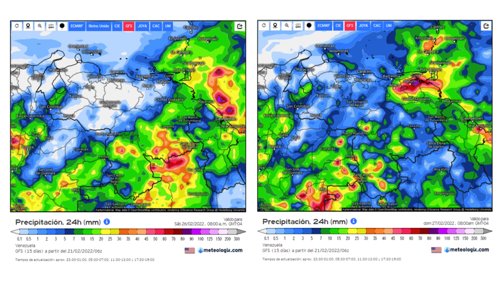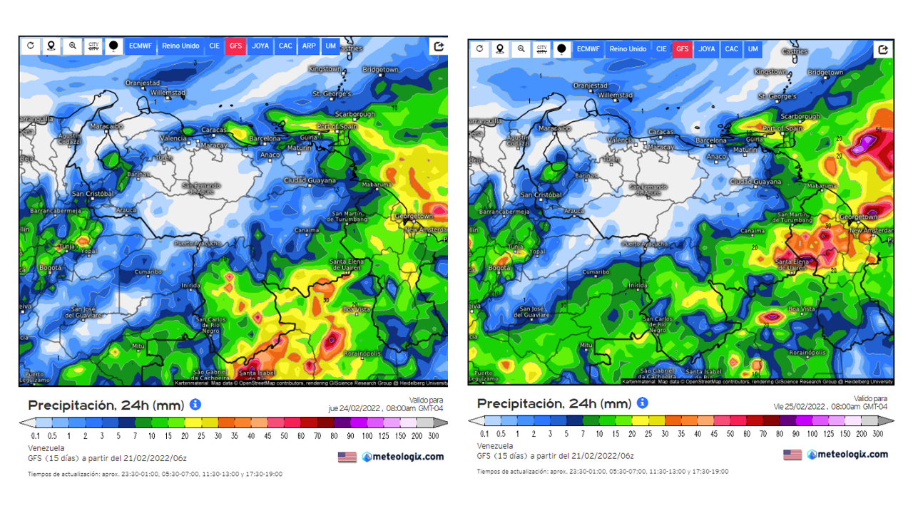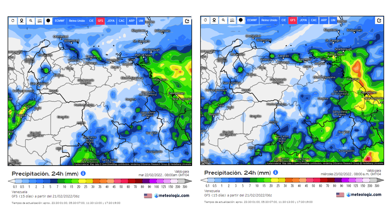 El modelo GFSV2 prevé en general eventos de precipitaciones dentro del promedio histórico y positivas en Bolívar, Delta Amacuro Y este de Monagas