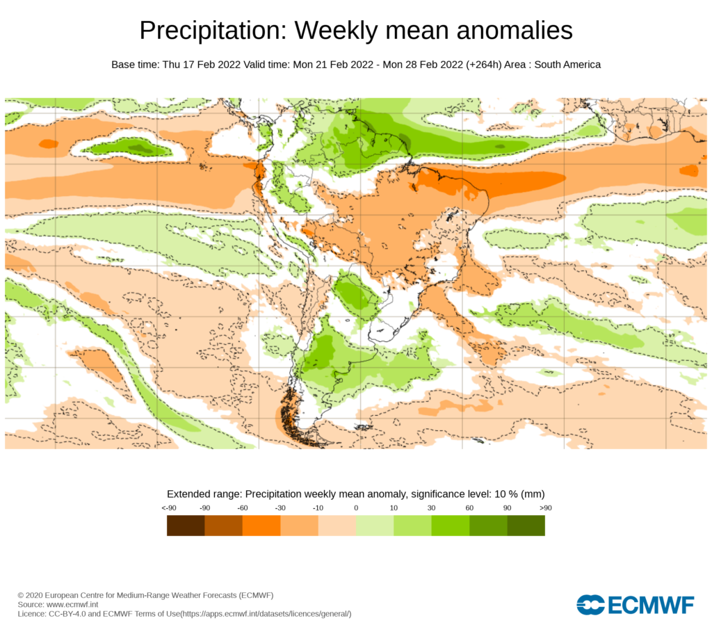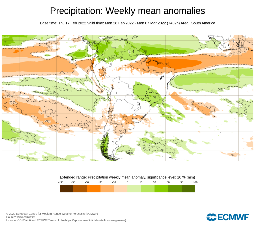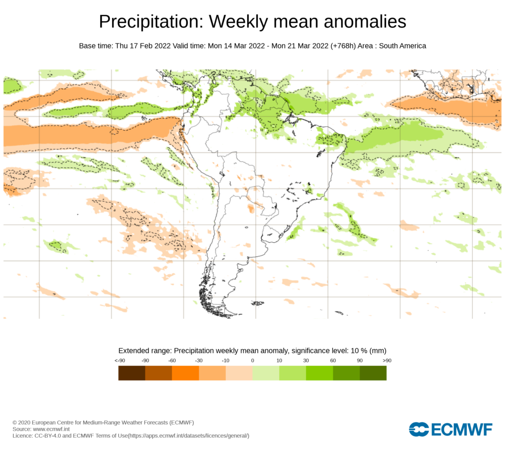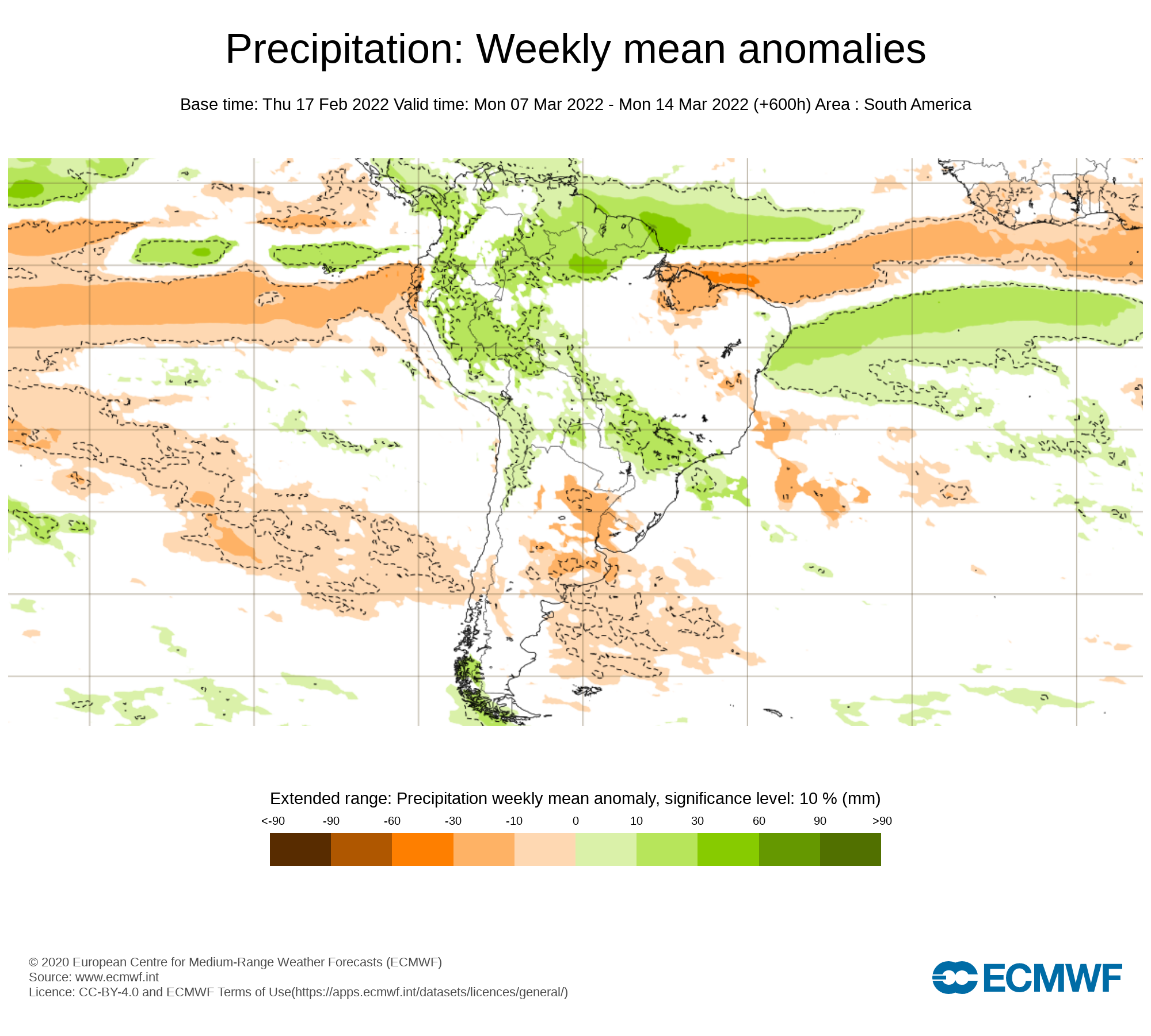 PRONOSTICO DE ANOMALÍAS SEMANALES DE PRECIPITACIÓN DEL 21/02 AL 20/03/22