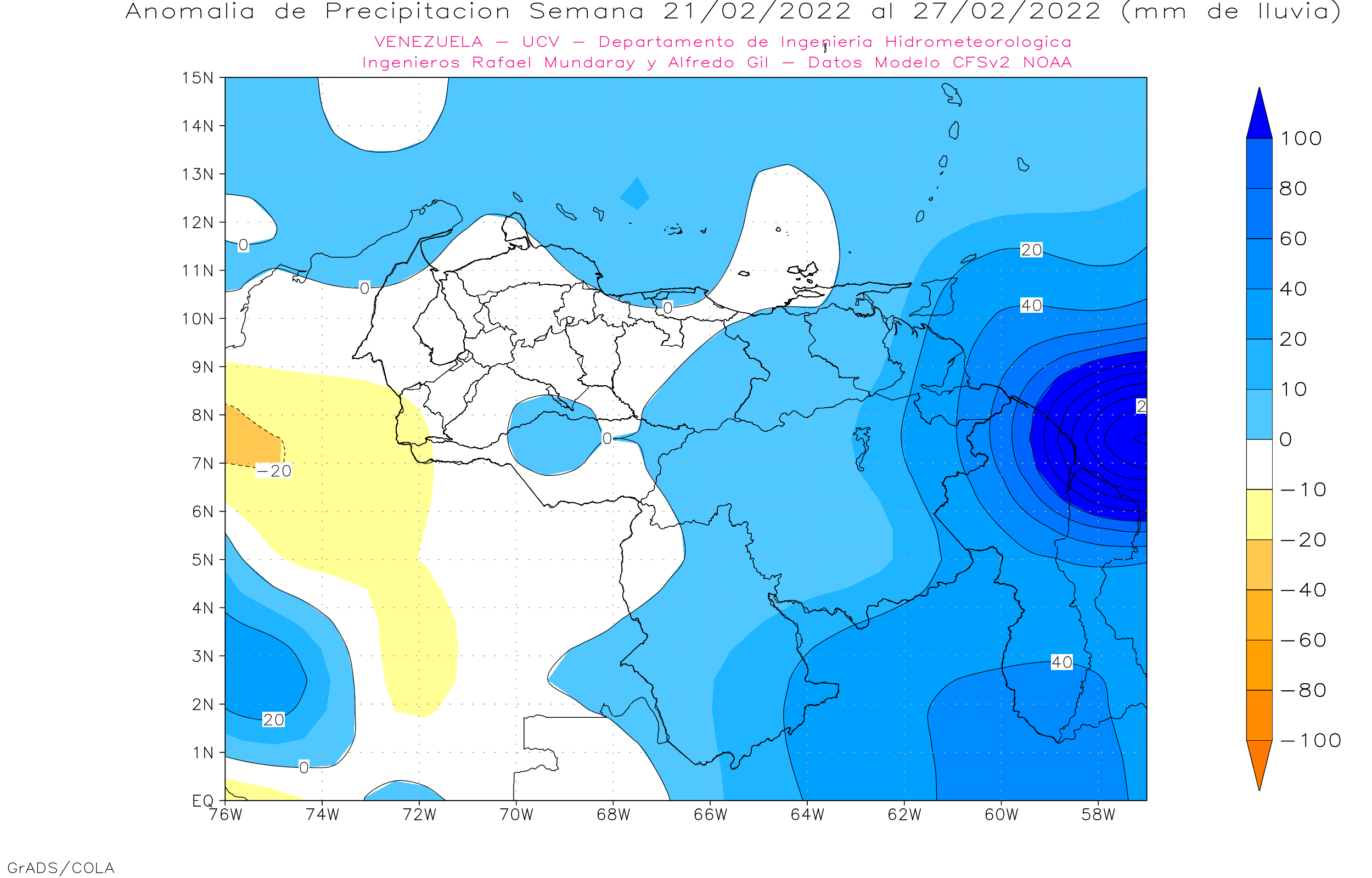 Pronostico de Anomalías Semanales para Venezuela, del 21/02 al 20/03/22, usando datos del Modelo CFSv2 de NOAA y ECMWF.