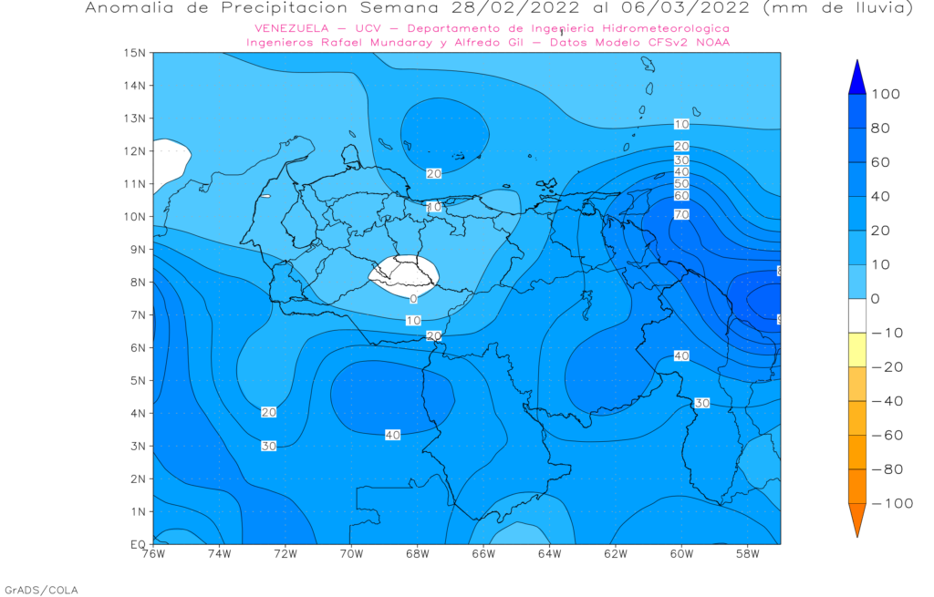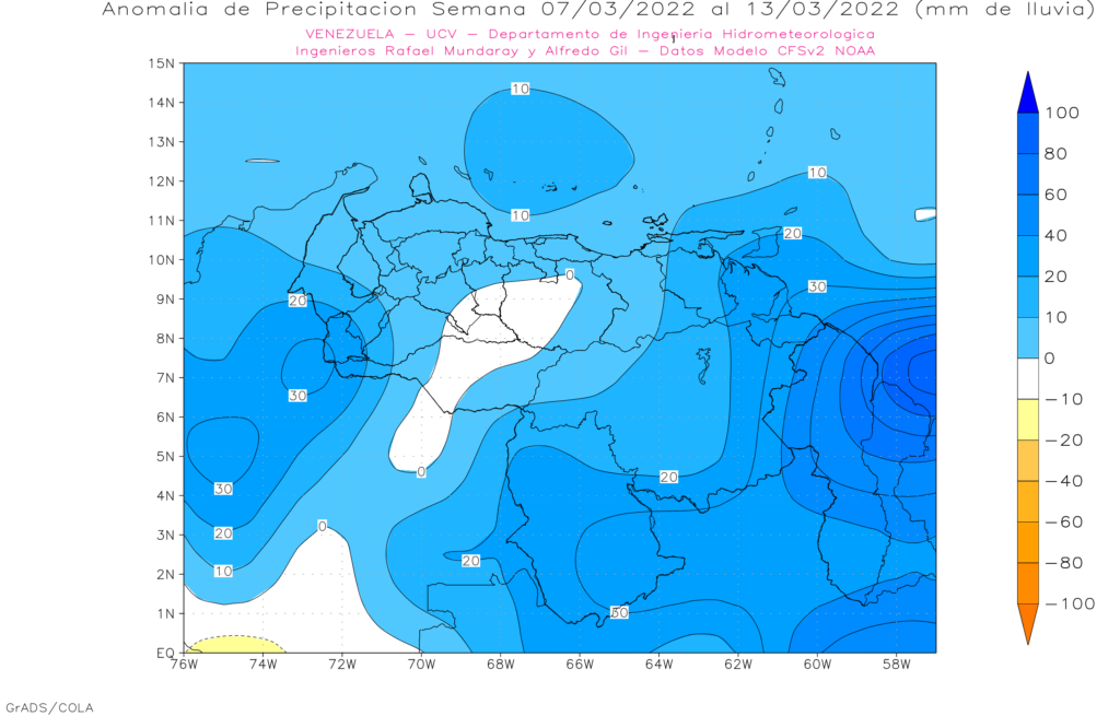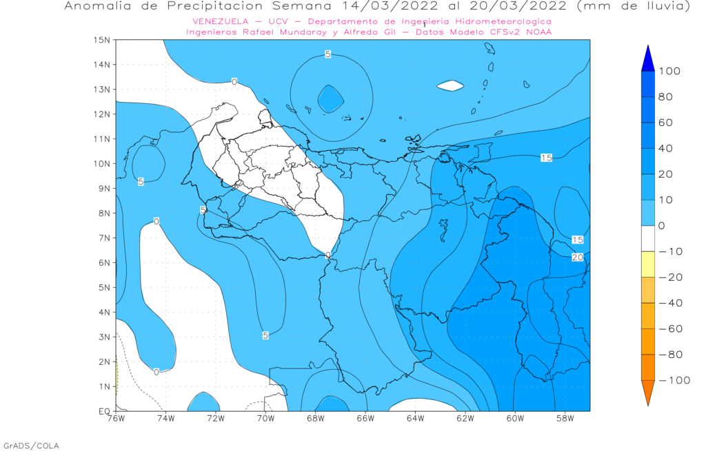 El pronostico semanal emitido por European Centre for Medium-Range Weather Forecast (ECMWF), se esperan con anomalías positivas en casi todo el territorio nacional, las mas importantes Oriente del páis, Bolívar y sur de Amazonas, oeste de Zulia, a lo largo de laregión norte costera, Nuevas Esparta y los andes.