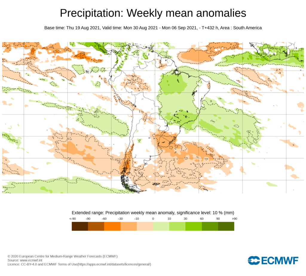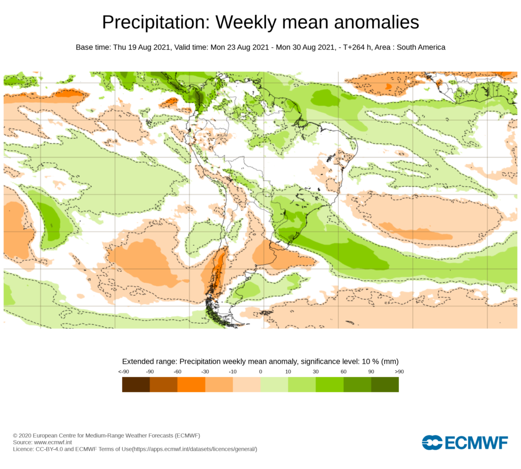 PRONOSTICO DE ANOMALÍAS SEMANALES DE PRECIPITACIÓN DEL 23/08 AL 19/09 DE 2021