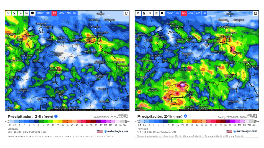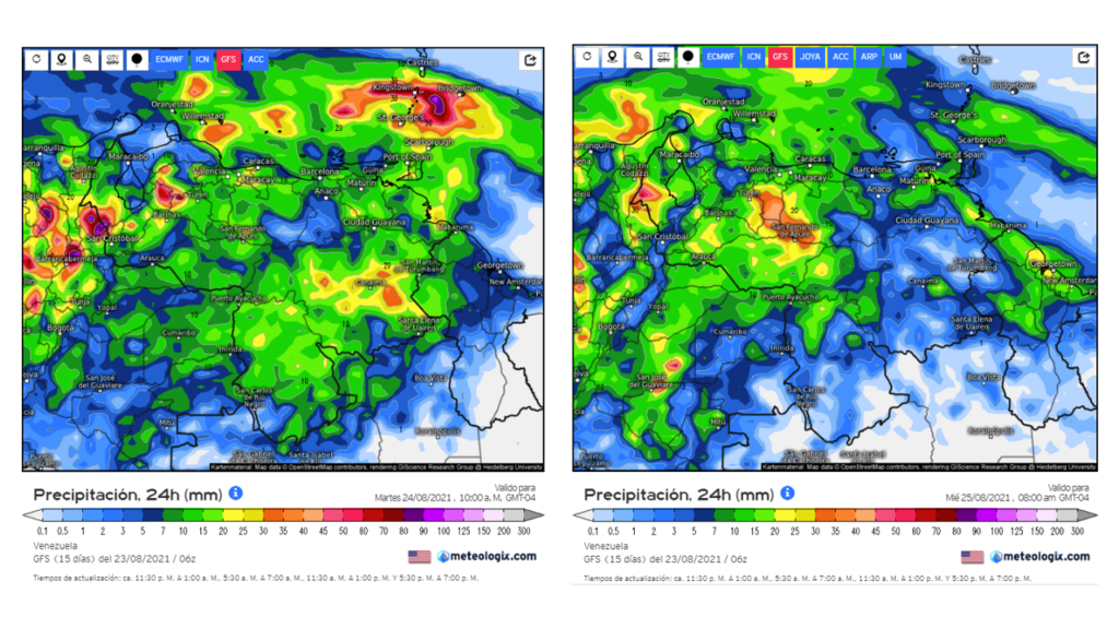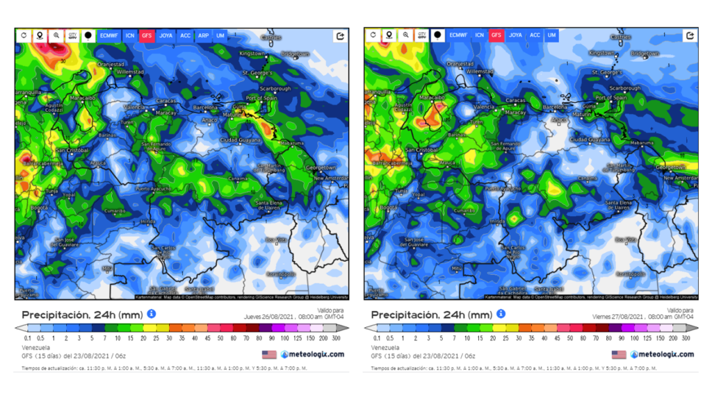En el pronostico diario del modelo GFS del 23 al 30 de agosto, los principales eventos se prevé que los principales eventos de precipitaciones ocurran a principio de semana en casi todo el territorio nacional, debe ser el pasaje de una onda tropical. Al final de la semana se espera una reactivación de las precipitaciones al sur, Zulia y oriente del país.