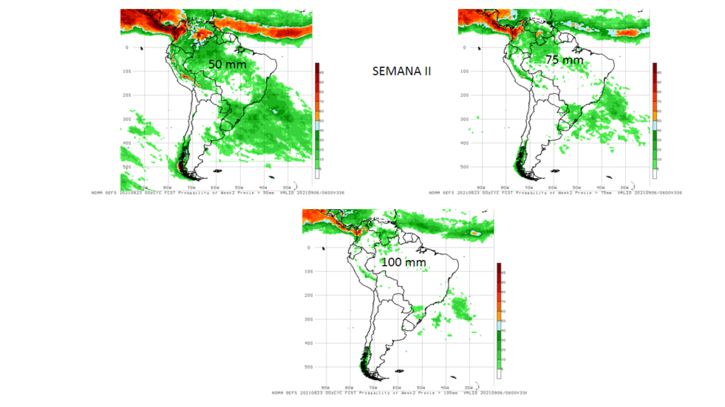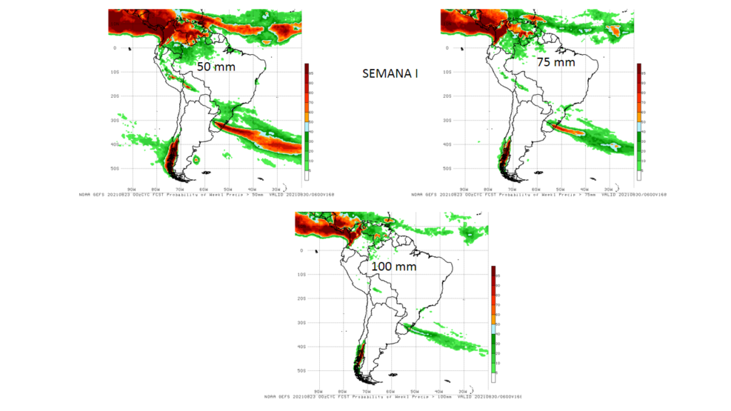 Las Probabilidades de excedencia total de precipitación para semana del 30 de agosto al 06 de septiembre, superiores a 50, 75 y 100 mm, se prevé las mayores probabilidades se ubican al sur del país.