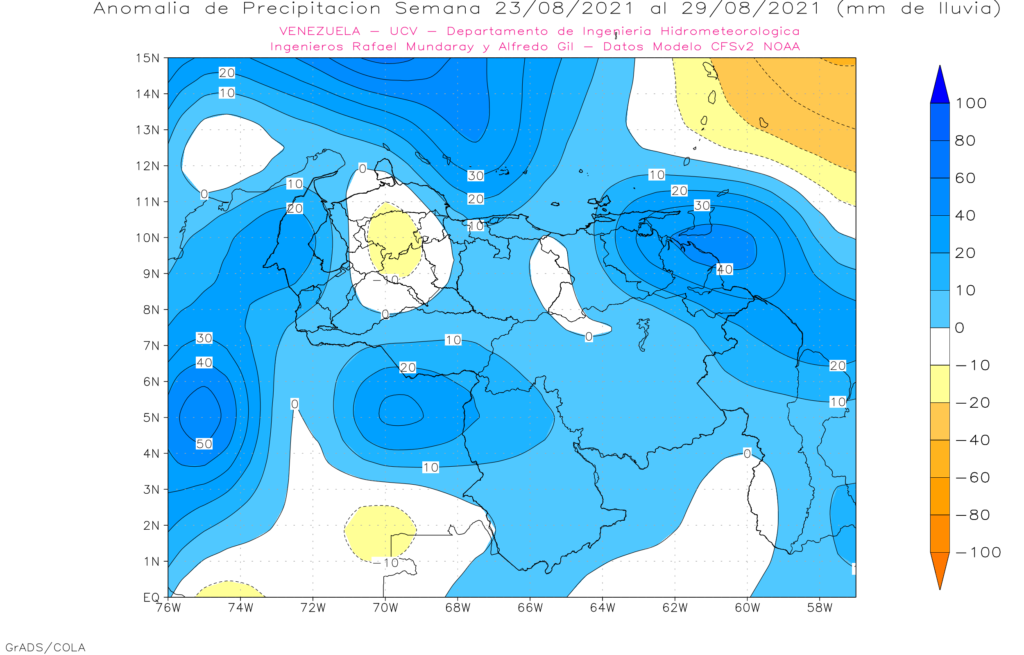 En la semana del 23 al 29 de agosto se prevé anomalías positivas en casi todo el territorio nacional, las más importantes se esperan en Delta Amacuro, Sucre y Zulia.