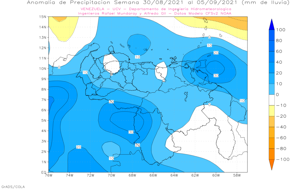 La semana del 30 de agosto al 05 de septiembre se prevé anomalías positivas en casi todo el territorio nacional, las mas importantes en Delta Amacuro y Norte de Amazonas.
