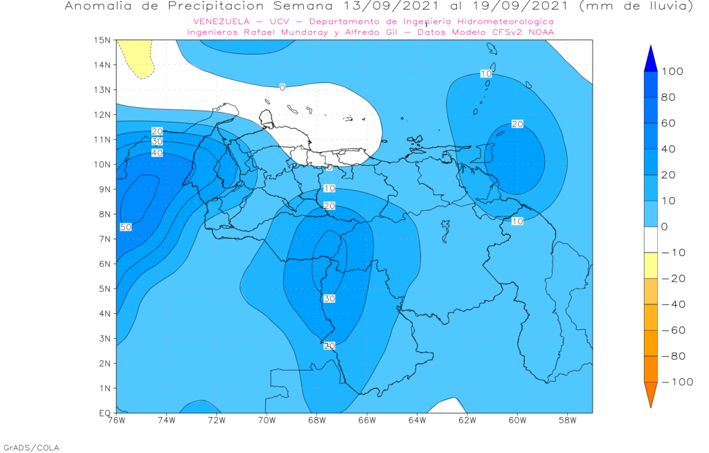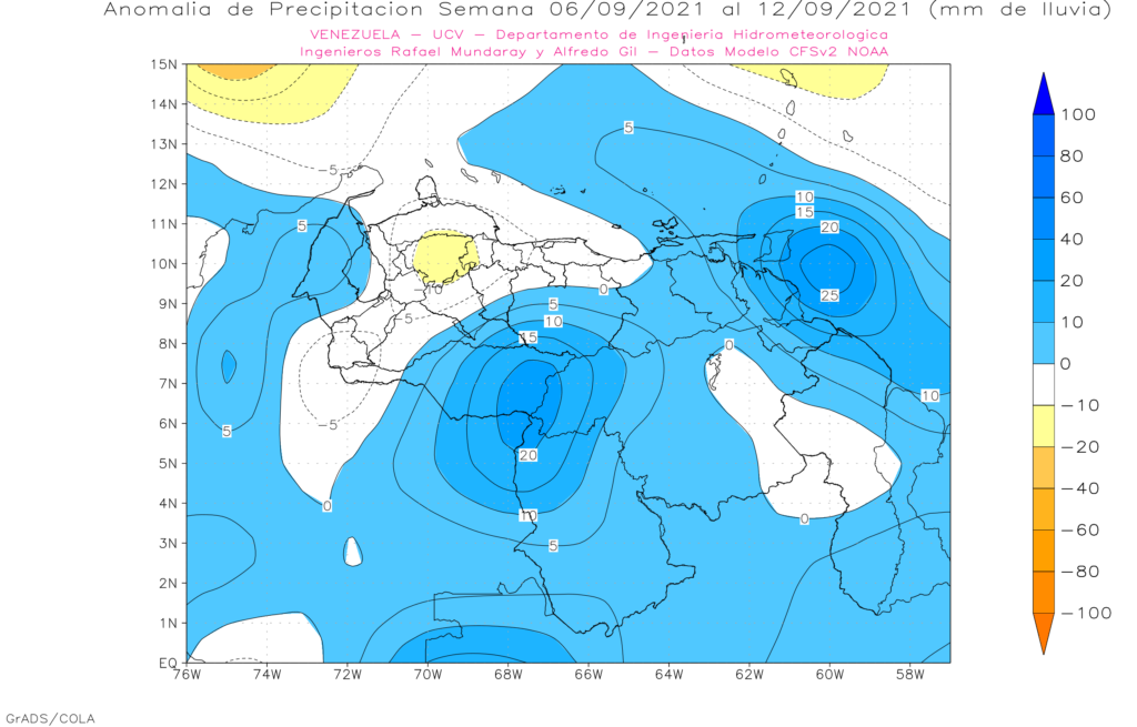 Pronostico de Anomalías Semanales para Venezuela, del 23/08 al 19/09 de 2021, usando datos del Modelo CFSv2 de NOAA y ECMWF.