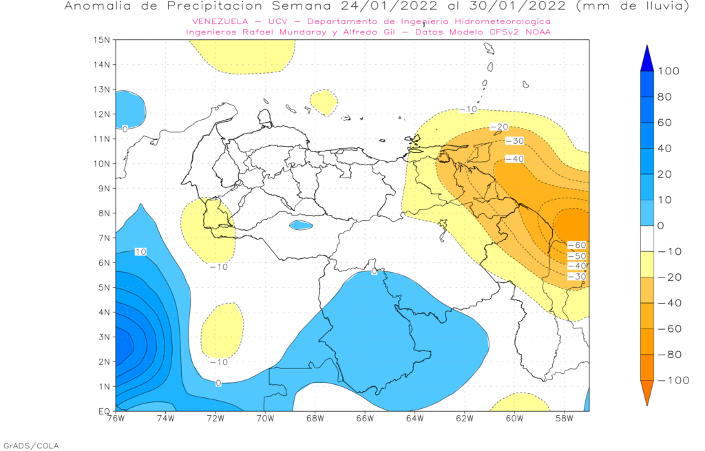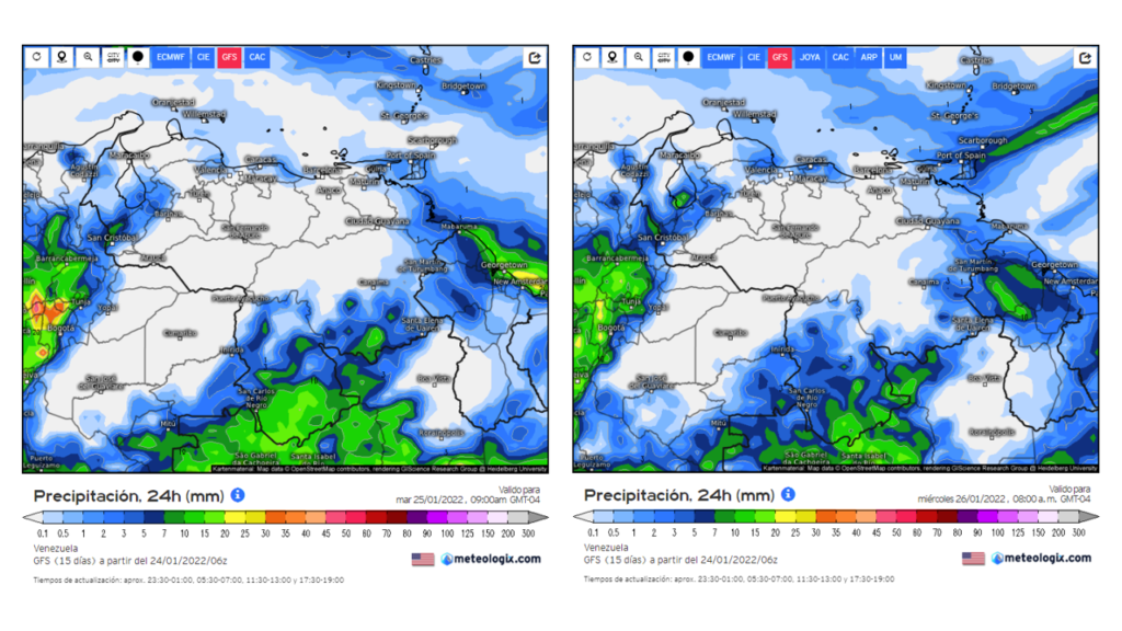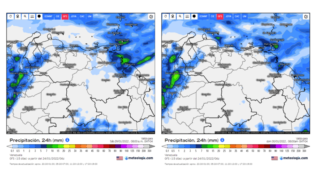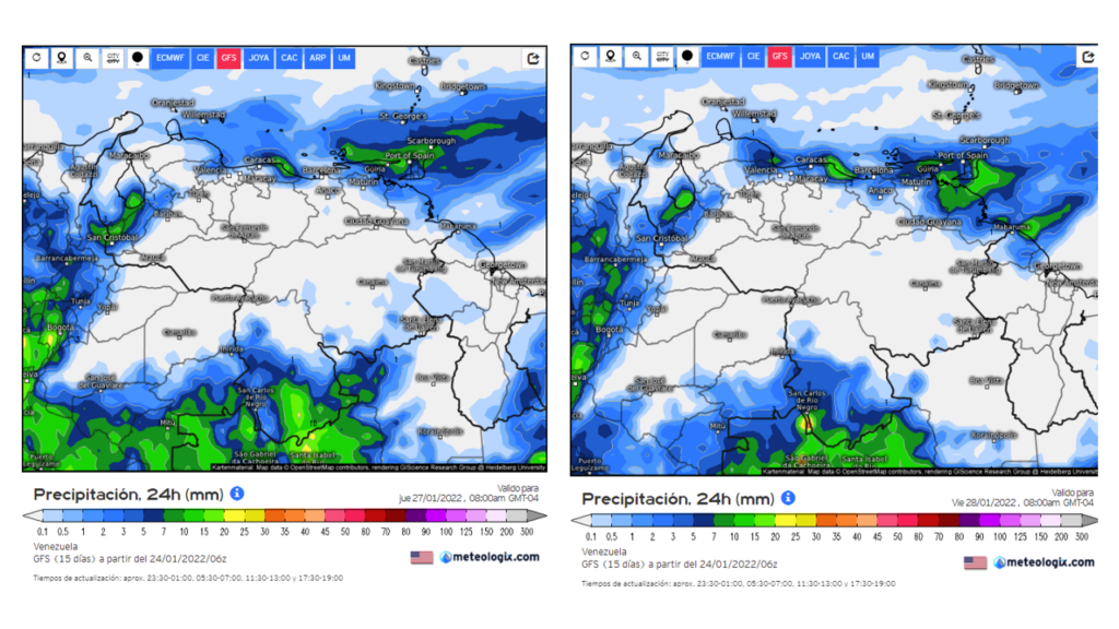 En el pronostico diario del modelo GFS del 24 al 30 de enero, se observan escasos eventos de precipitaciones en el transcurso de la semana, algunos eventos al sur del lago de Maracaibo, sur de Amazonas, los andes, a lo largo de la región norte costera y Delta Amacuro.