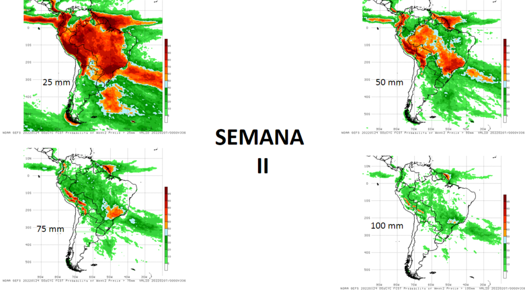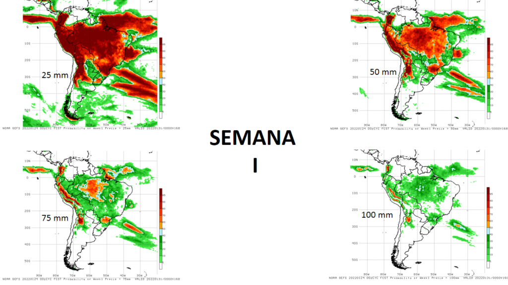 Las Probabilidades de excedencia total de precipitación para semana del 31 de enero al 07 de febrero, superiores a 25, 50, 75 y 100 mm, se prevé las mayores probabilidades para eventos mayores de 25 mm Bolívar, Amazonas, los andes y Delta Amacuro, la mayor probabilidad de 50 mm sur de los estados Amazonas y Bolívar, para eventos mayores de 75 y 100 mm las probabilidades se reducen y no se observan puntos importantes.