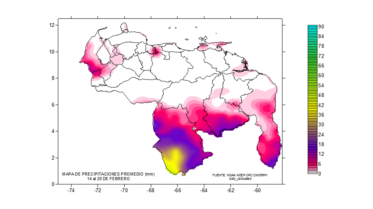 De acuerdo a la estadística de la precipitación estimada ( NOAA NCEP CPC CMORPH, daily_calculated) durante el periodo del 24/01 al 22/02/22, se observa que los principales eventos de precipitaciones ocurren al sur del país (Amazonas y sur de Bolívar), algunos eventos dispersos en el resto del país.