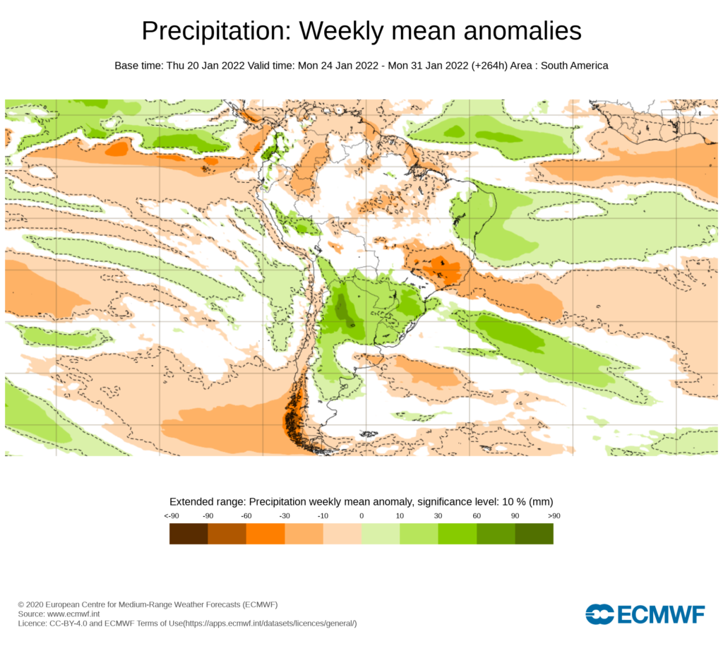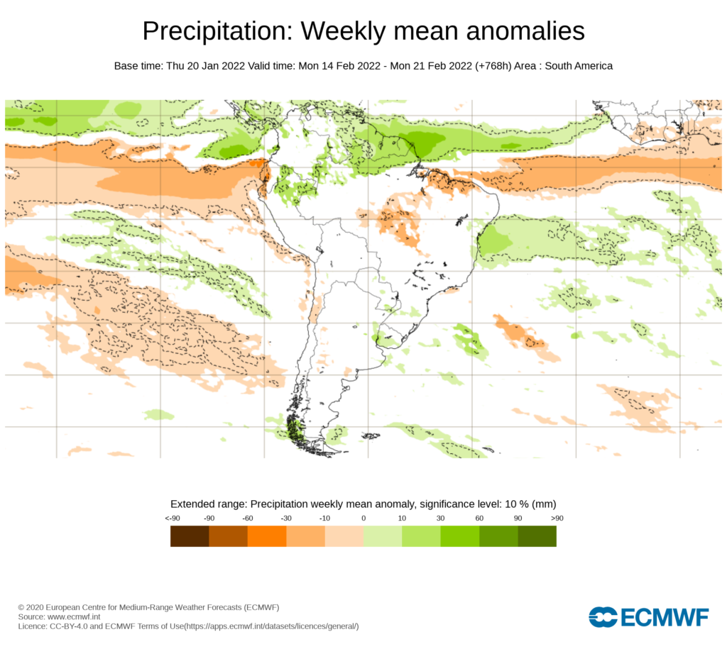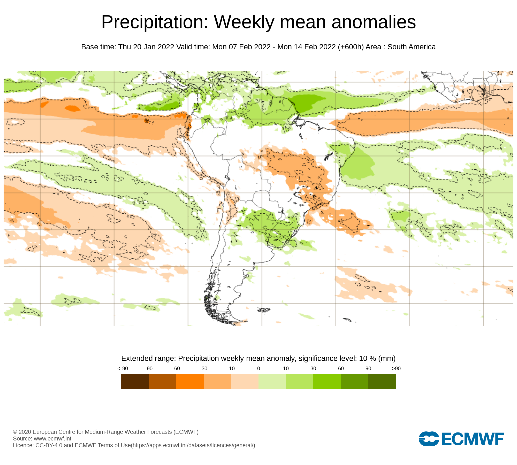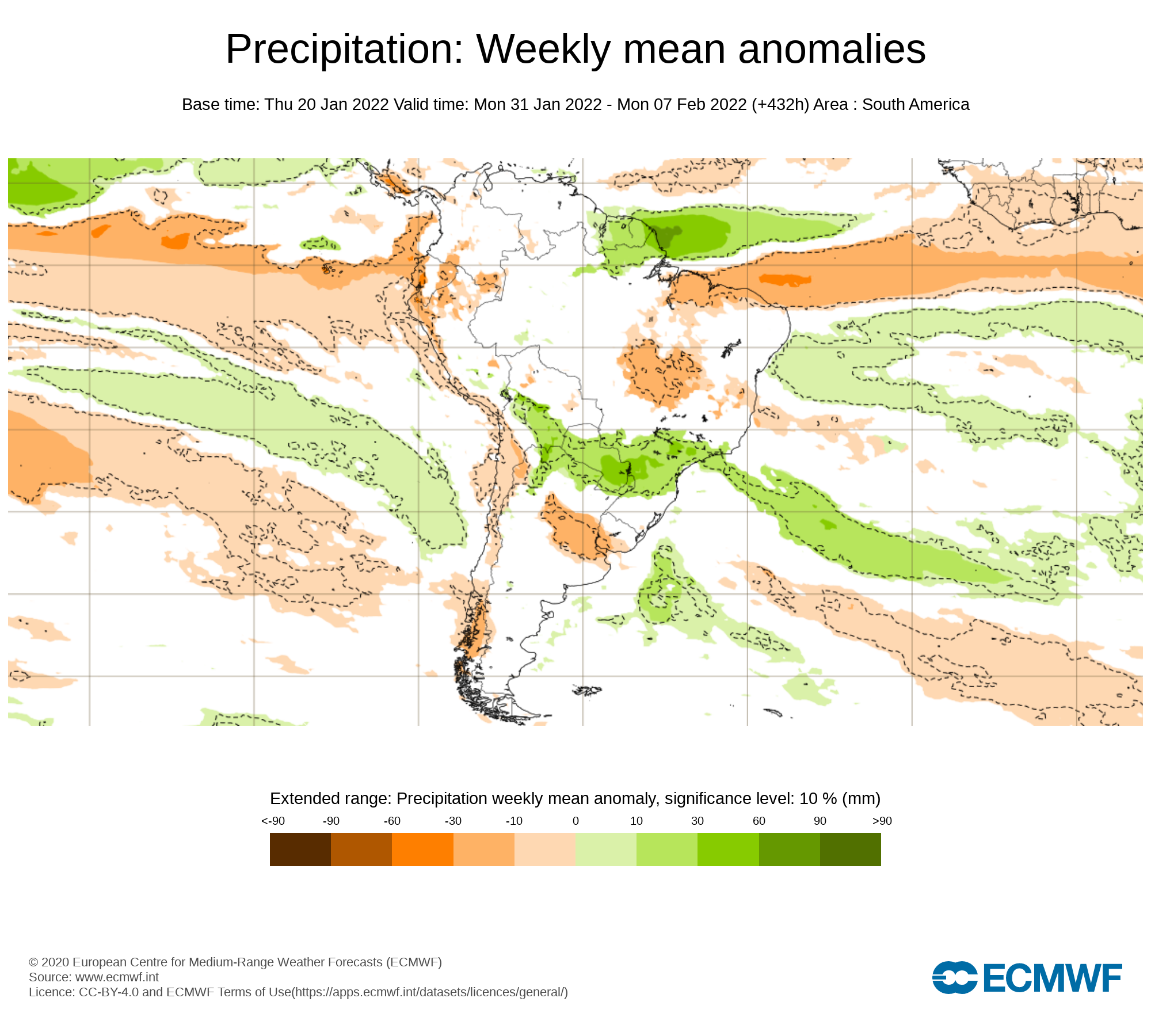 El pronostico semanal emitido por European Centre for Medium-Range Weather Forecast (ECMWF), se esperan precipitaciones dentro del promedio histórico.